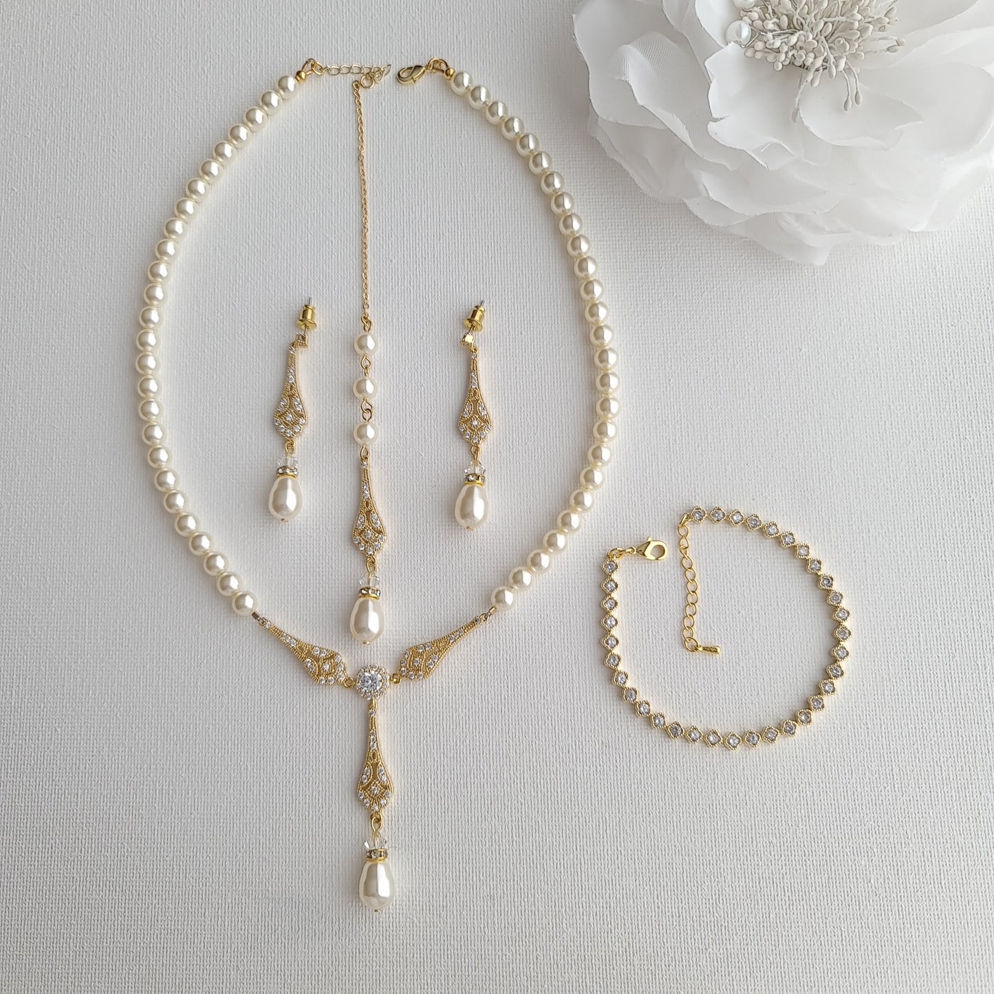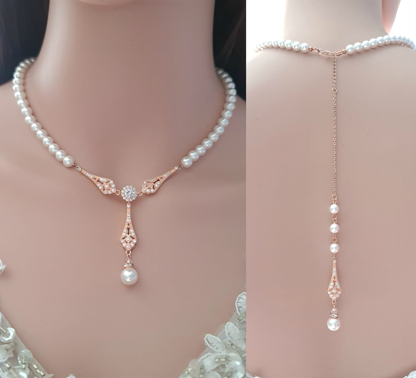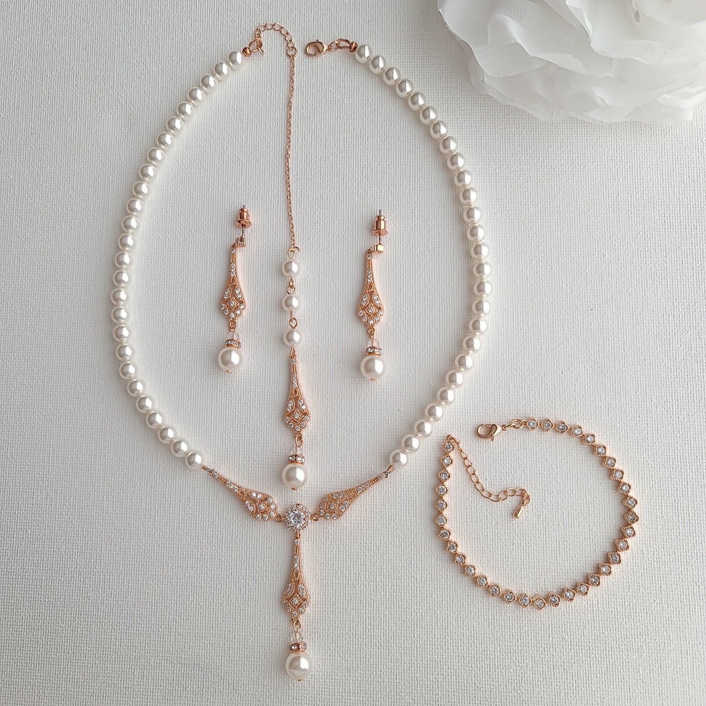 You may choose your rose gold necklace with or without the backdrop, a matching pair of rose gold earrings, and a bracelet. This rose gold and pearl bridal jewelry set is stunning when you combine all the three jewelry pieces together for a beautiful and complete bridal look. You also have an option to choose your necklace set in combinations with just the earrings & bracelet or both of them for a full and complete jewelry set.