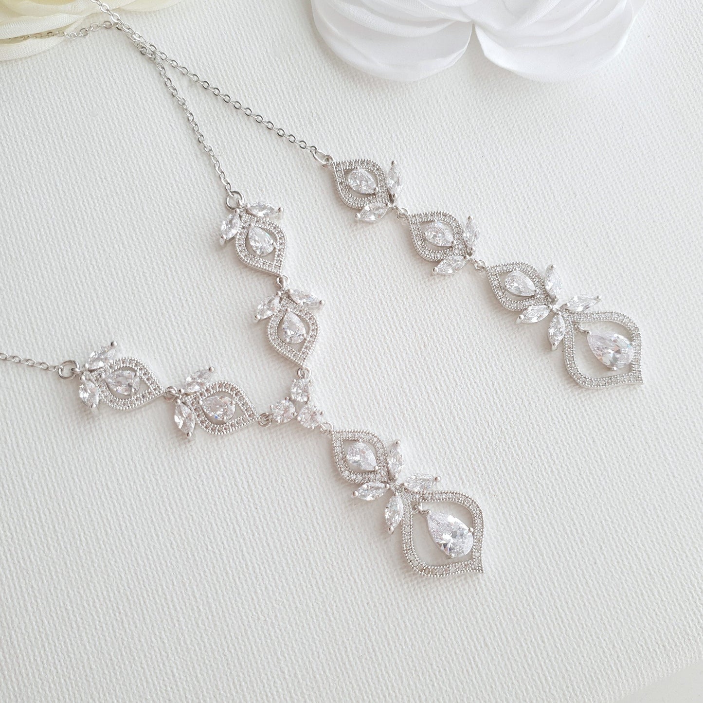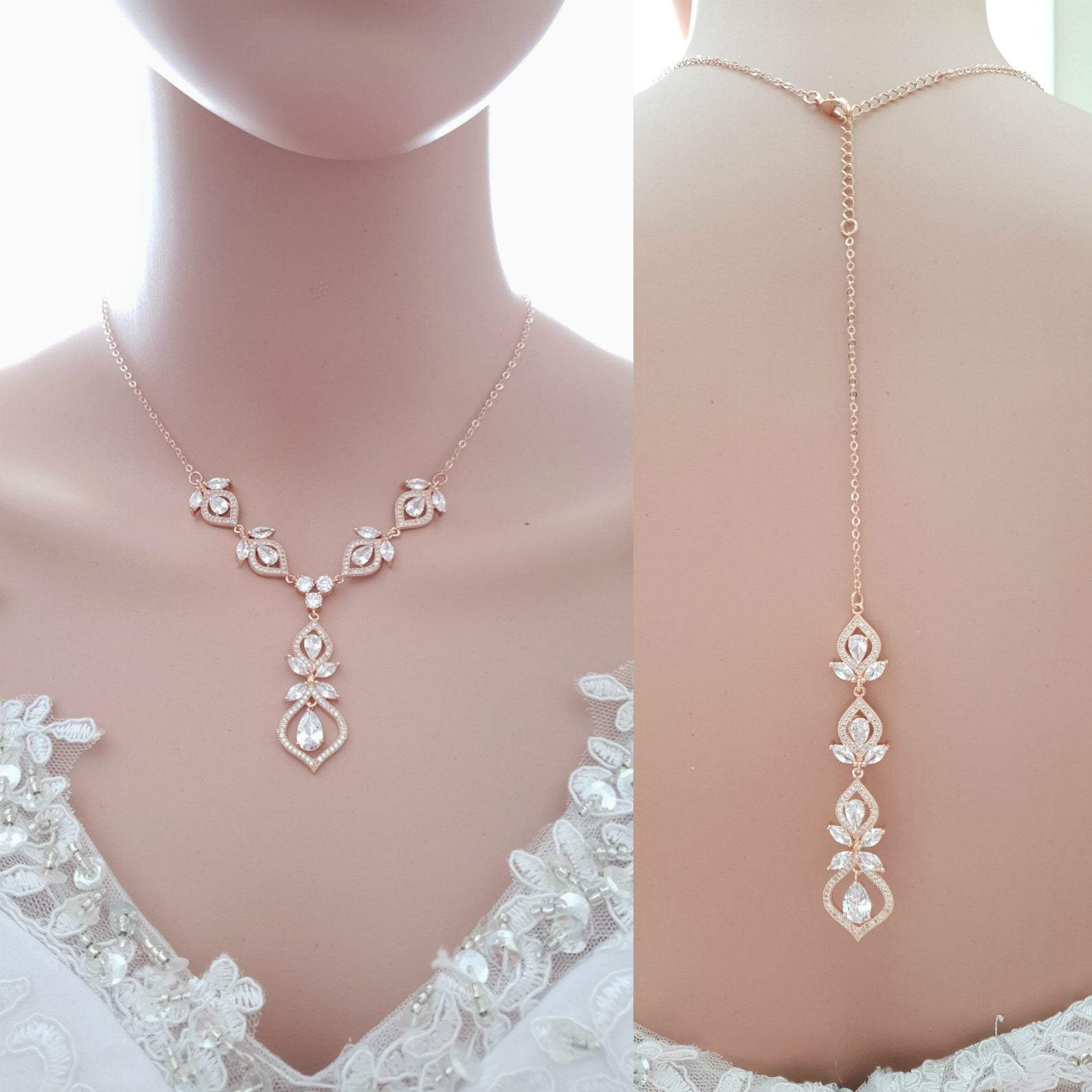 This rose gold backdrop necklace jewelry set is delicate and sparkly, The complete bridal jewelry set is made of cubic zirconia and is available in three finishes of rose gold, silver, and gold finishes to choose from. Detail description of each set is detailed below with specifications.