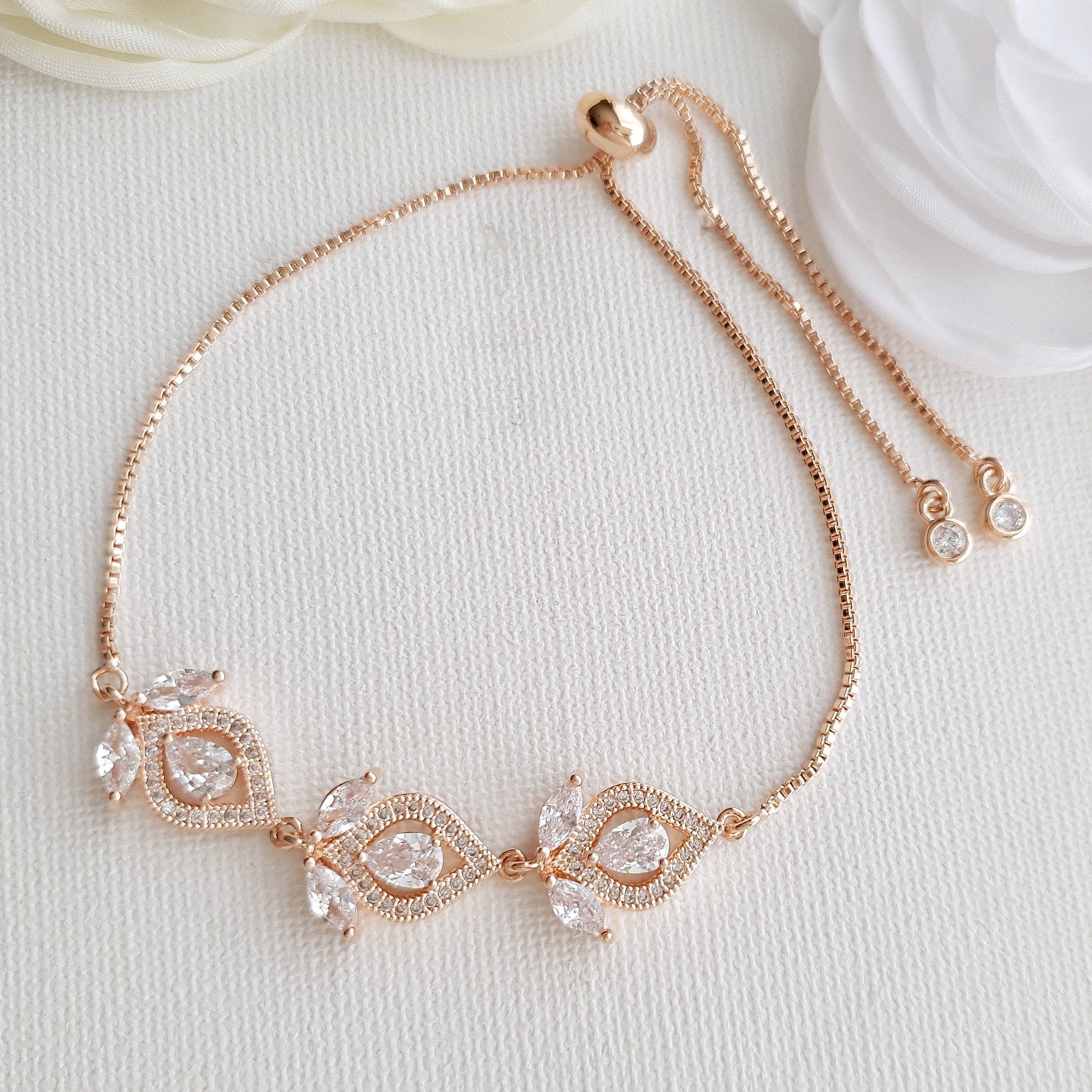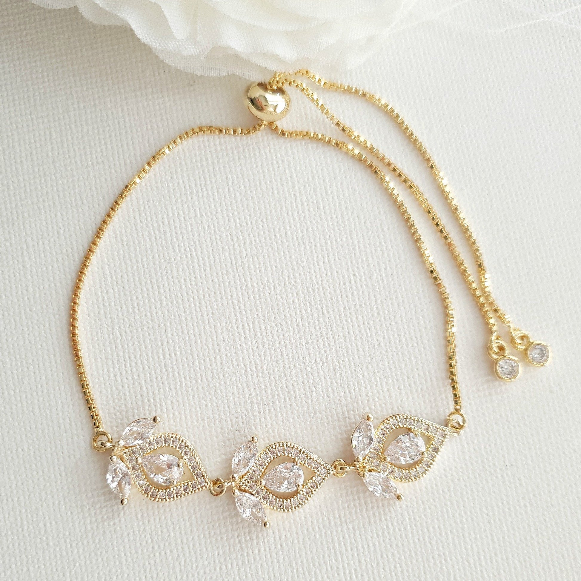 Slider Bracelet:- The adjustable slider bracelet will fit wrist sizes of all brides, including the brides with small wrists. The bracelet is designed with a slider clasp and crystals delicately designed. Measurement:- Crystal part 2 1/8 inches and width at the widest is 1.2 cm.