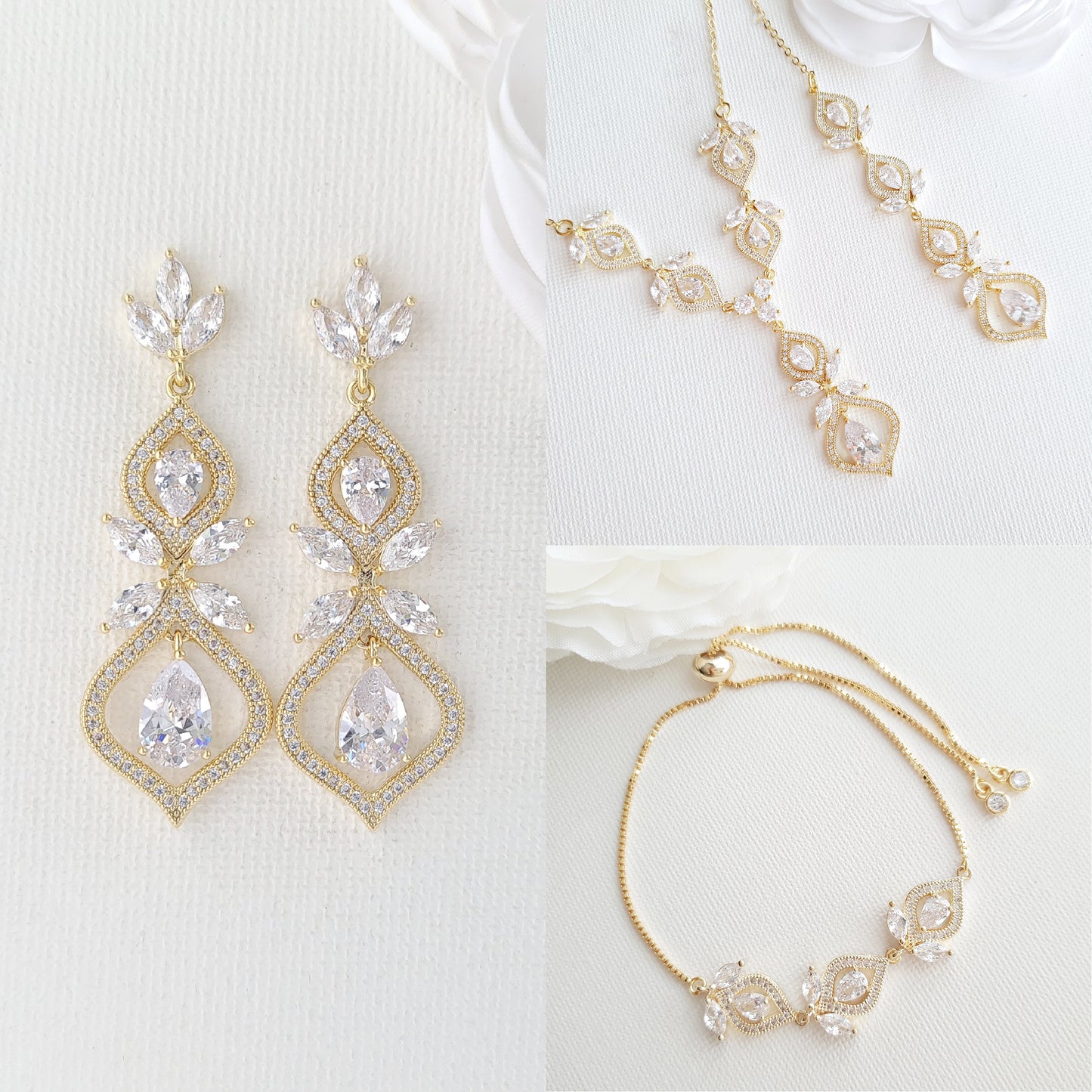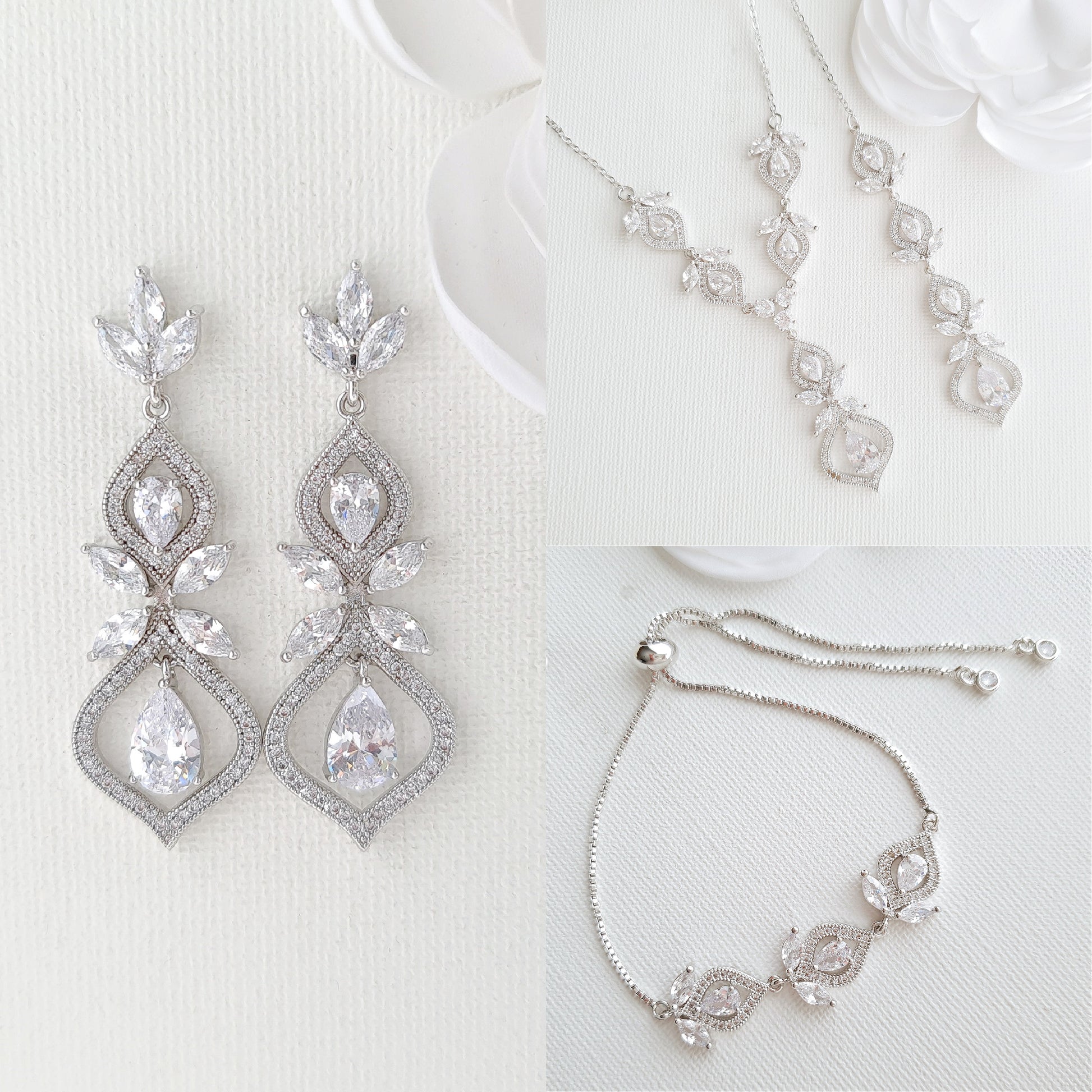 Matching & Complete Bridal Jewelry Set With Drop Earrings, Backdrop Necklace & Adjustable Slider Bracelet.