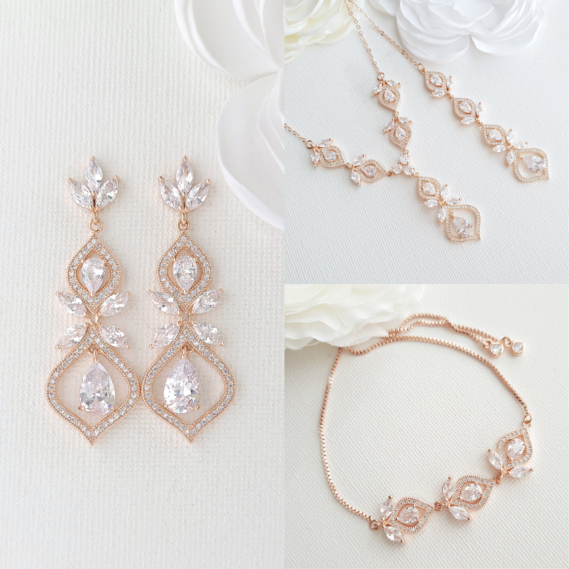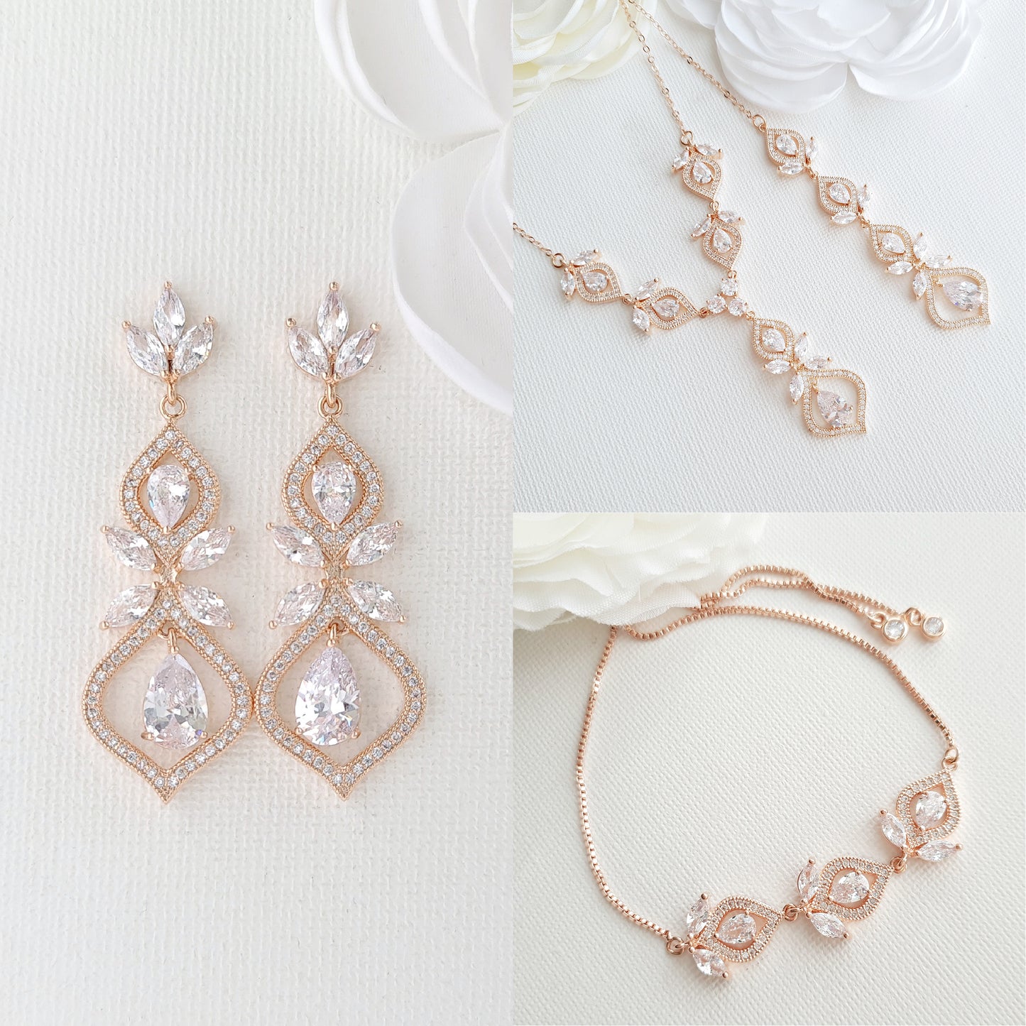 Stop searching for a matching and complete wedding jewelry set, for your wedding. We have made it easy, by putting together our rose gold bridal back jewelry set with drop earrings, slider bracelets, and backdrop necklaces of our popular Meghan design often purchased together by brides.