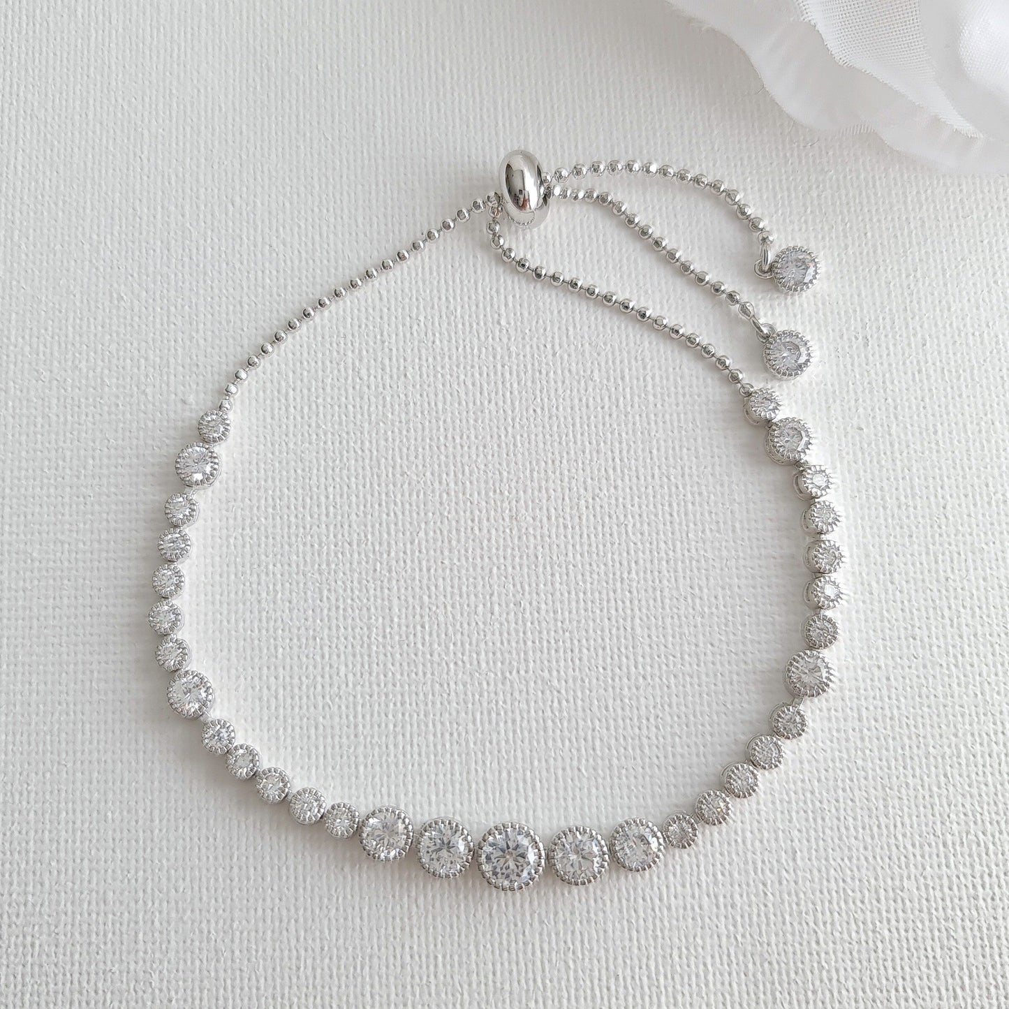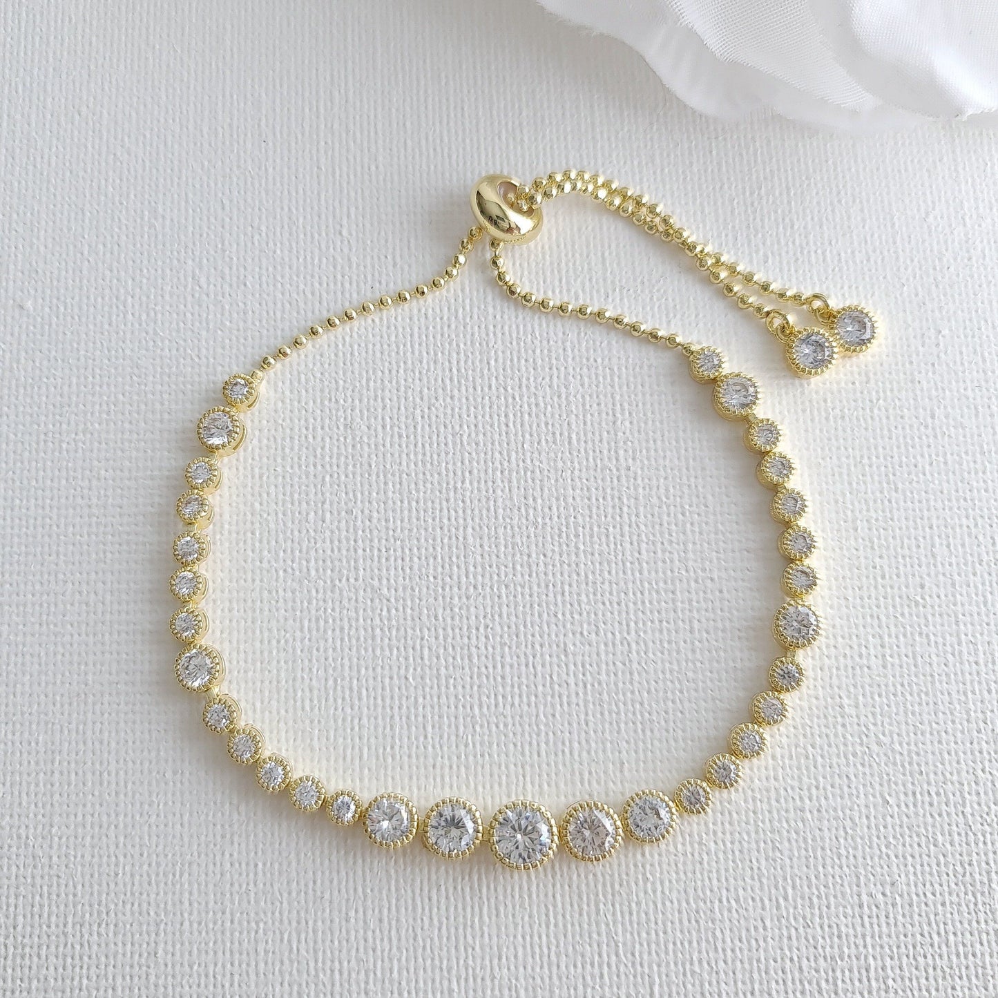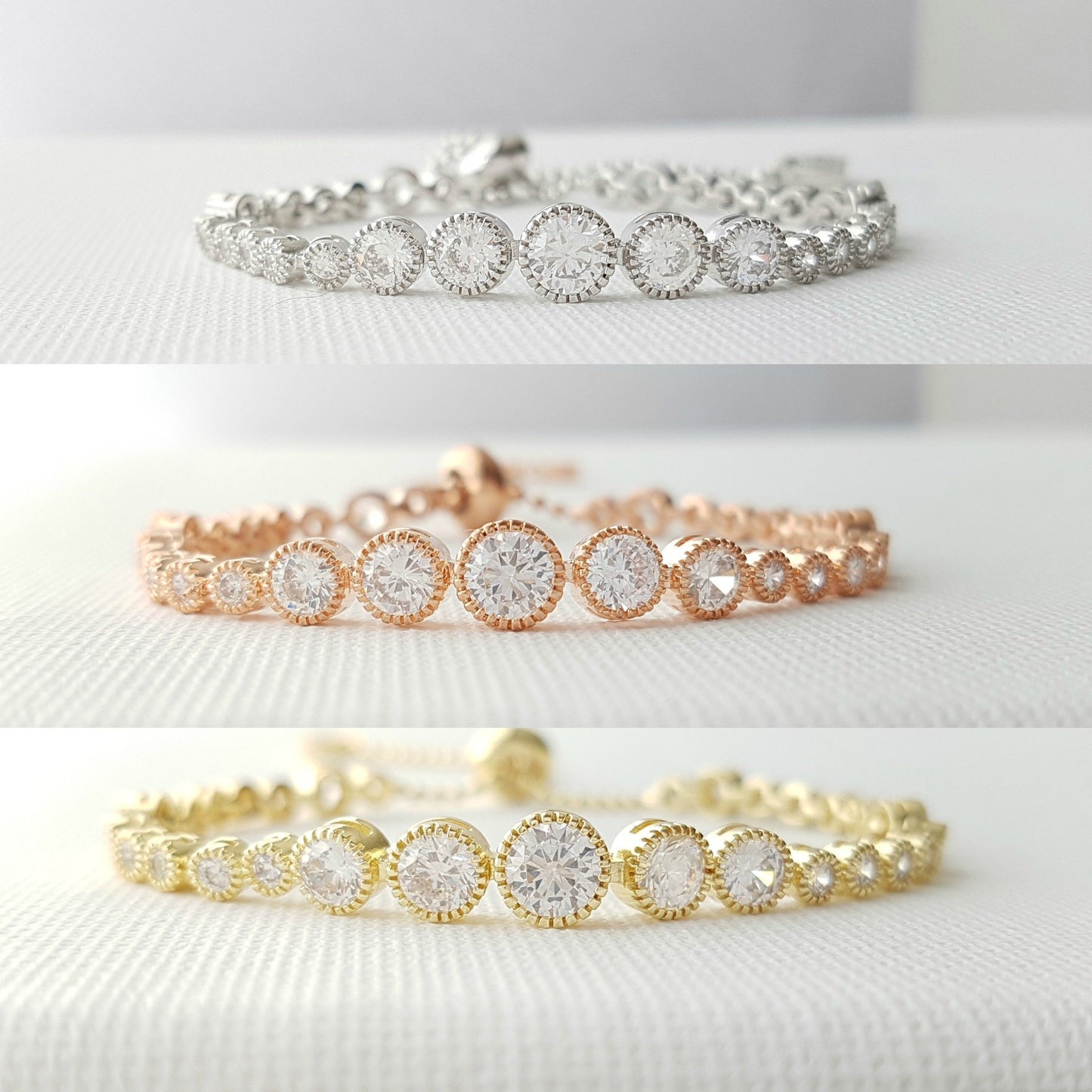This pretty tennis bracelet style is adjustable to fit any wrist size with the slider clasp. They are available in rose gold, silver, and gold tones. Great for all occasions after the wedding. A wonderful gift that will be cherished and loved by one and all.