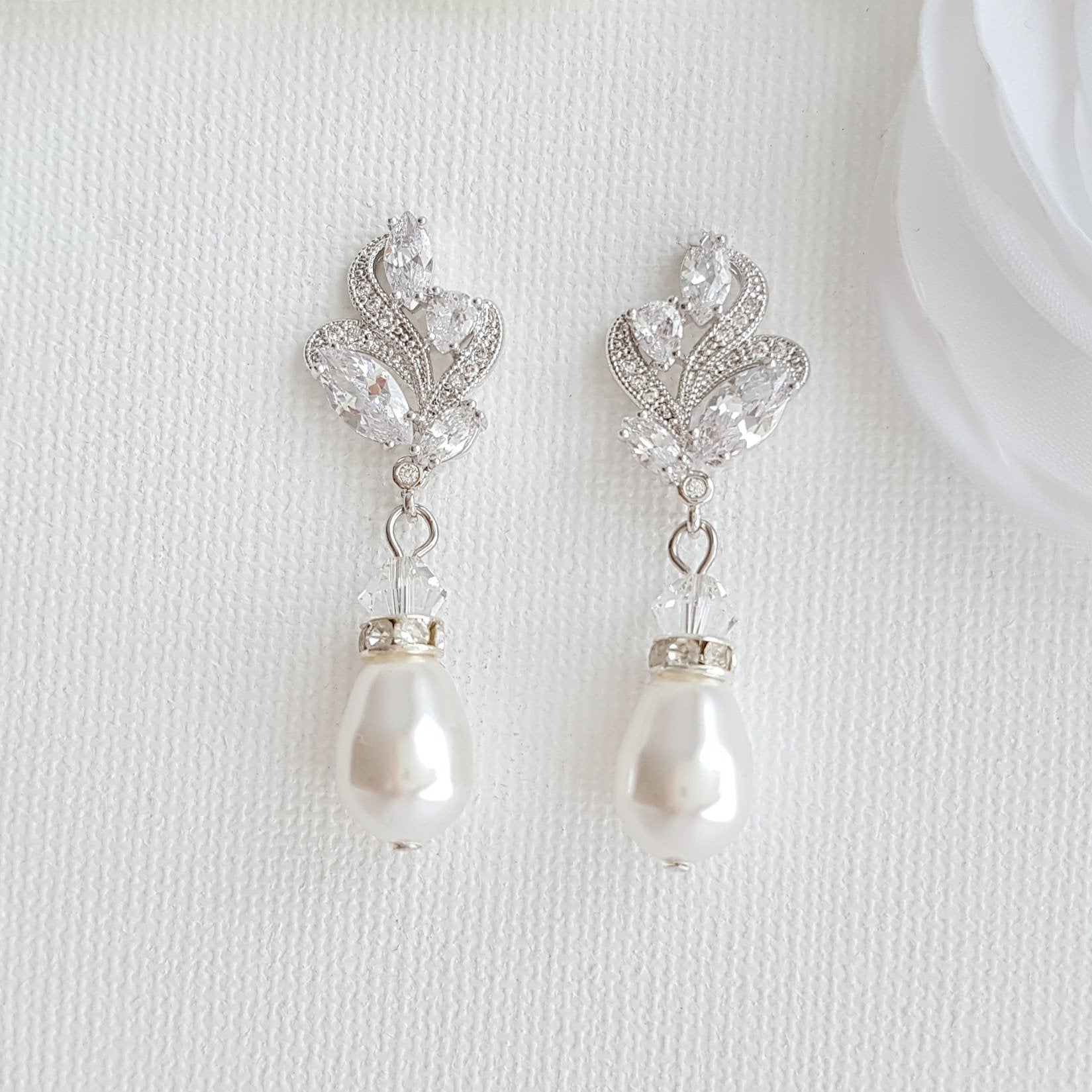 These rose gold bridal earrings are with pearl drops is a classic piece of wedding jewelry for brides & bridesmaids. This Wavy pearl drop rose gold bridal earrings are made with rhodium-plated brass and cubic zirconia detailed ear tops in a leaf and swirly design. The rose gold and pearl earrings are accented with the soft sheen of pearls ( cream or White) and CZ crystals wire wrapped drops. Beautiful crystal pearl wedding earrings, lightweight on the ears. The material used is rose gold plated brass. These rose gold earrings are available three finishes of silver/rhodium finish, rose gold finish and gold finish. These earrings can also be combined with a matching necklace for a complete bridal jewelry set.