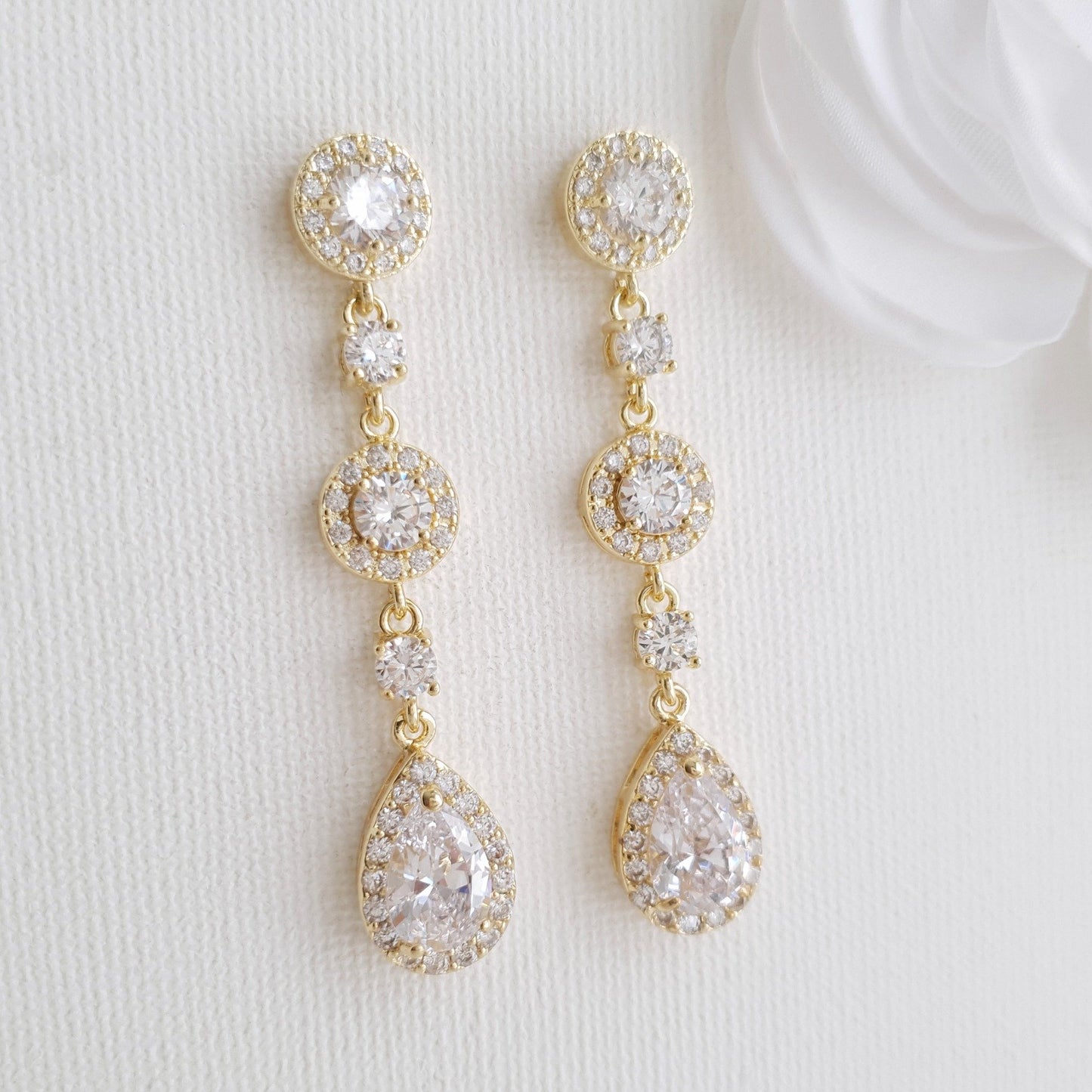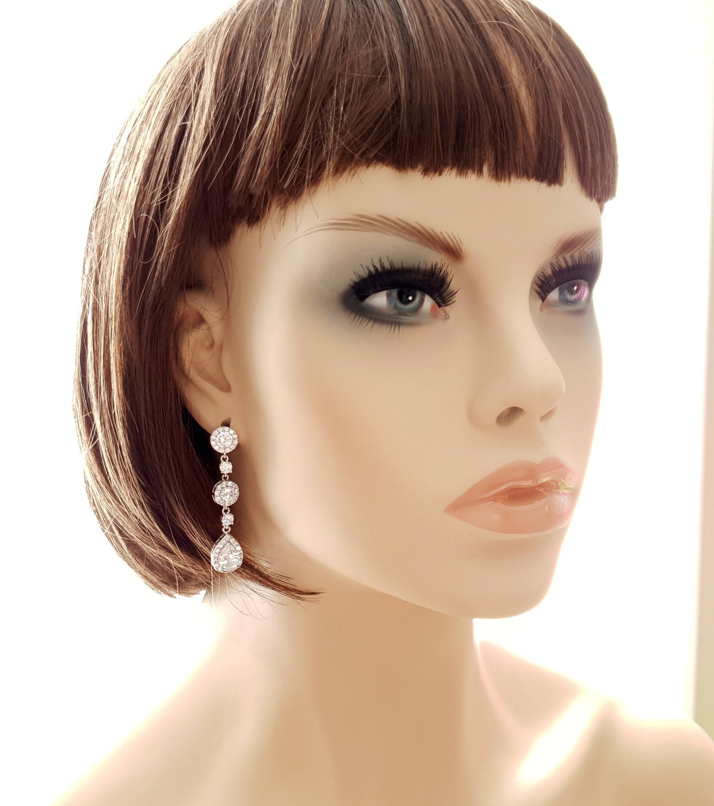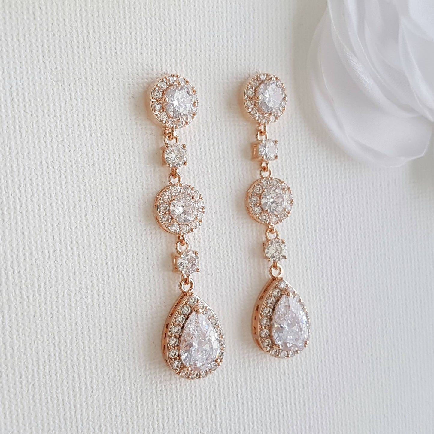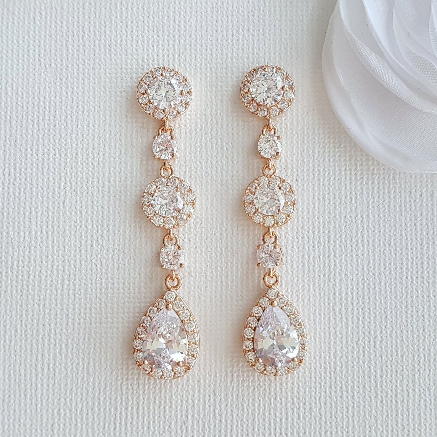 Elegant, long Cubic Zirconia teardrops are set in an open setting in a rose gold plated brass bezel and surrounded by tiny cubic zirconia crystals. They dangle from Cubic Zirconia detailed round posts with rose gold plated brass settings and are interspersed with two sizes of cubic zirconia connectors. Also available in silver/rhodium and 14k gold finish.