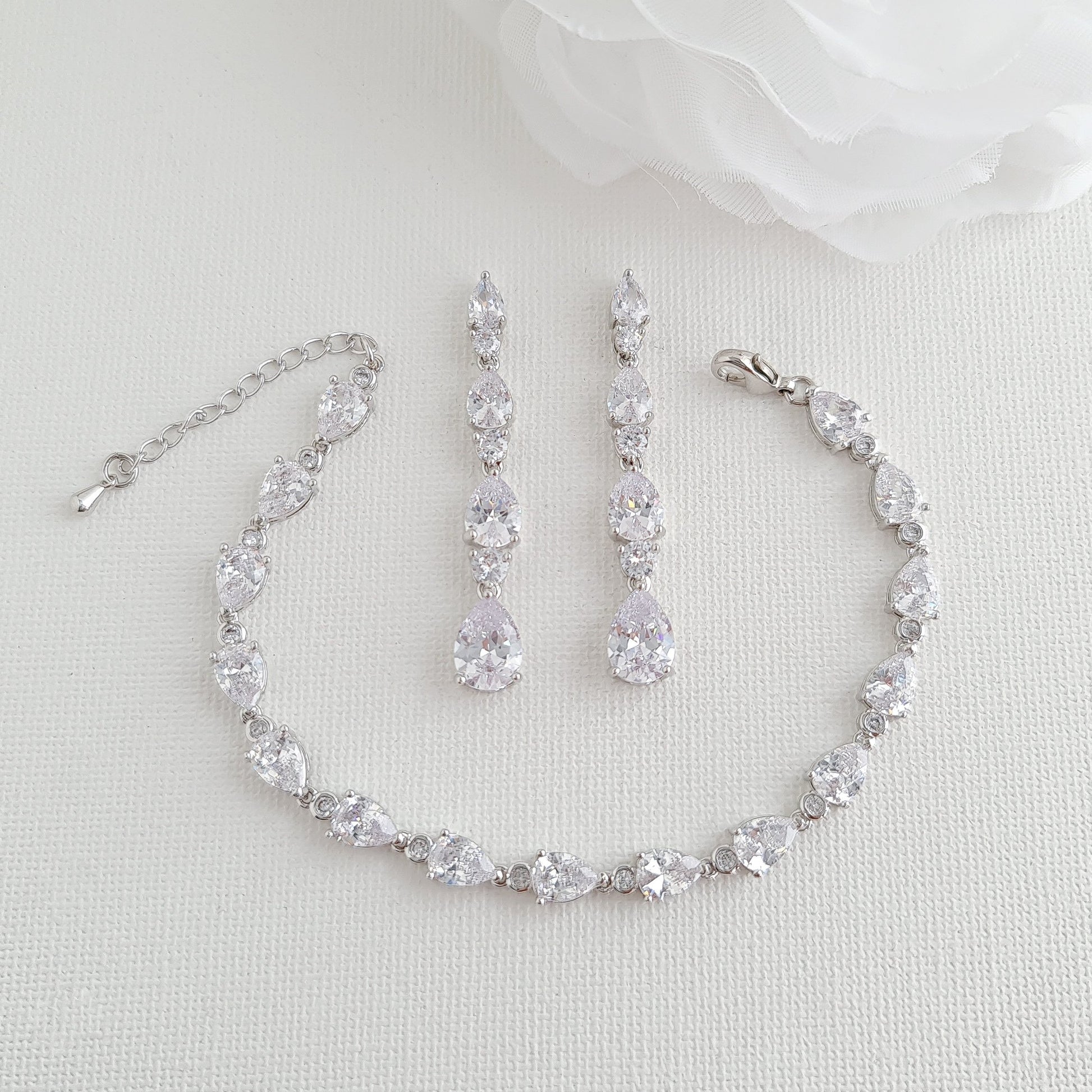 Teardrop Earrings- The earrings are mid-sized measuring about 4 inches, Matching the bracelet, the earrings are in slim design earrings are lightweight and comfortable. The earrings are made of cubic zirconia and the ear pins or posts are of stainless steel. They measure 1 3/4 inches of 4 cms.