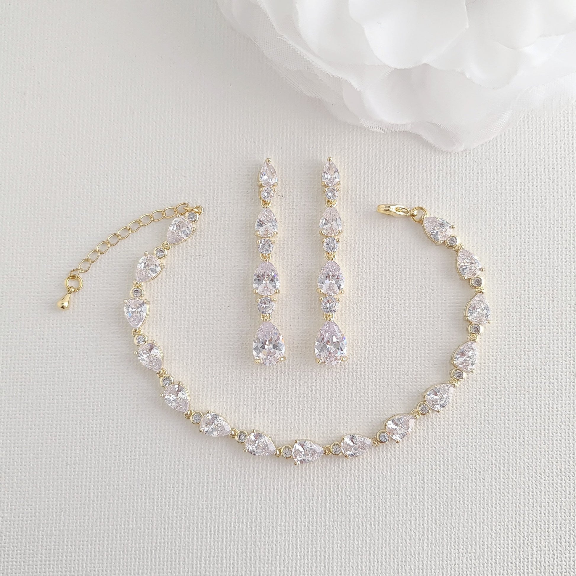 This jewelry set of earrings and bracelet are super sparkly and is made of cubic zirconia that sparkle like a diamond, plated in rose gold the jewelry adds a touch of light pink to the jewelry set. Great to wear on several occasions after the wedding too.