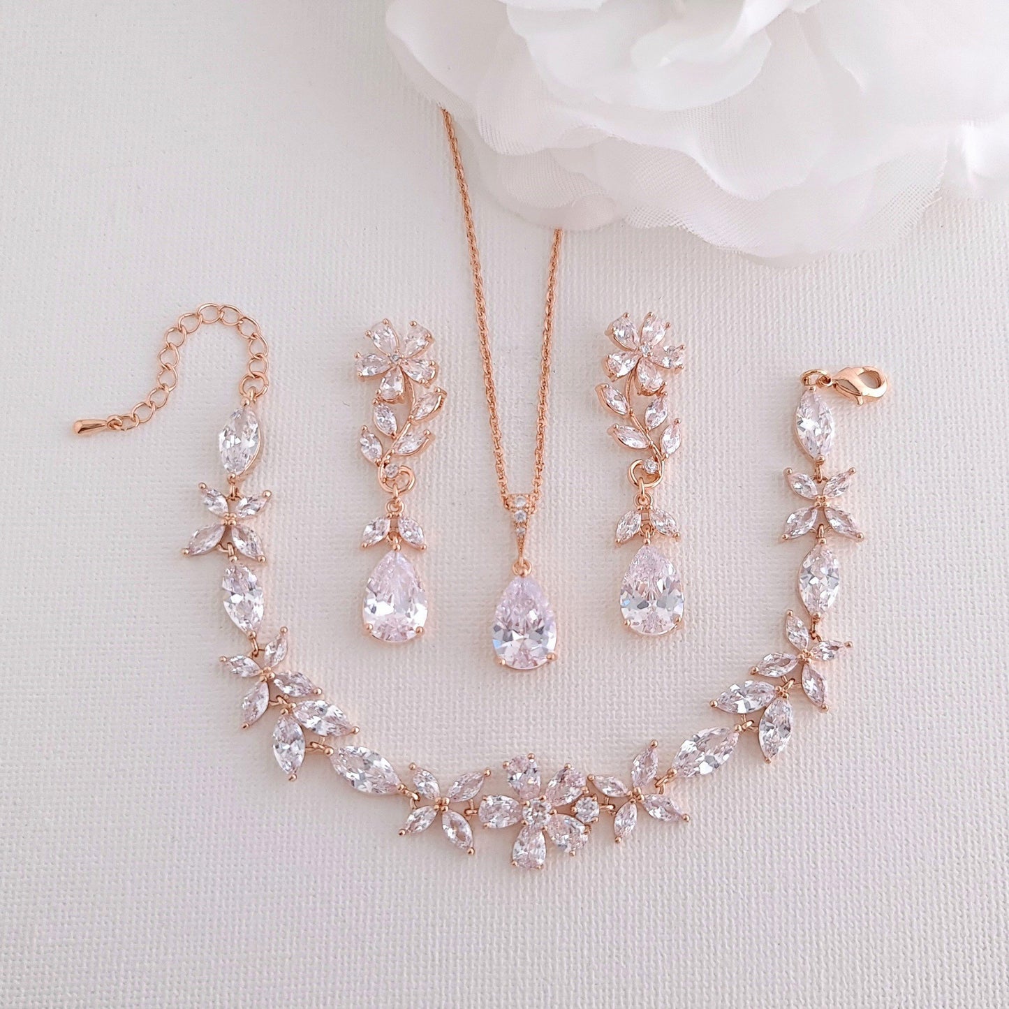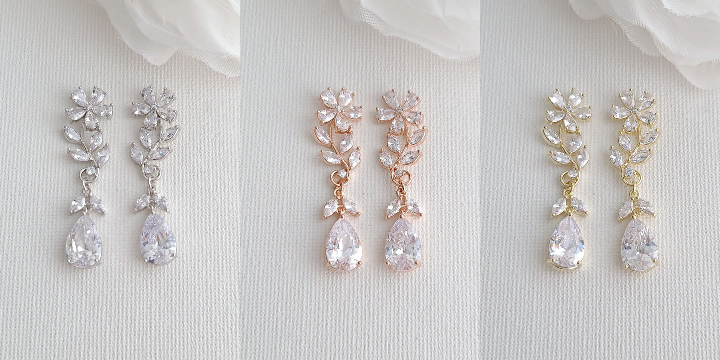 These rose gold flower earrings for weddings are made of delicately crafted sparkly cubic zirconia. These are a perfect pair of rose gold earrings if you are trying to match your leaf and flower pattern on your wedding, formal, or and event dress.