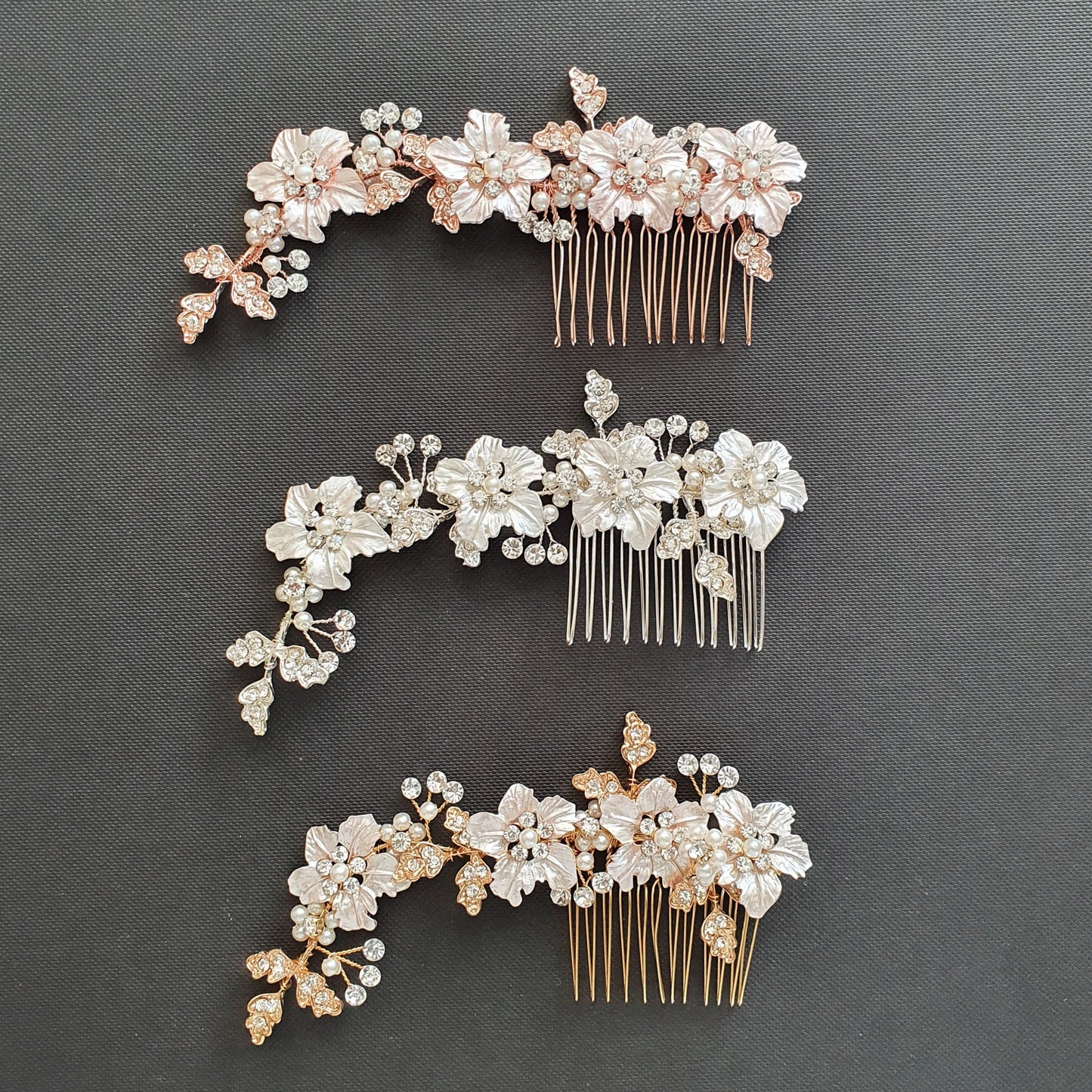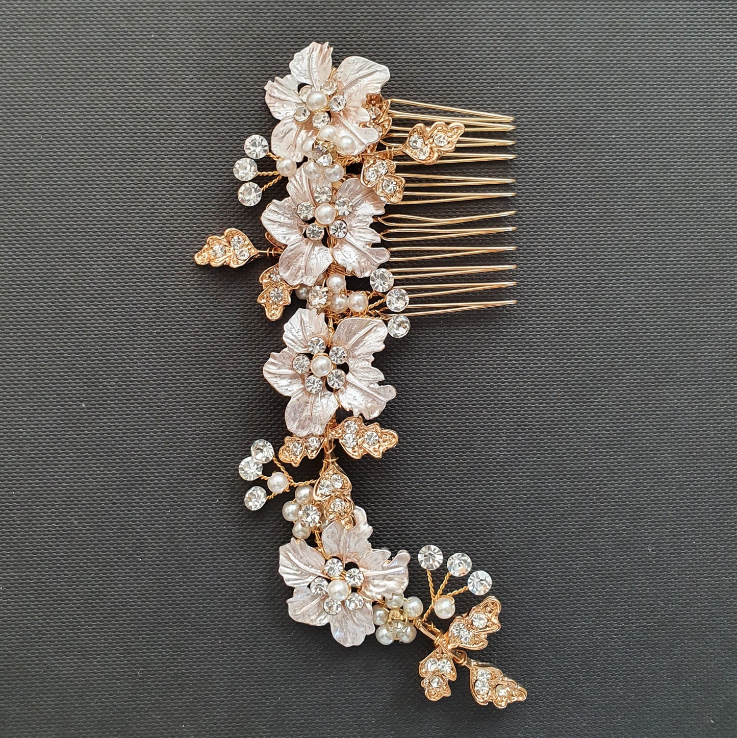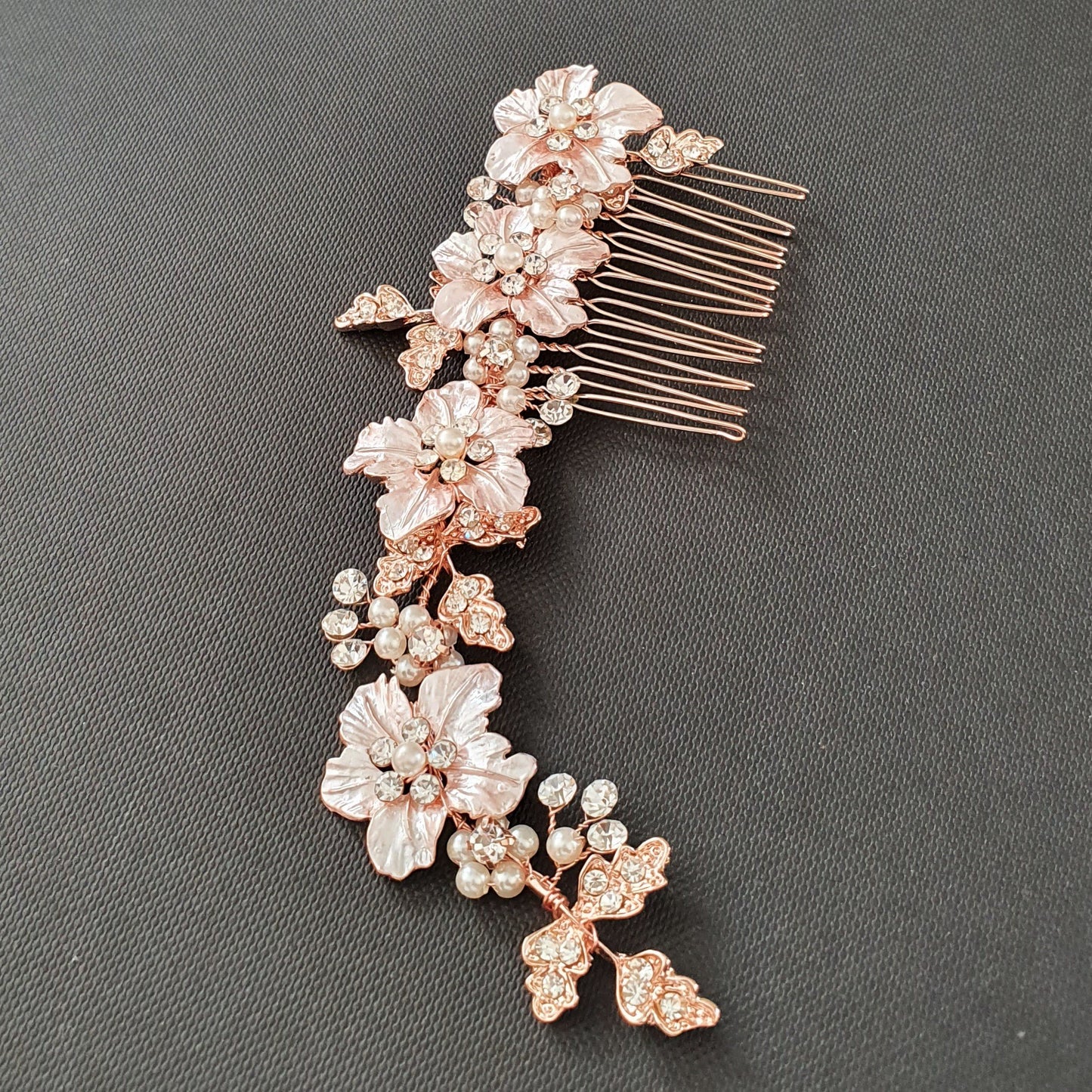 The rose gold flower petals and crystal-studded leaves on the hair comb are wire wrapped with some pearl and crystals, It is flexible and can be set as required.