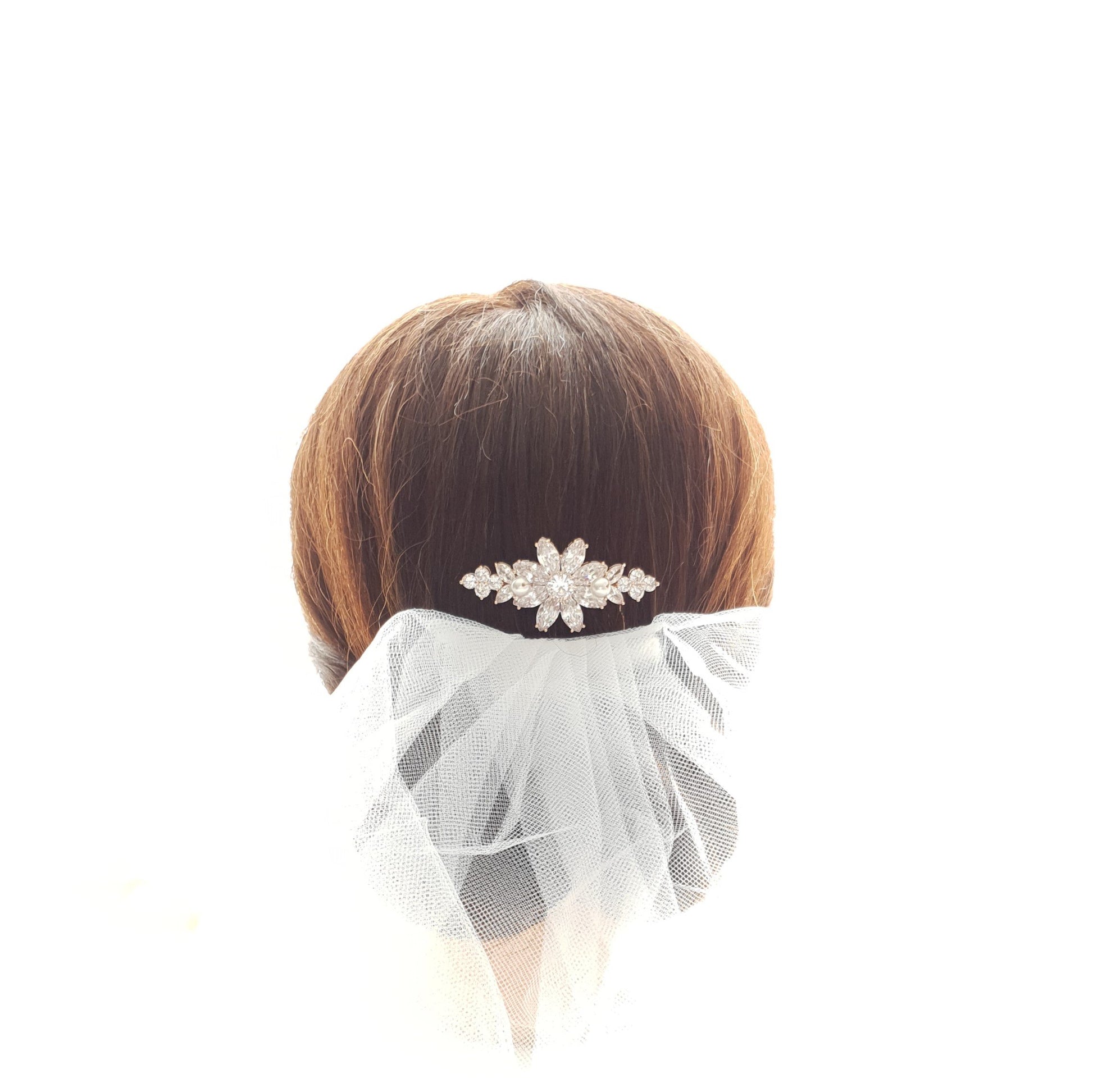 This rose gold hair comb in flower design is made with sparkling cubic zirconia, which is the star of this wedding hair comb for brides. This daisy flower hair comb is small but the marquise-shaped crystals of the daisy flower pack a punch in sparkle. The rose gold cubic zirconia bridal hairpiece is ideal as a small veil comb or tucked in on the side for the bridal & wedding hairstyle.