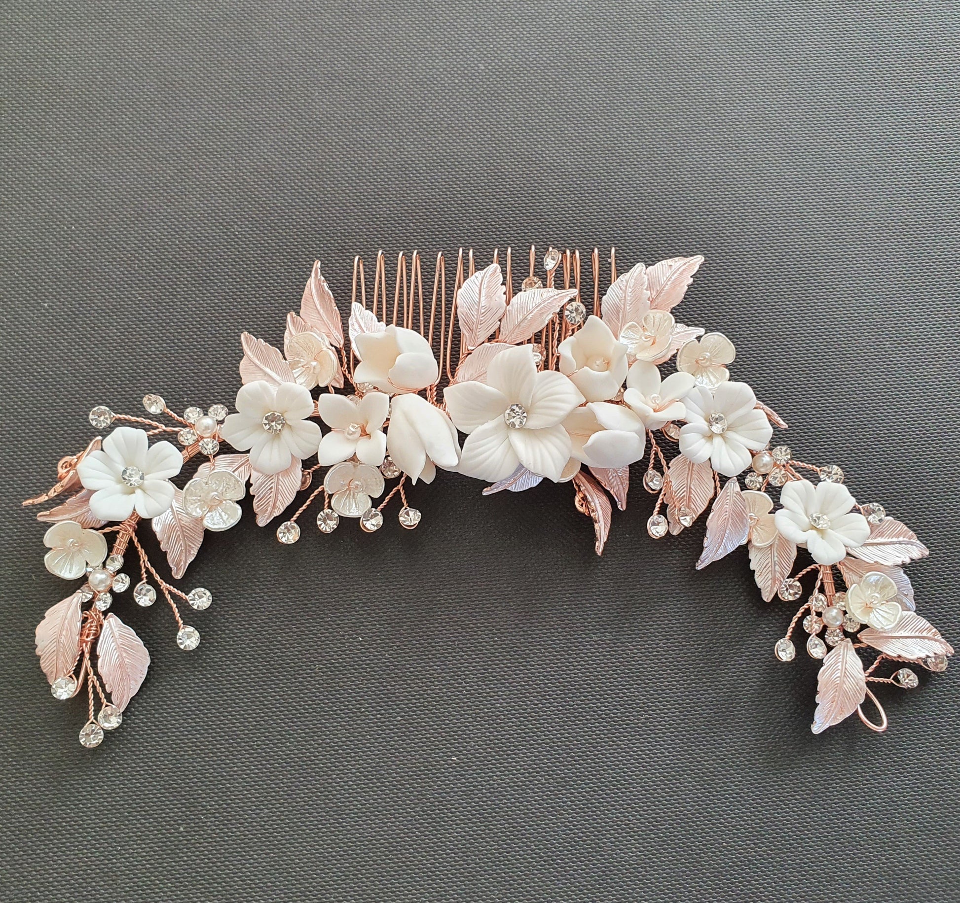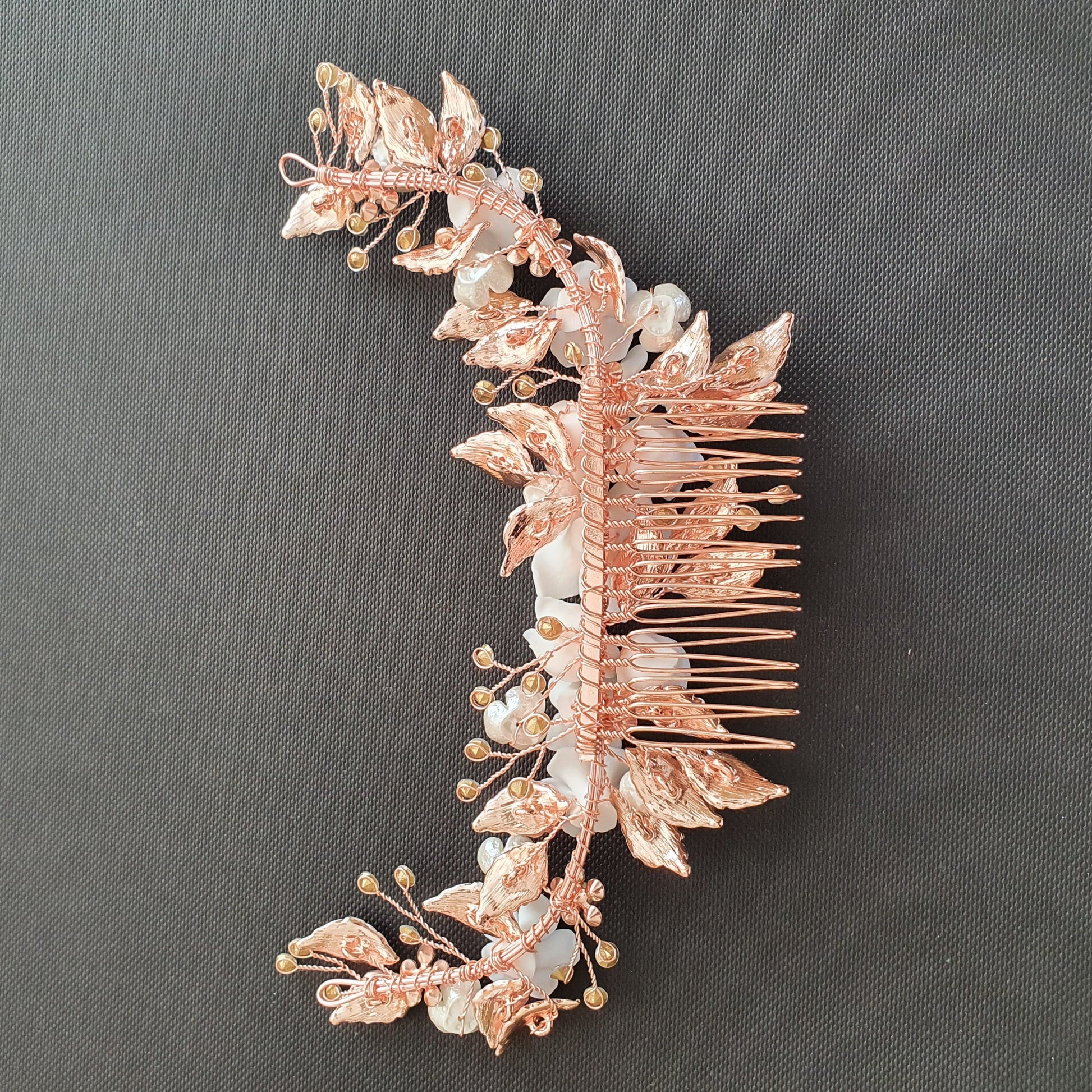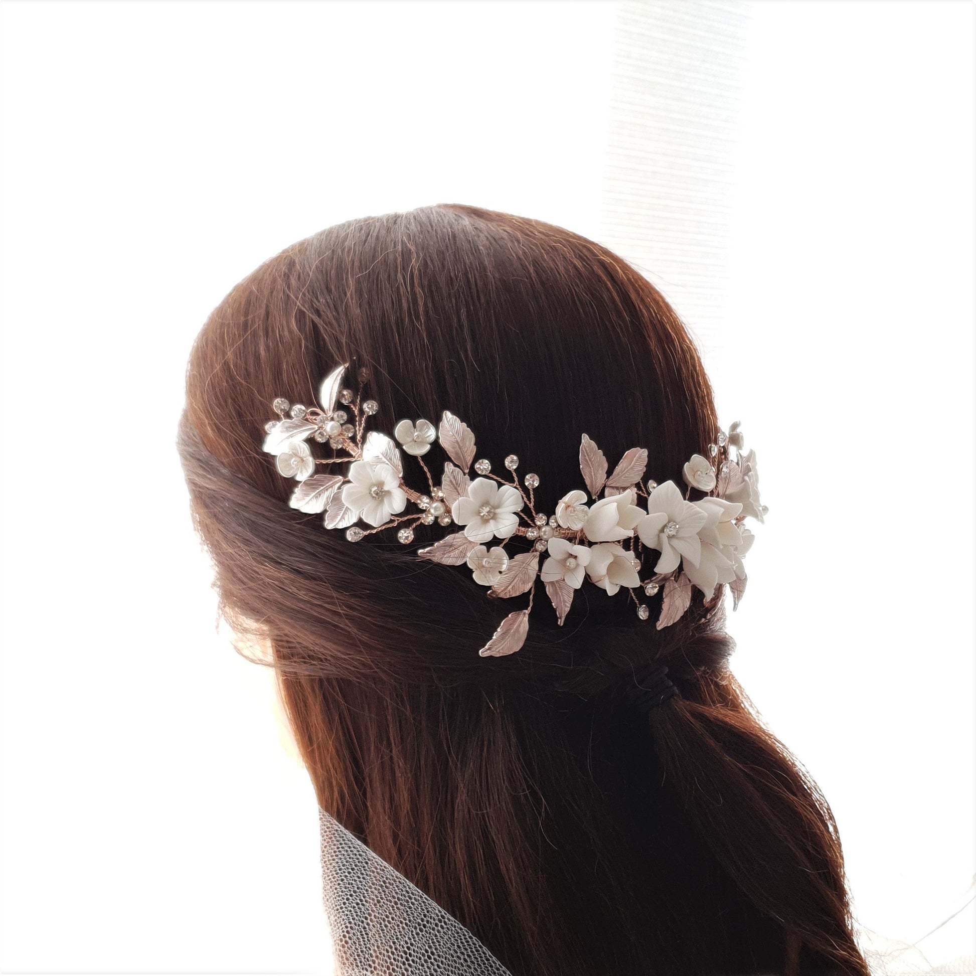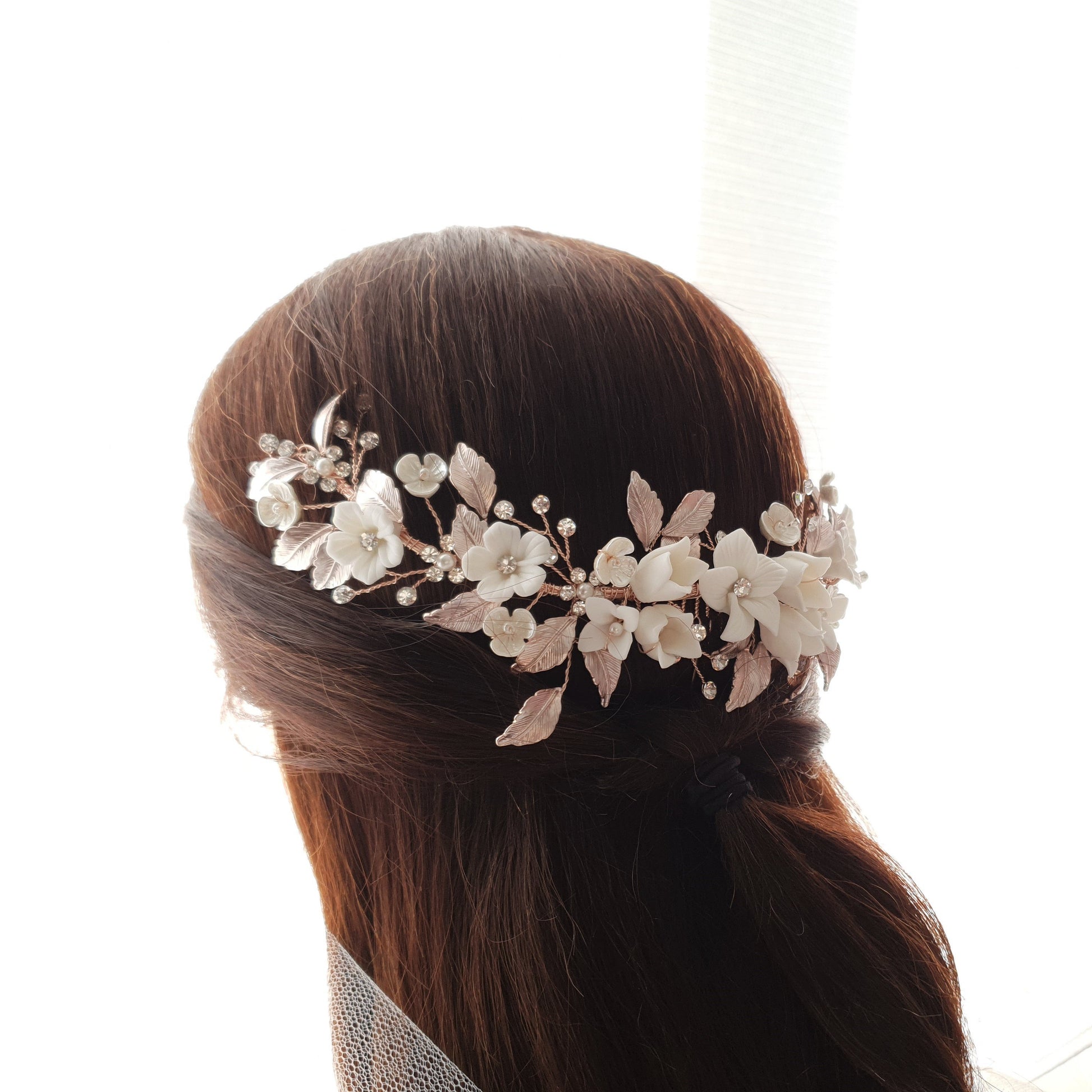 The hair comb is created with tiny and small white flowers with rose gold leaves. The tiny crystal is sparsely wire wrapped and twisted with rose gold wire.