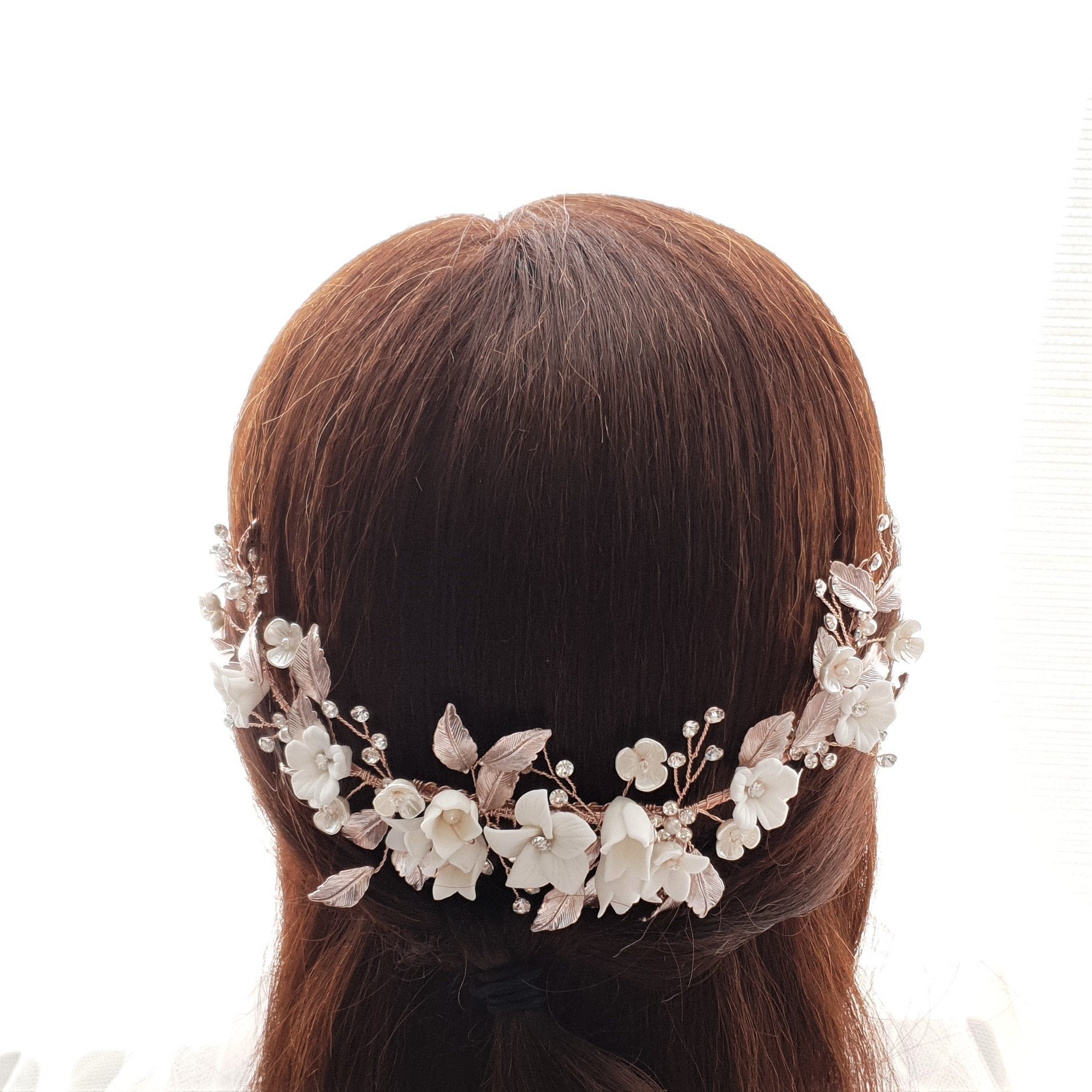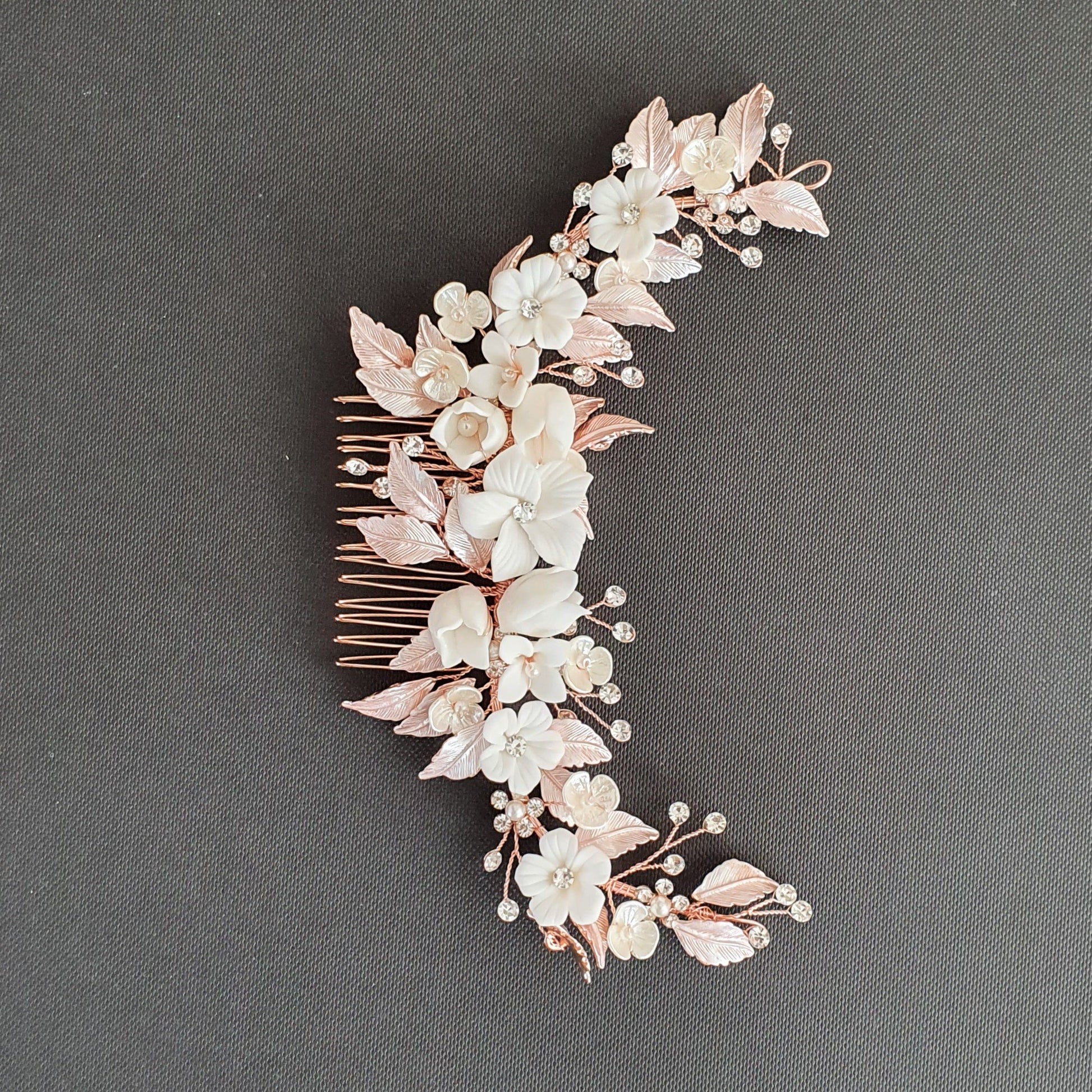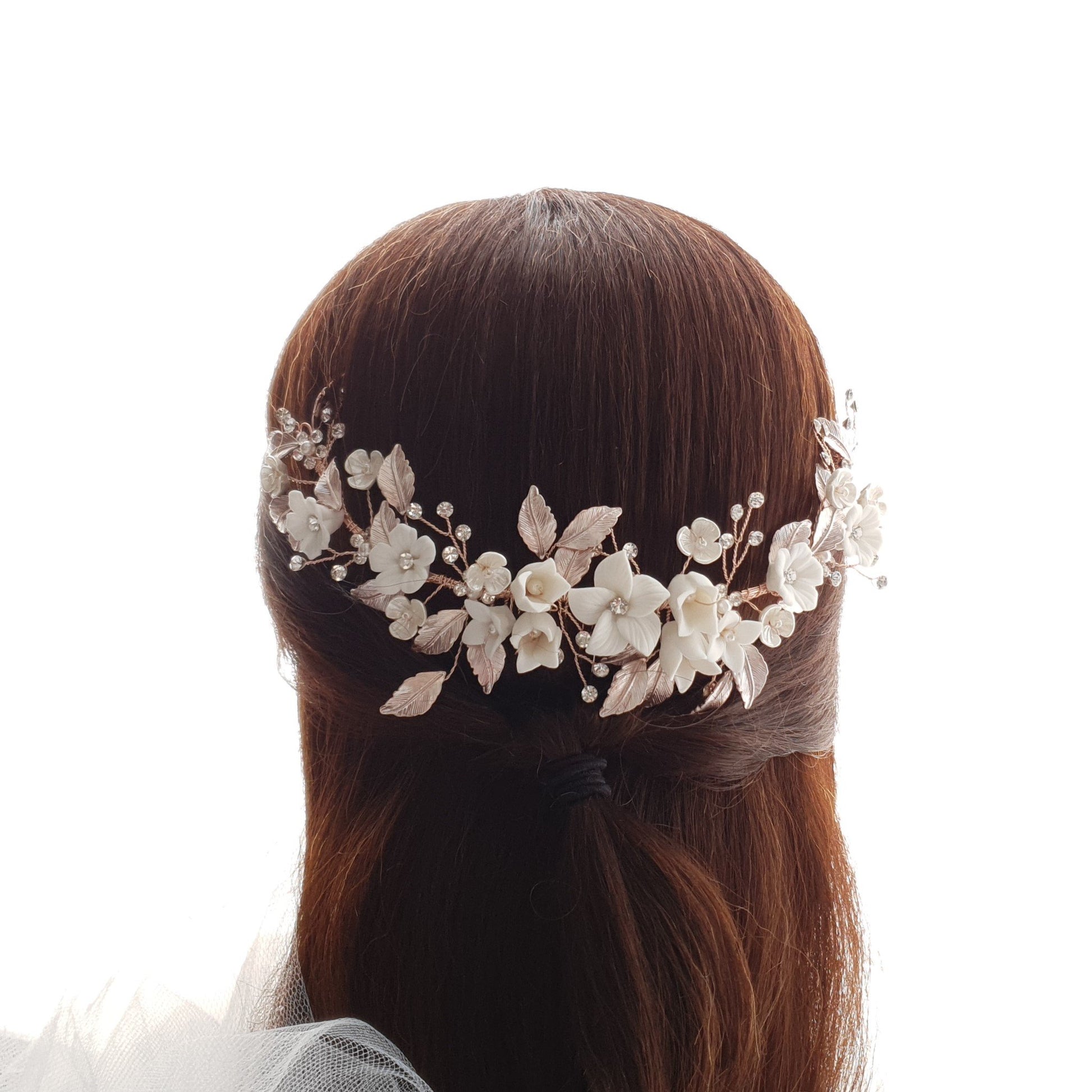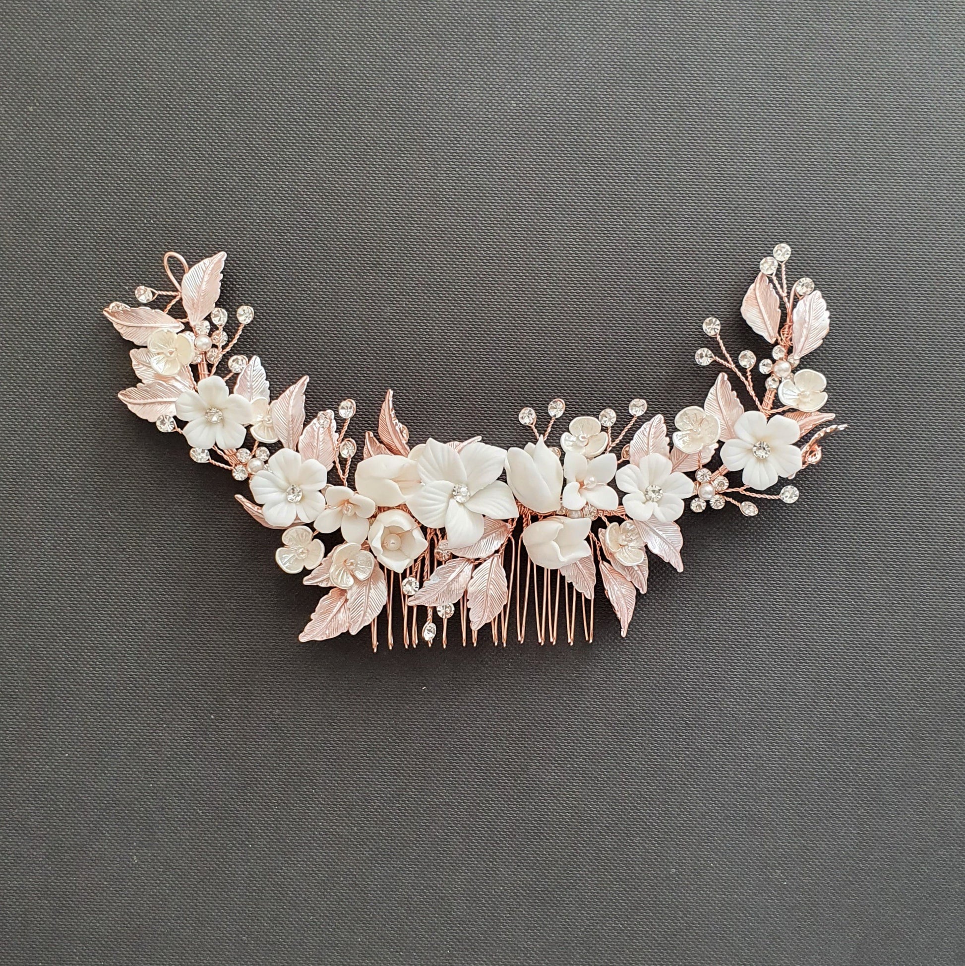 The hair comb is created with tiny and small white flowers with rose gold leaves. The tiny crystal is sparsely wire wrapped and twisted with rose gold wire.