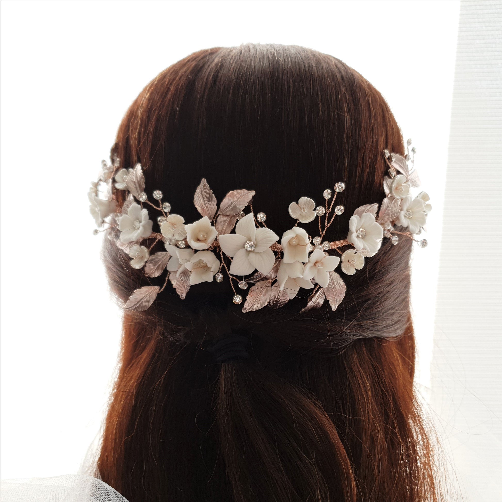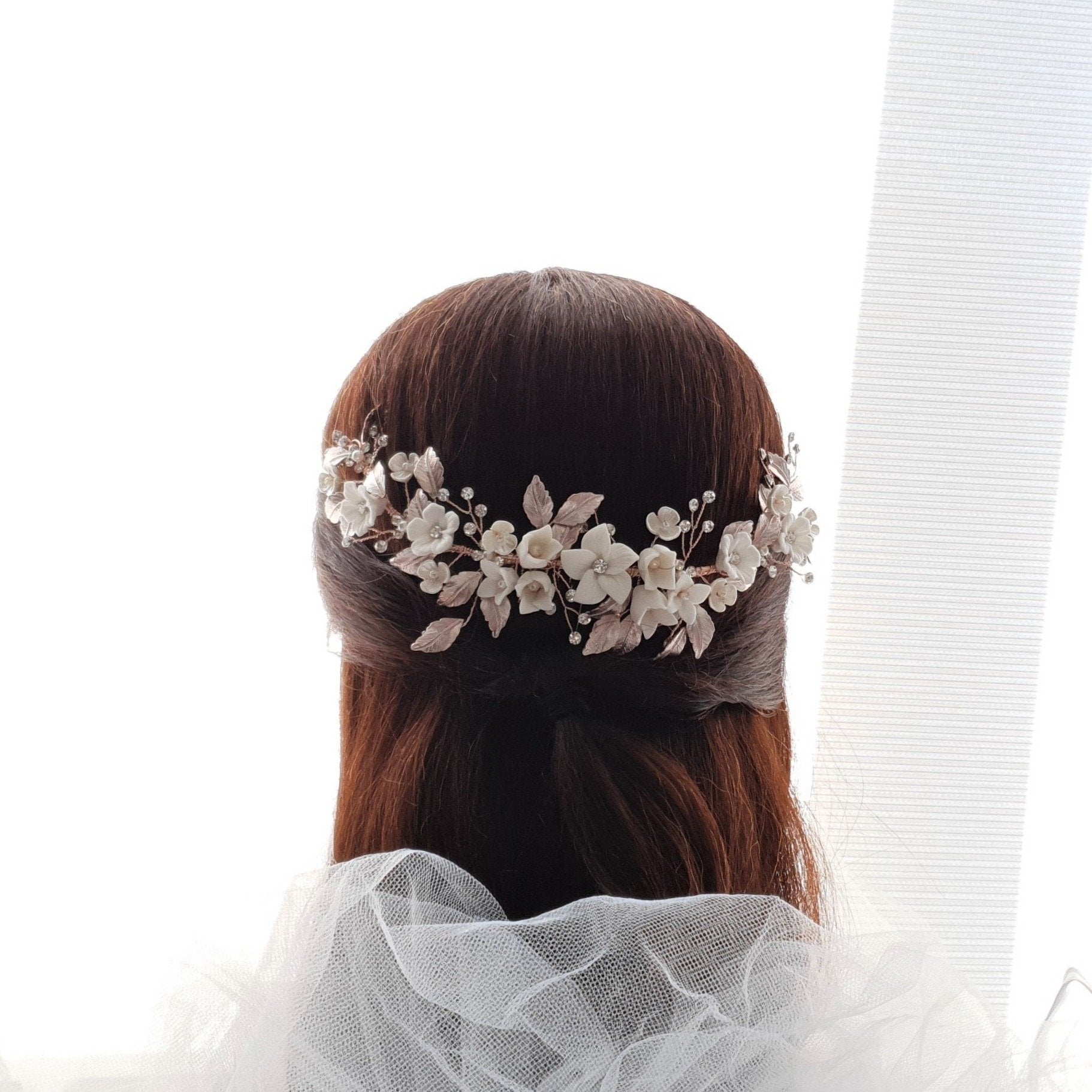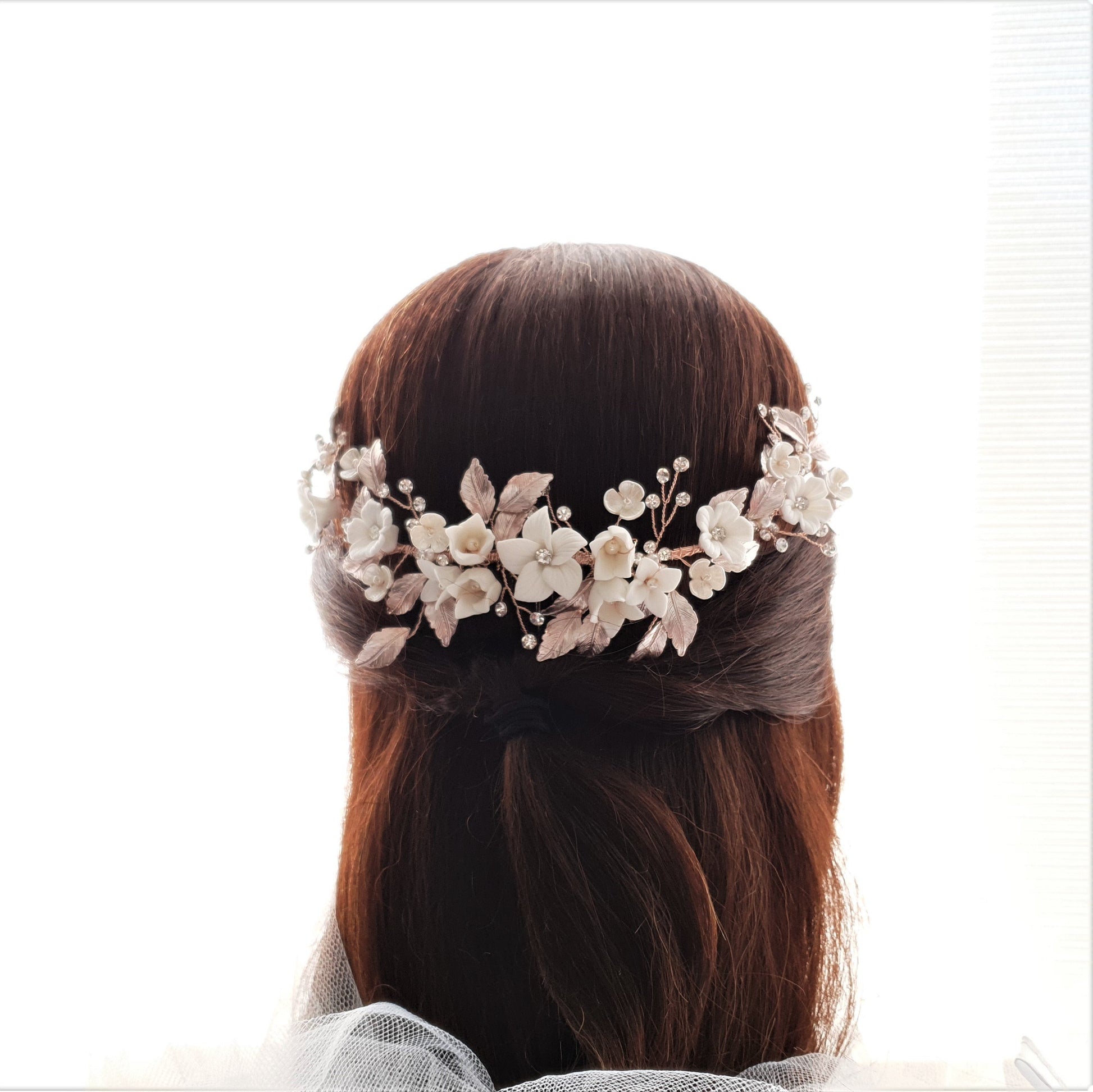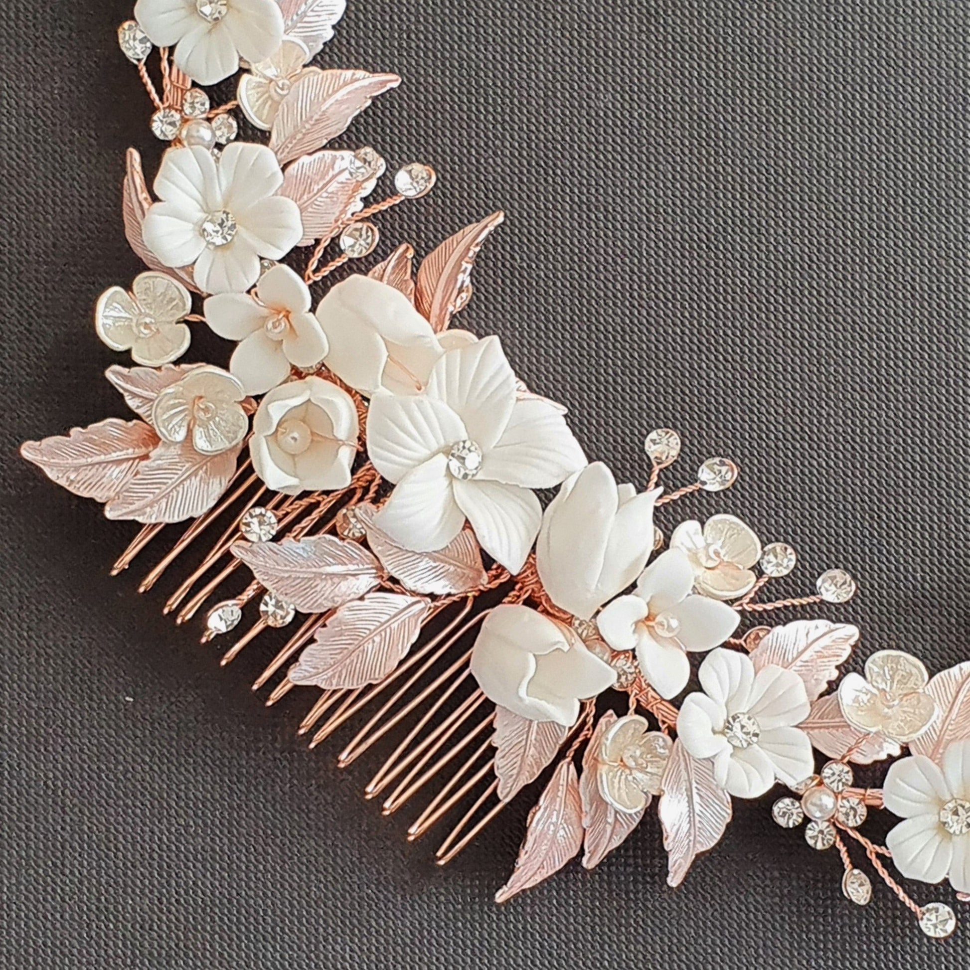 The hair comb is created with tiny and small white flowers with rose gold leaves. The tiny crystal is sparsely wire wrapped and twisted with rose gold wire.