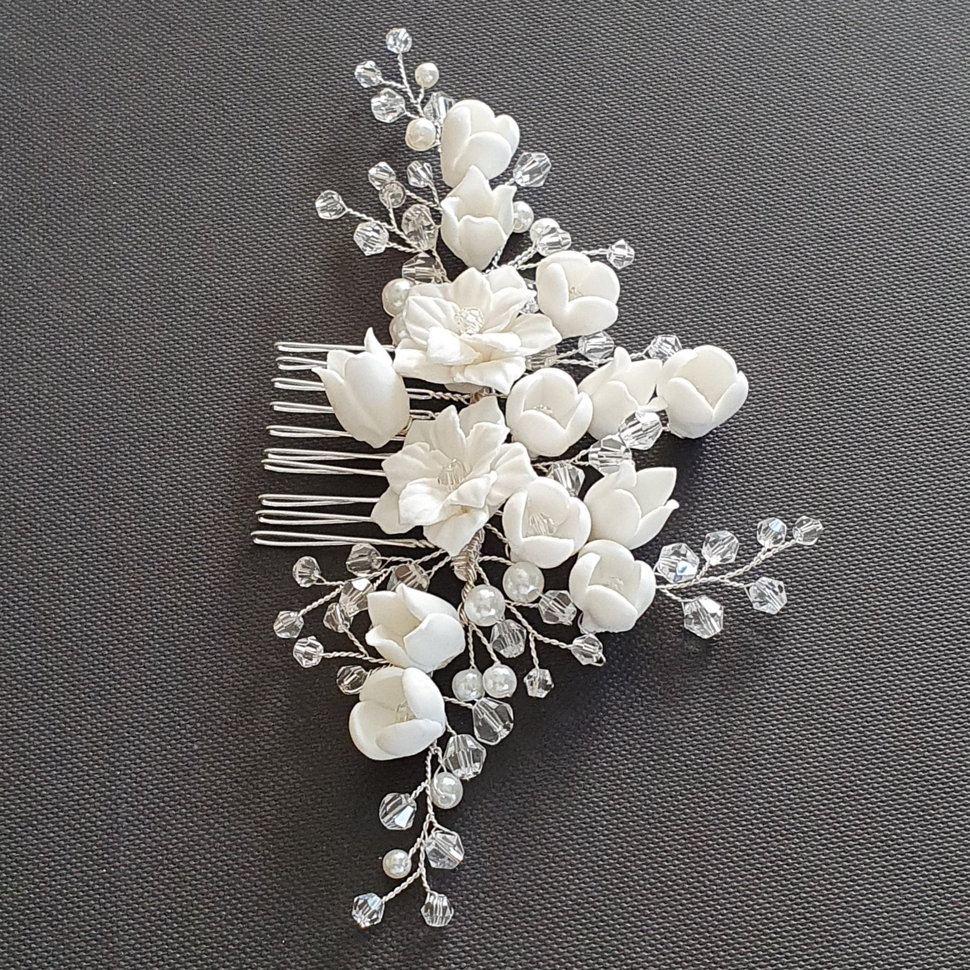 The smooth nature of these porcelain or ceramic flowers, makes them look almost like real flowers. The flowers on the hair comb are wire wrapped in delicate rose gold wire with clear crystal beads and dotted pearls.