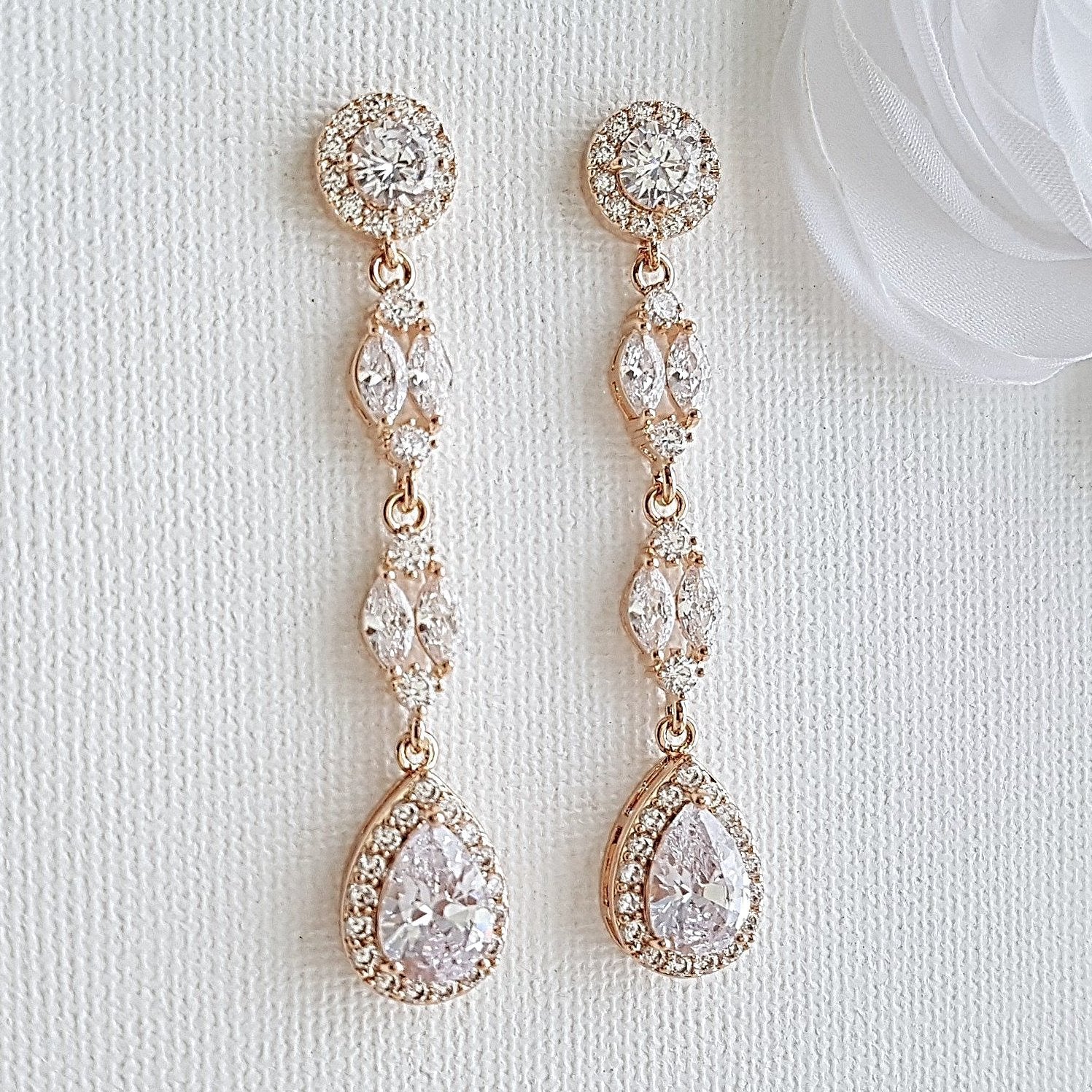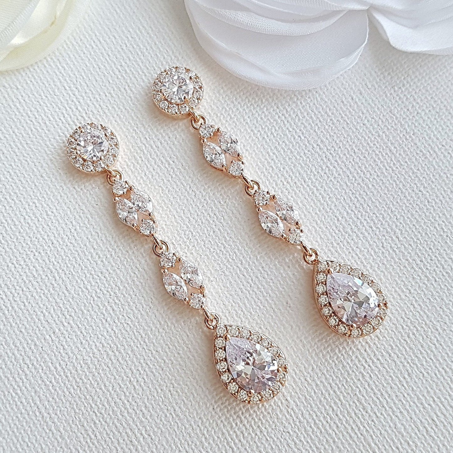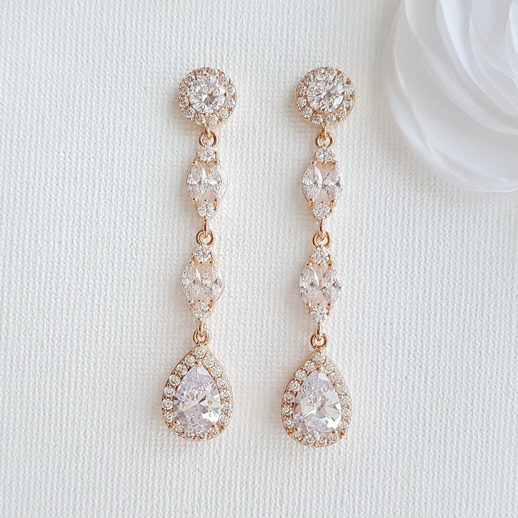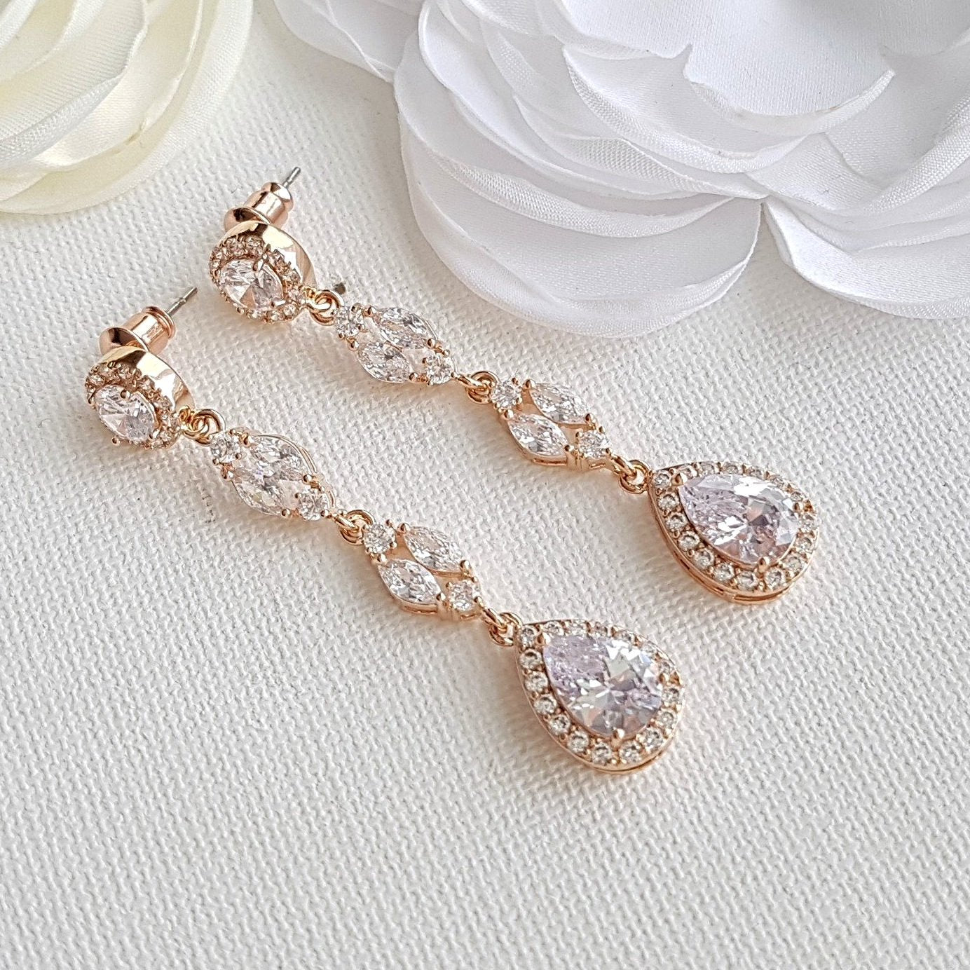 These rose gold long earrings are made with shiny cubic zirconia marquis crystal beads, with a dangled teardrop and a sparkly perfectly round ear post. These beautiful long rose gold earrings have a length of 2/18 of an inch.