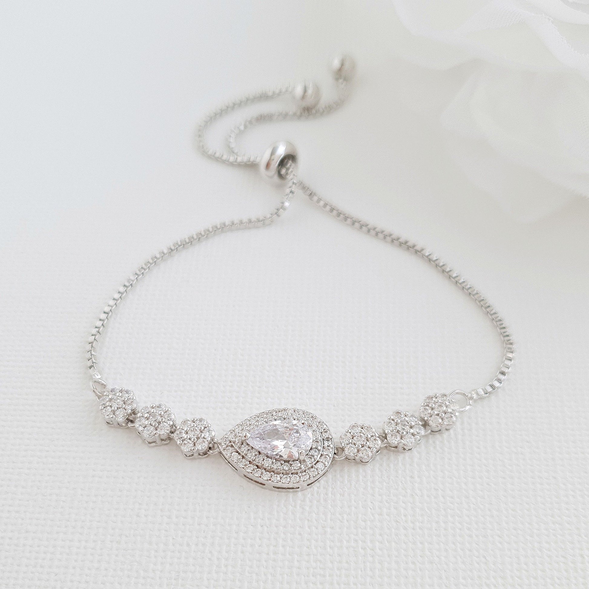 This wedding Bracelet is made with teardrop cubic zirconia in the center that is detailed and layered with circle floral CZ beads on the bracelet in rose gold plating. The cubic zirconia bracelets are also available in 14K gold and silver plating. The measurement of the bracelet.