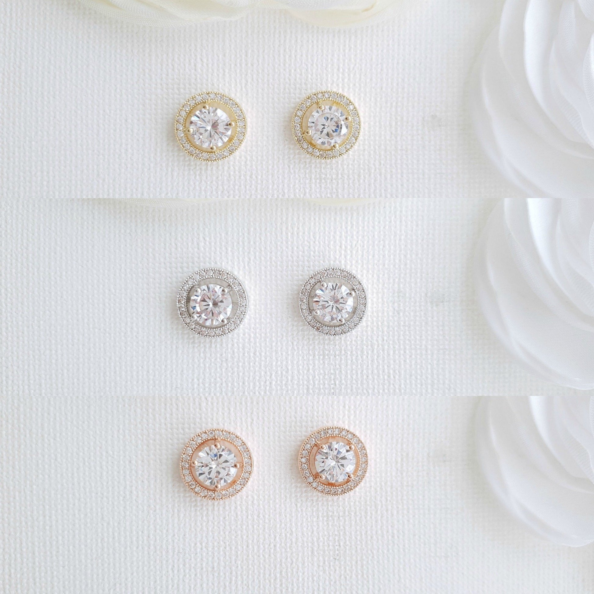 This simple and sparkling rose gold wedding day jewelry set is made with round stud earrings and round pendant necklace, which is beautiful for both brides and bridesmaids for their wedding day look.