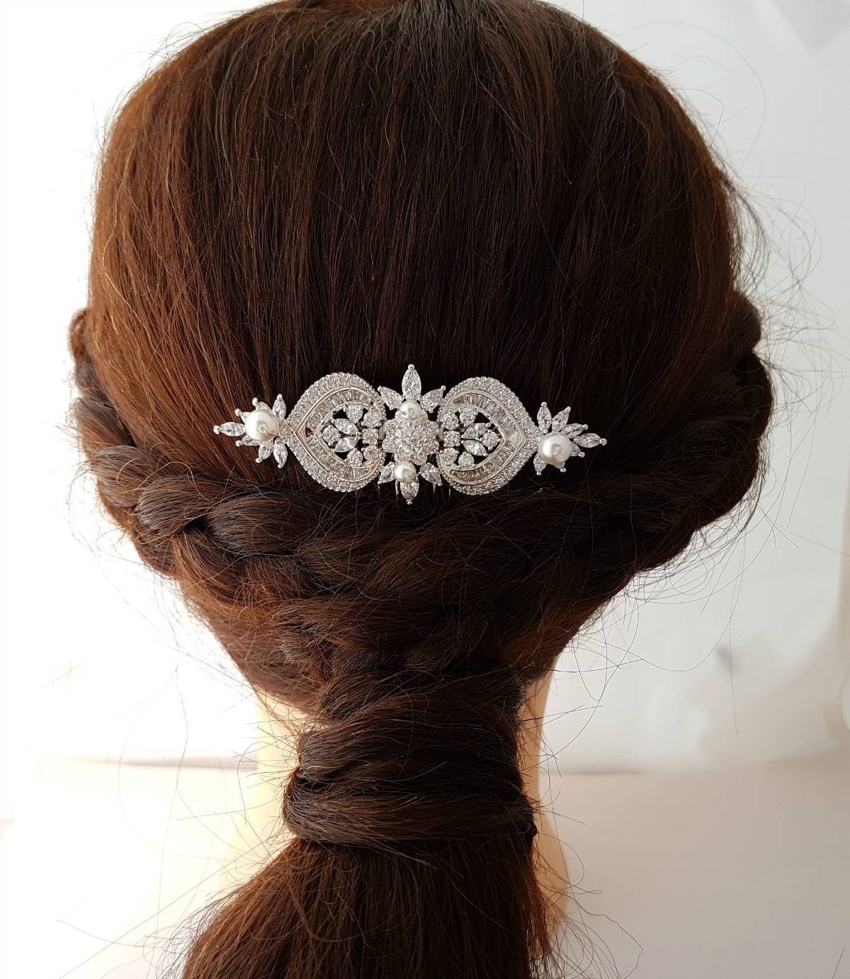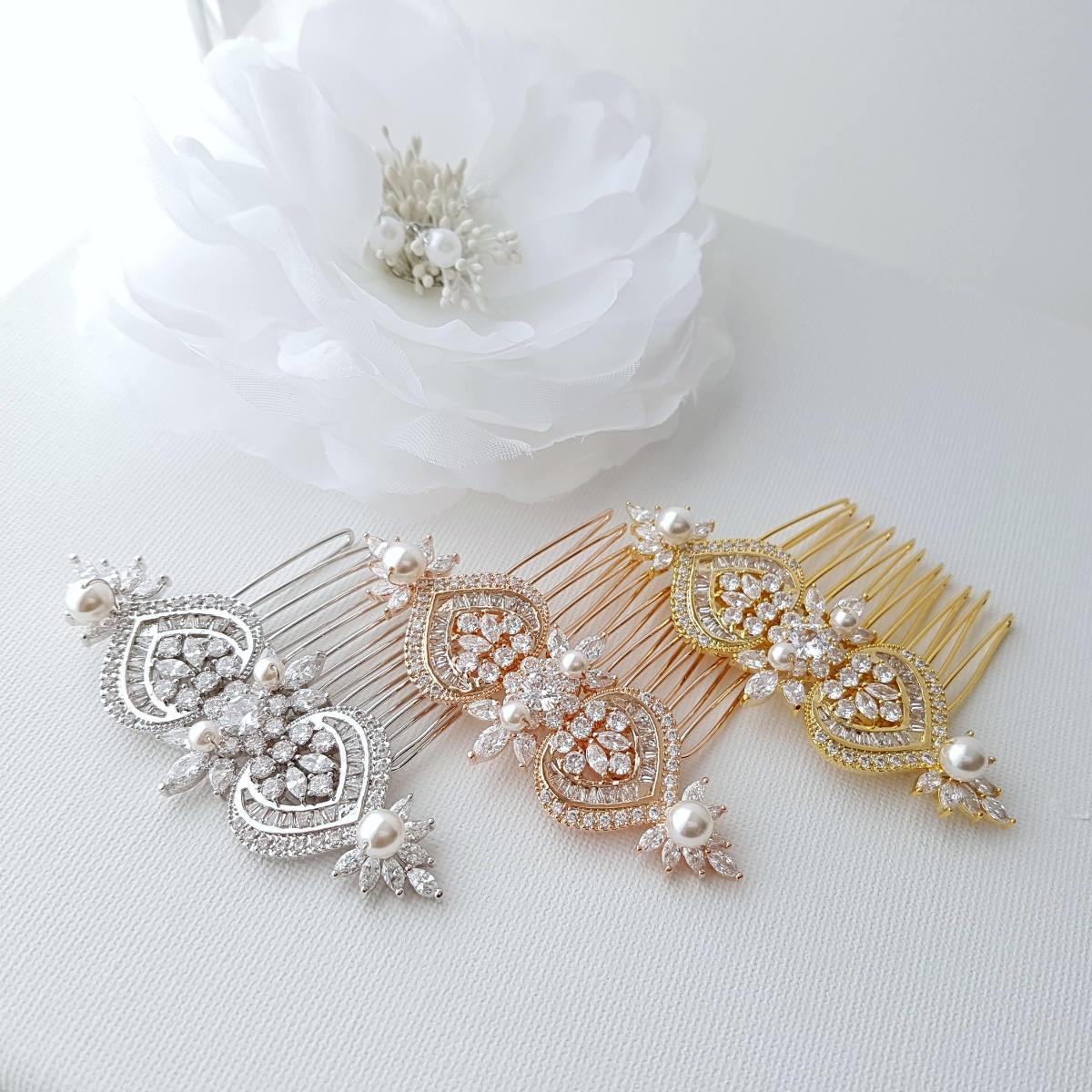 Gorgeous, glittering crystal bridal hair comb set with top quality cubic zirconia in marquis and teardrop shapes. I have accented it with pearls. Material used is rose gold plated brass.