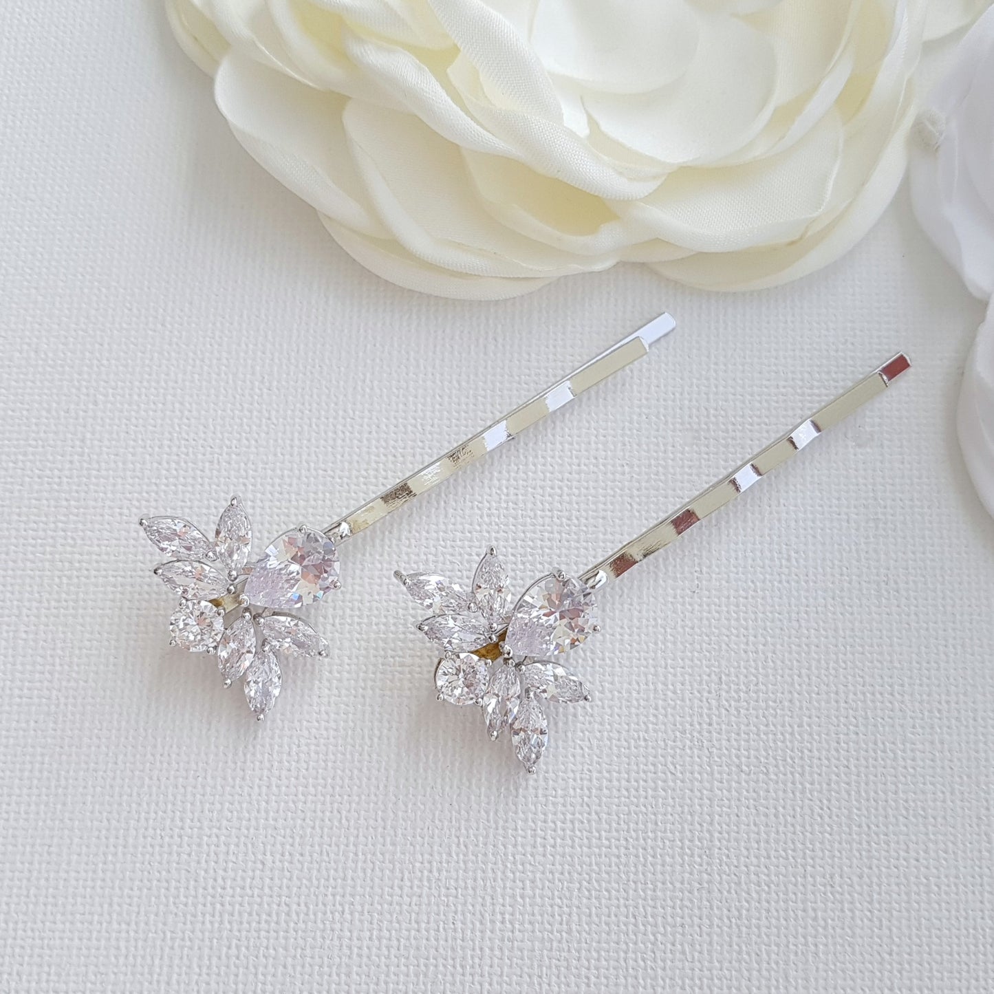 Beautiful and elegant, the Nicole rose gold wedding hair pins are a great bridal hair accessory. Made in the warm glow of rose gold and available embellished with a pearl in white/ light ivory or cream pearls. The bobby pins are available in a silver/ rhodium finish, rose gold finish and 14k gold finish.