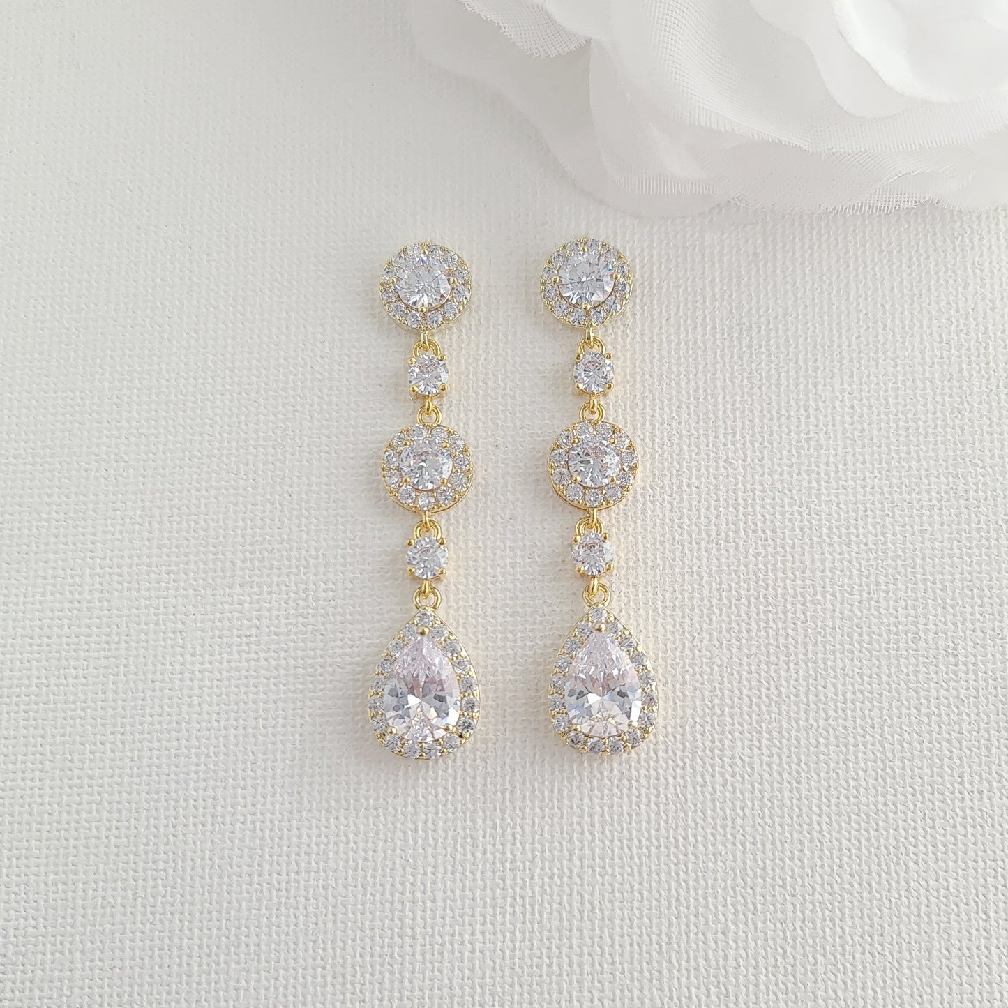 This long bridal earring with a long drop pendant necklace is made of round and teardrop shapes, the material used is multi-faceted cubic zirconia. They are available in three finishes, choose gold, silver, or rose gold colors.