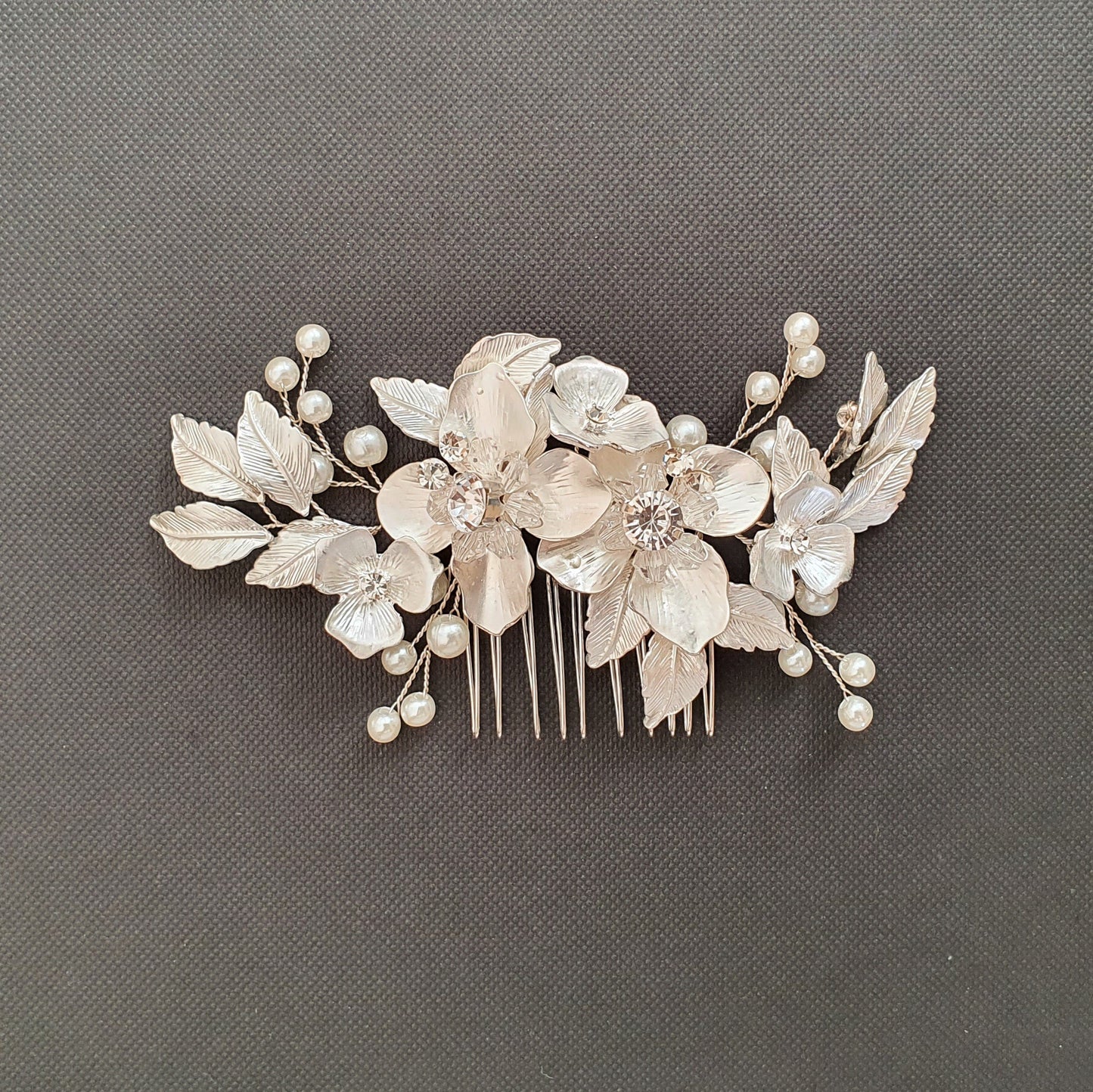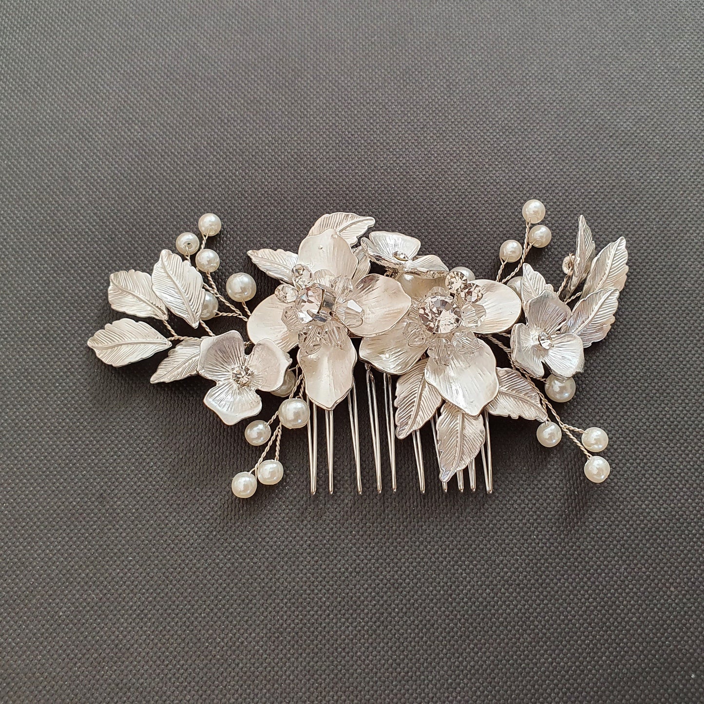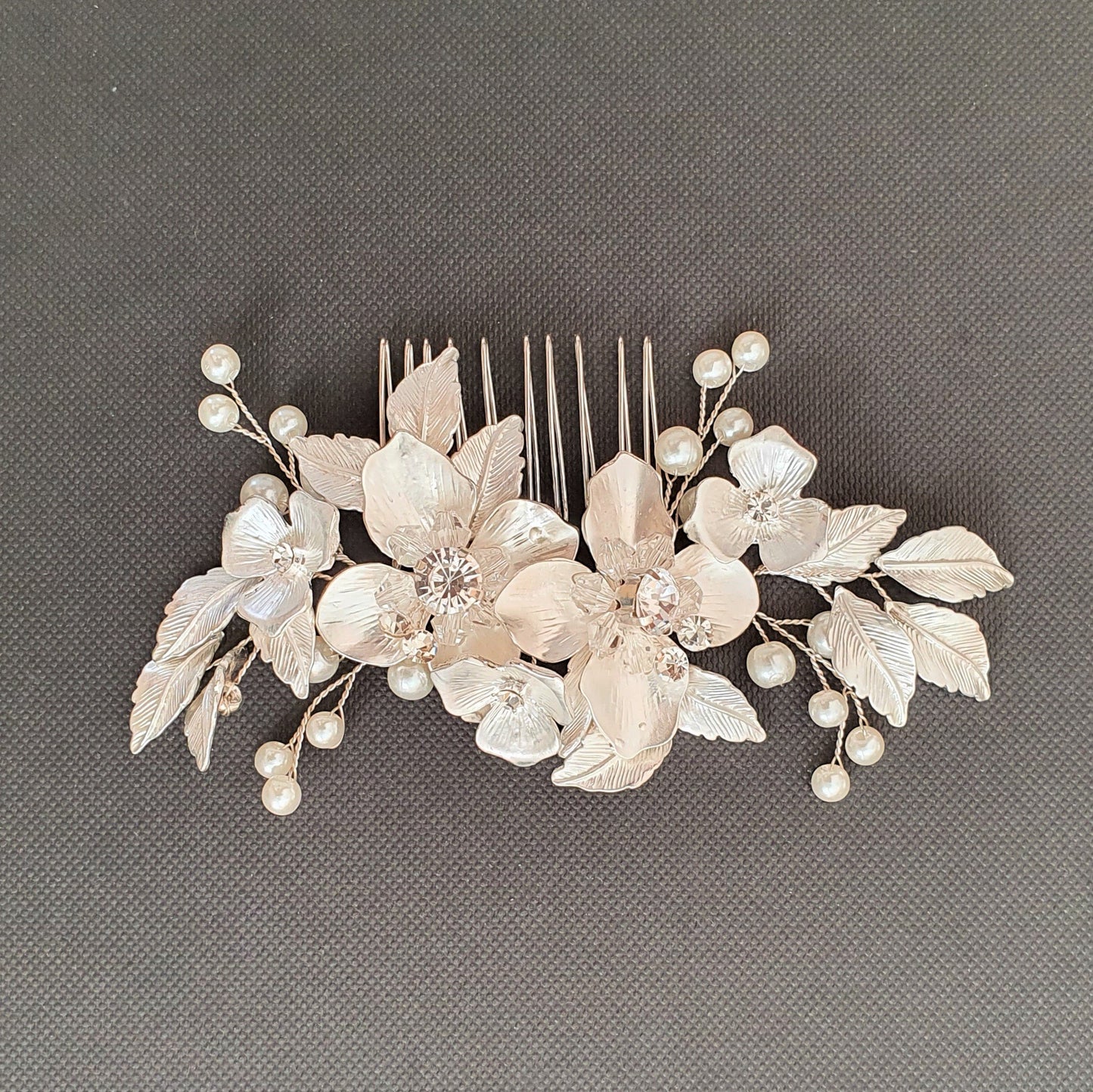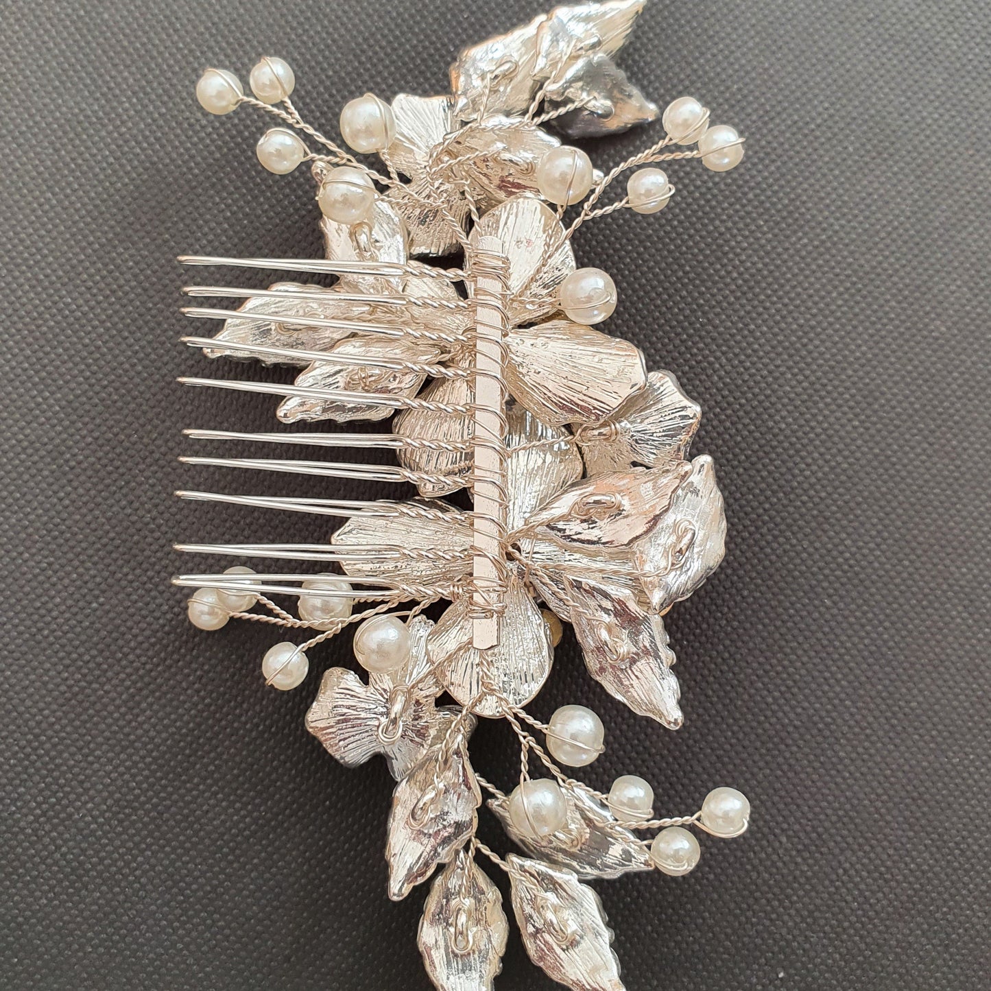 Silver Hair Comb for Brides in Flower and Leaf Design