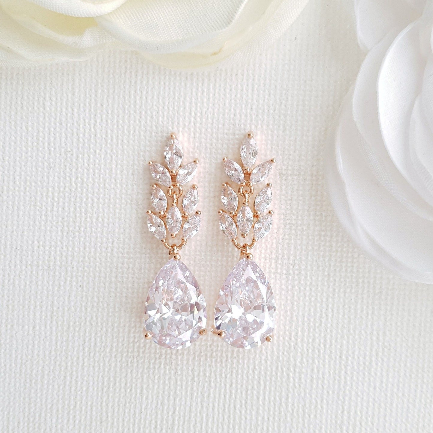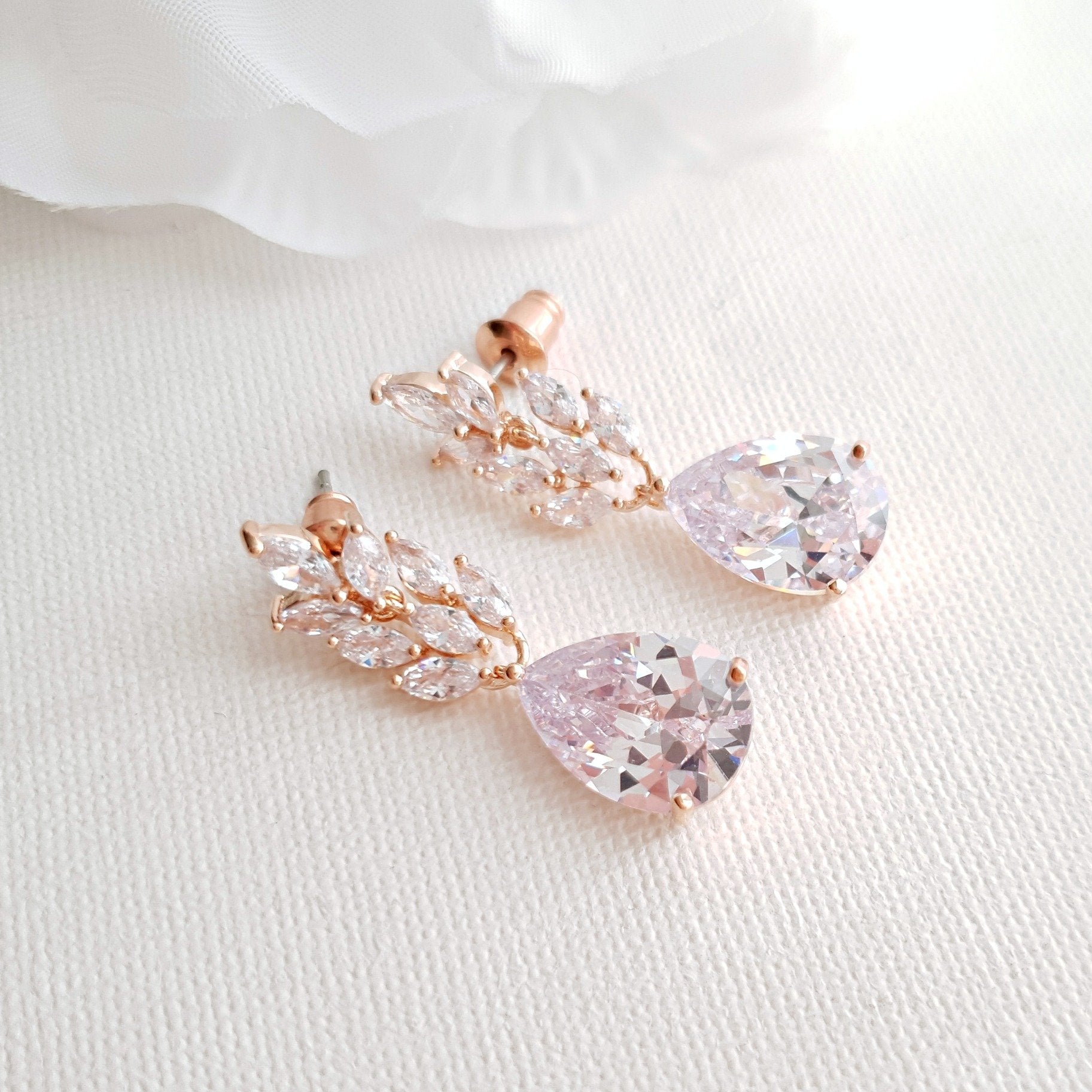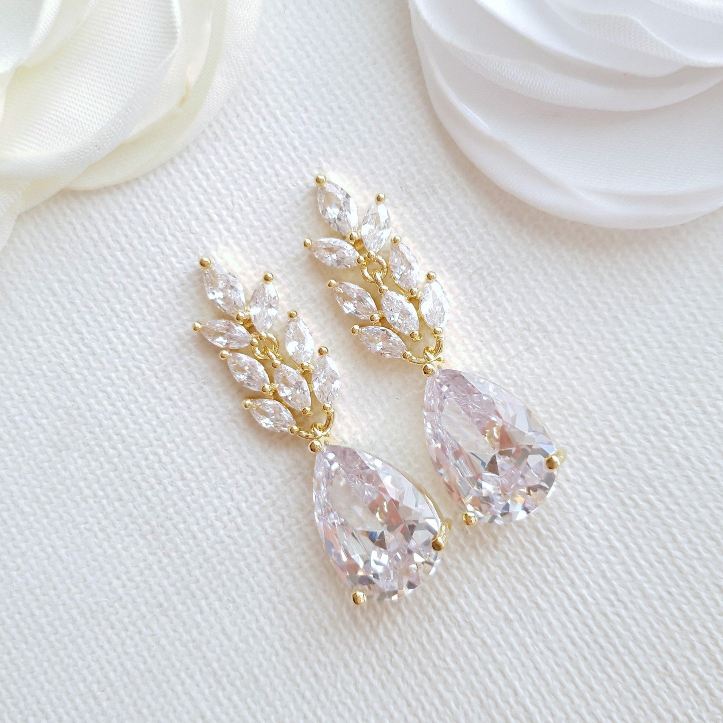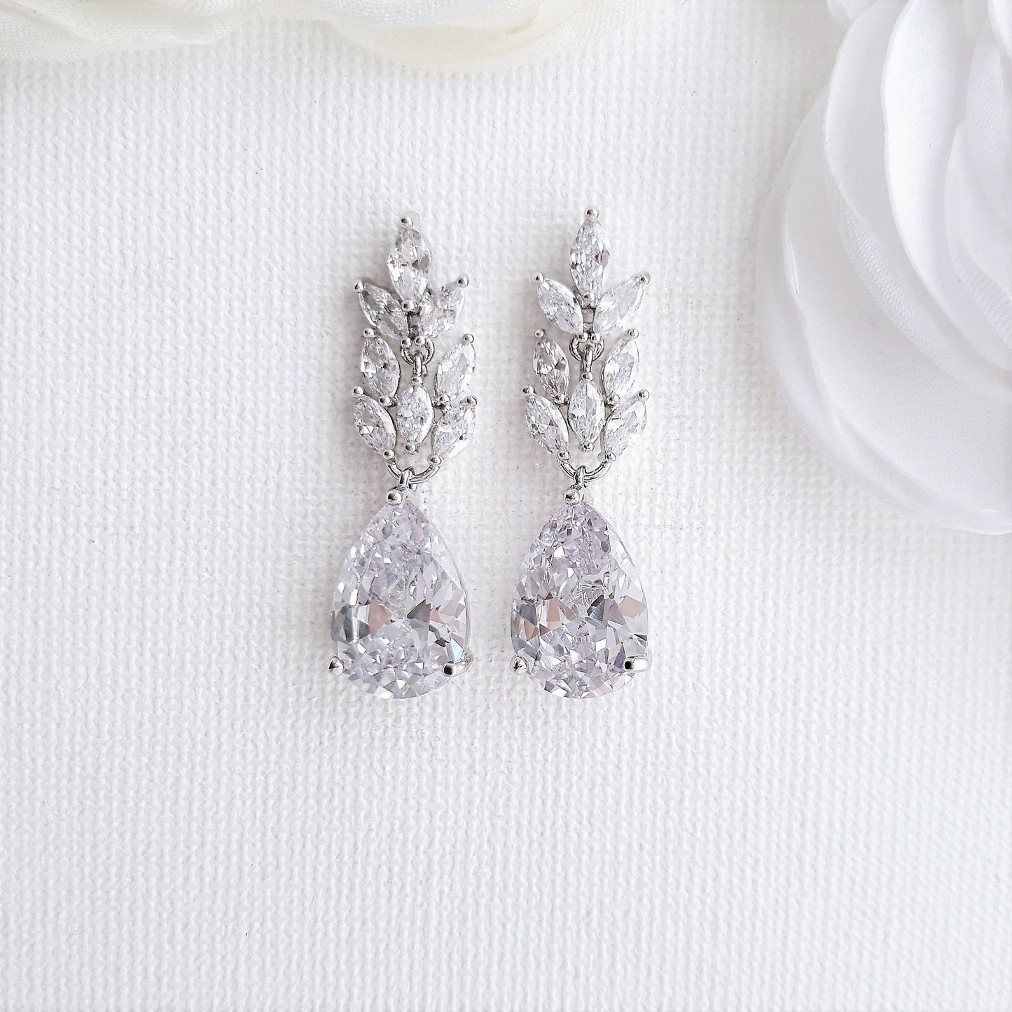 Silver CZ Crystal Drop Leaf Earrings for Weddings