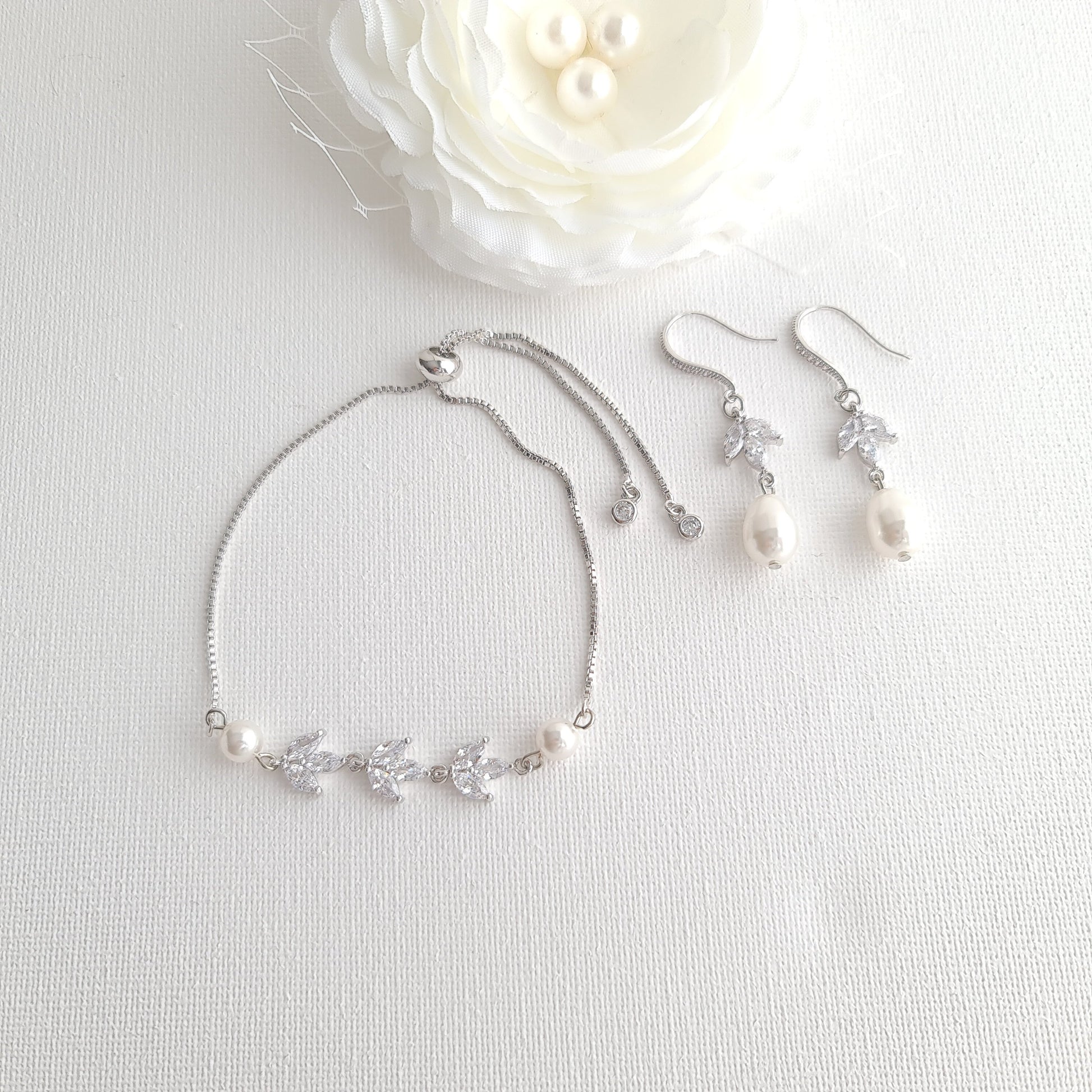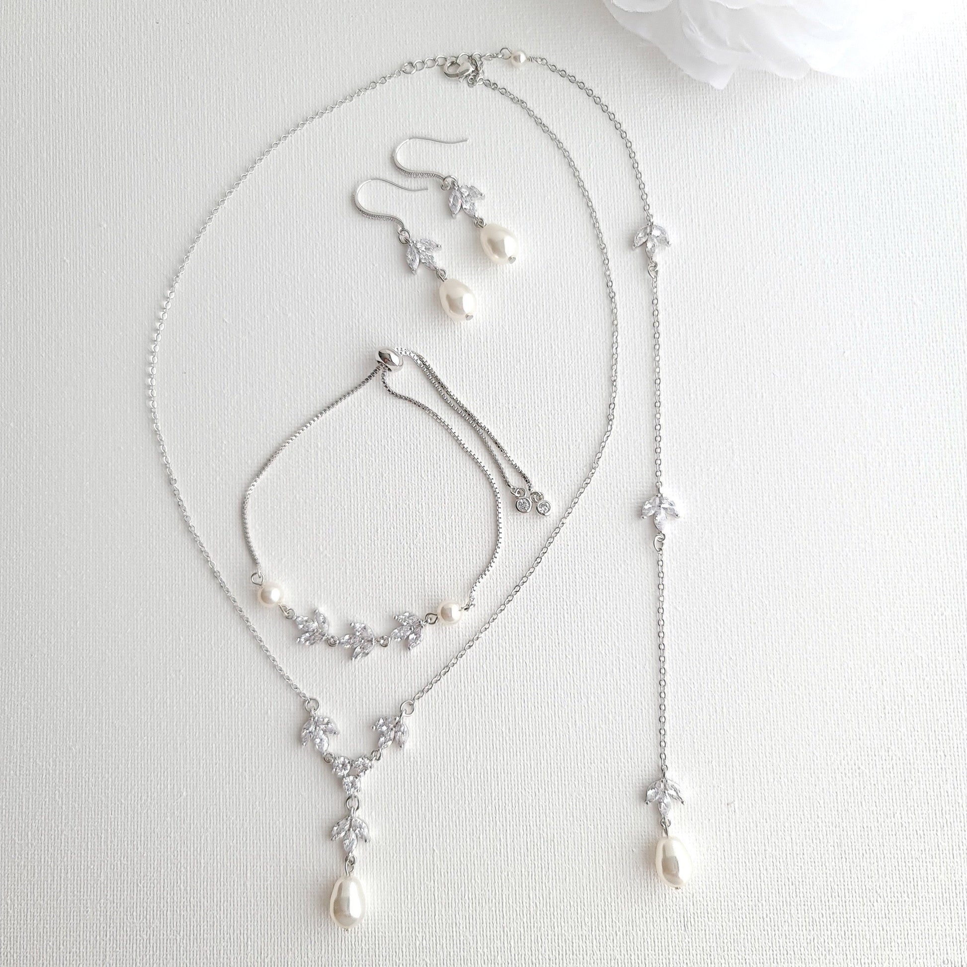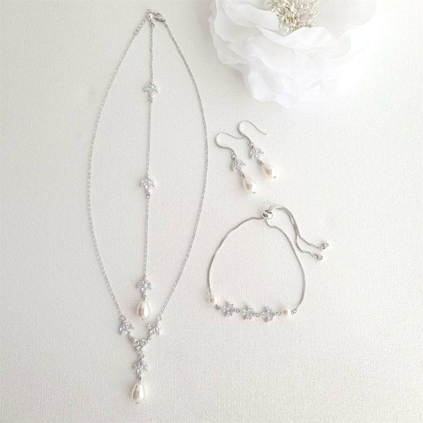 Simple Bridal Jewelry Set-3 Pcs- Silver & Pearl- Leila