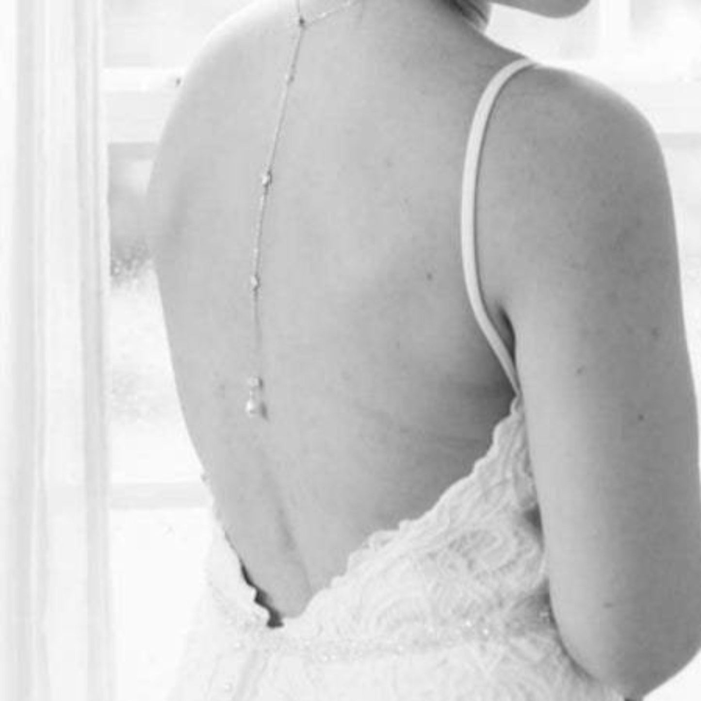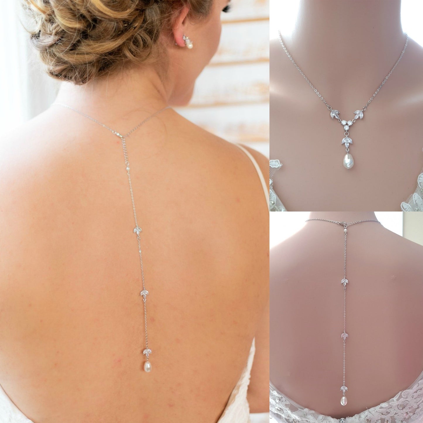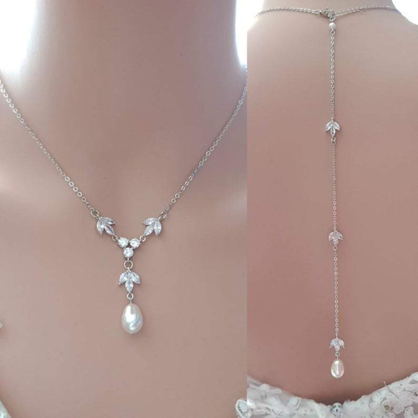 Necklace- Made of cubic zirconia and pearl drops, the necklace can be purchased with or without the backdrop. The length of the necklace is 17 inches and the backdrop is 8 1/2 inches. If you need the necklace without the backdrop, the necklace will have a 1.5-inch extension chain. If you don't need a backdrop contact us.
