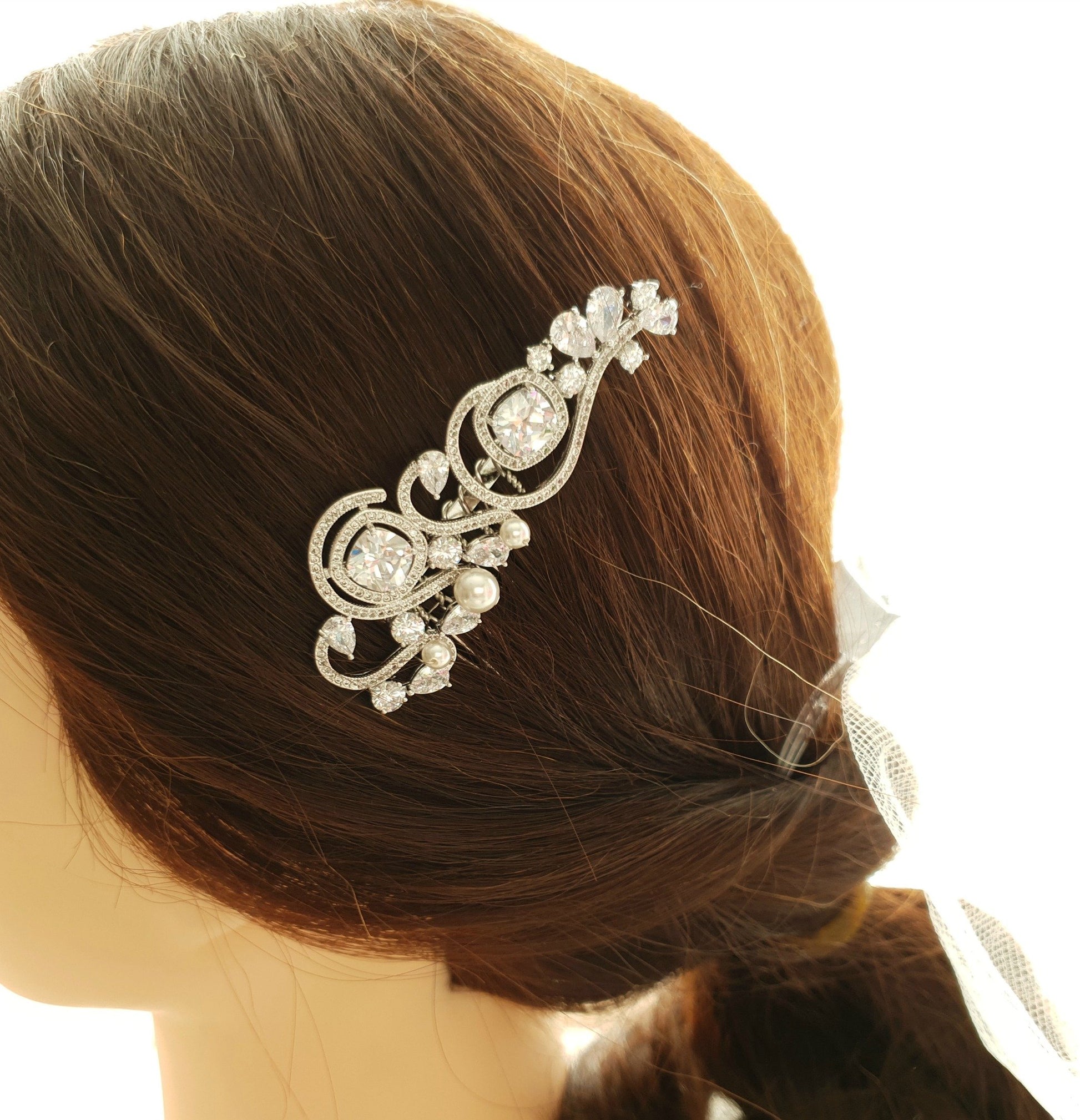 The hair comb is sparkly features swirly, round, teardrop, and square/ rhombus shapes, made of high-quality cubic zirconia. The hair comb is also available with an option to add pearls in the colors of cream or white and is available in silver, gold, and rose gold tones.