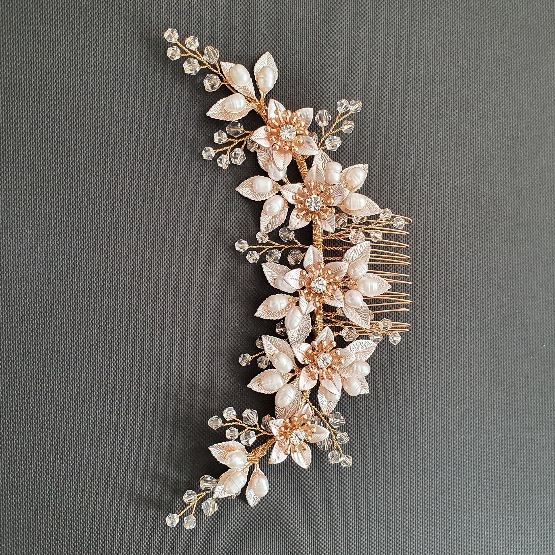 Statement Bridal Hair Comb With Gold leaves and Flowers-Liana