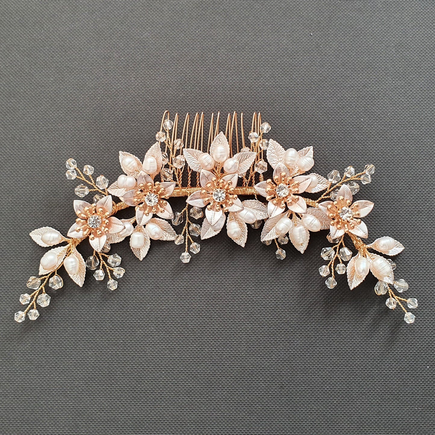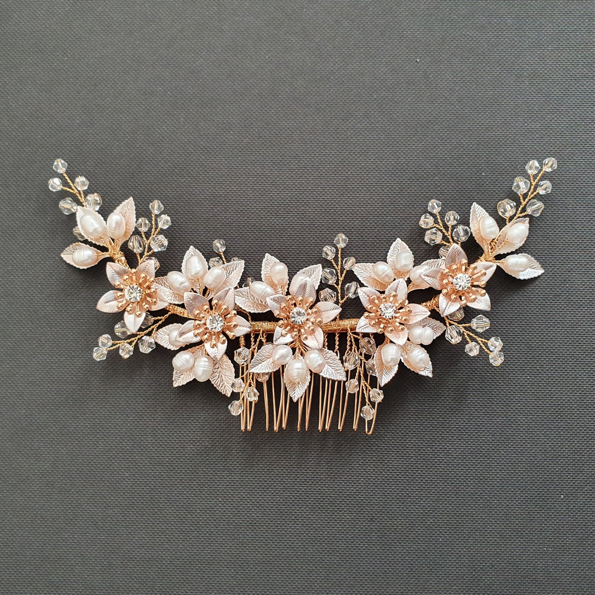 This gold leaves and flower hair comb is delicately crafted, the leaves are made of three leaflets and each of the leaves is wire twisted with a teardrop pearl.