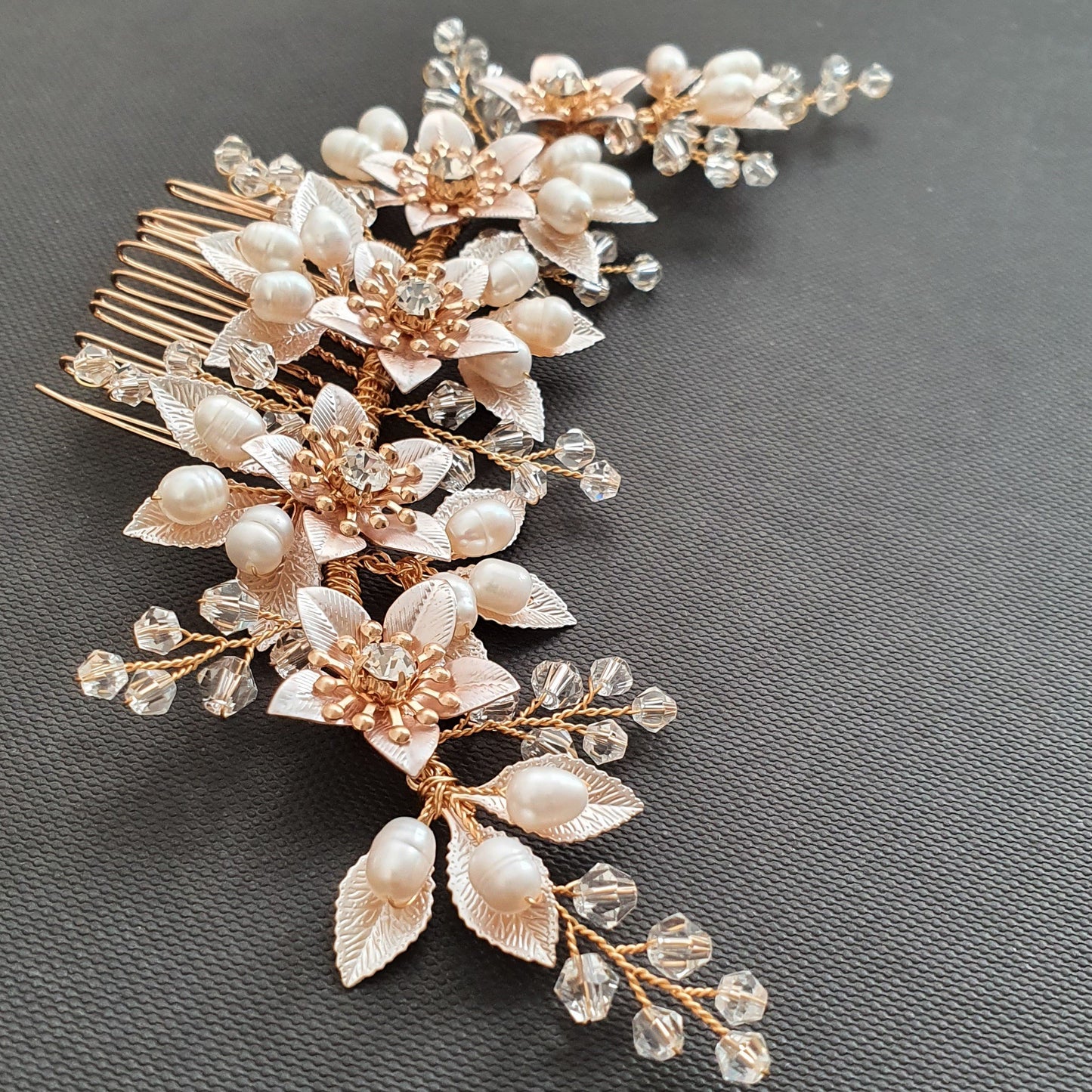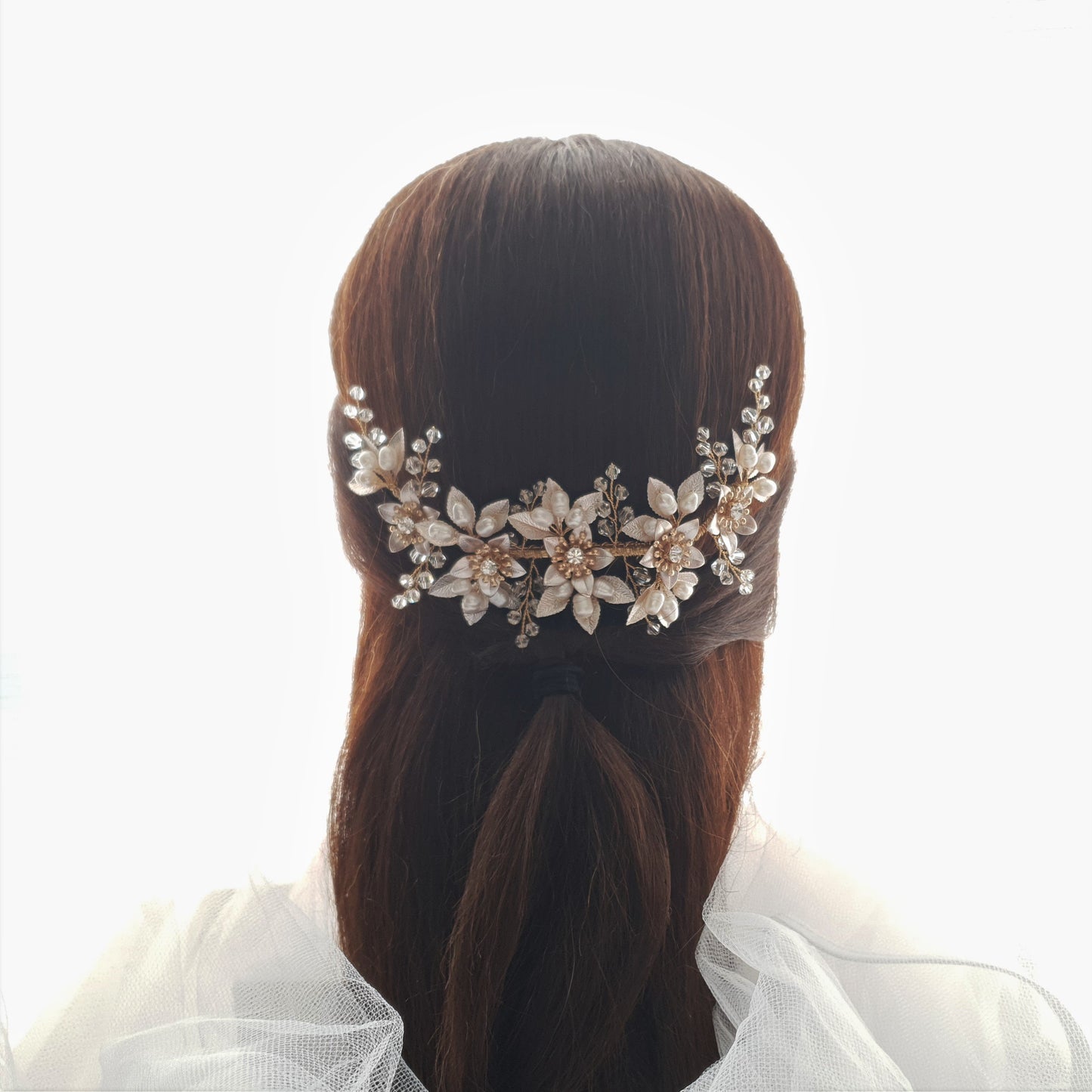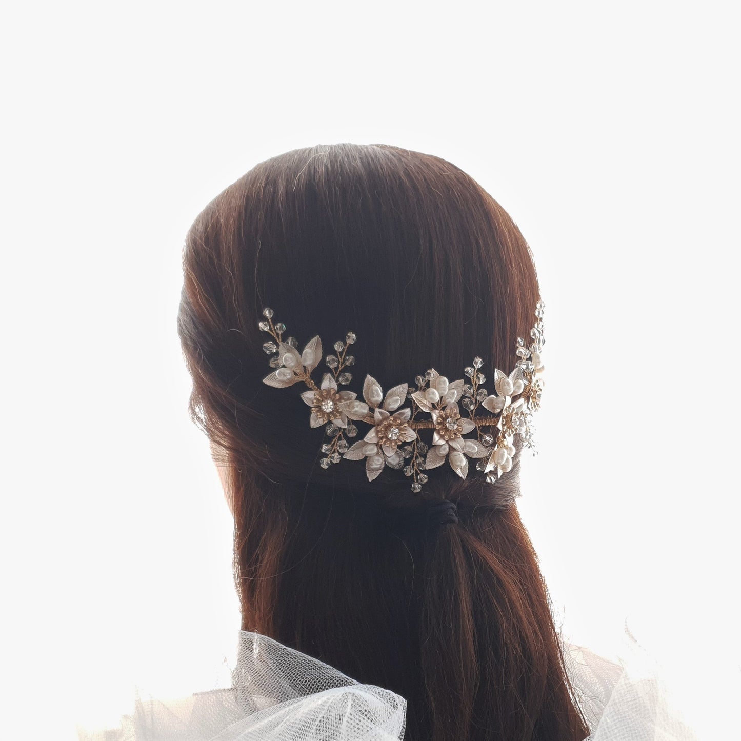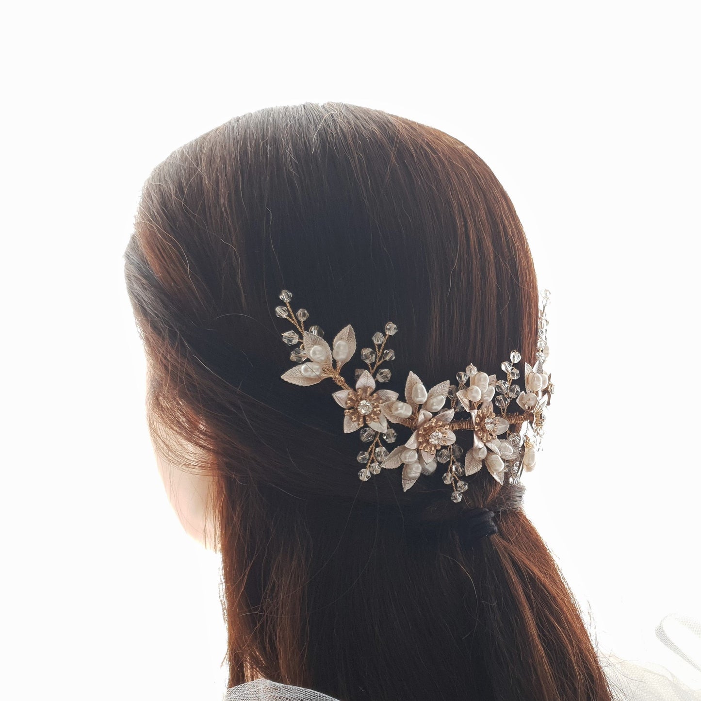 This is a beautiful statement bridal hair comb, A hairpiece is made with gold leaf, flower white pearls, and crystal beads. If you are looking for a statement hair accessory in gold this is a great choice.