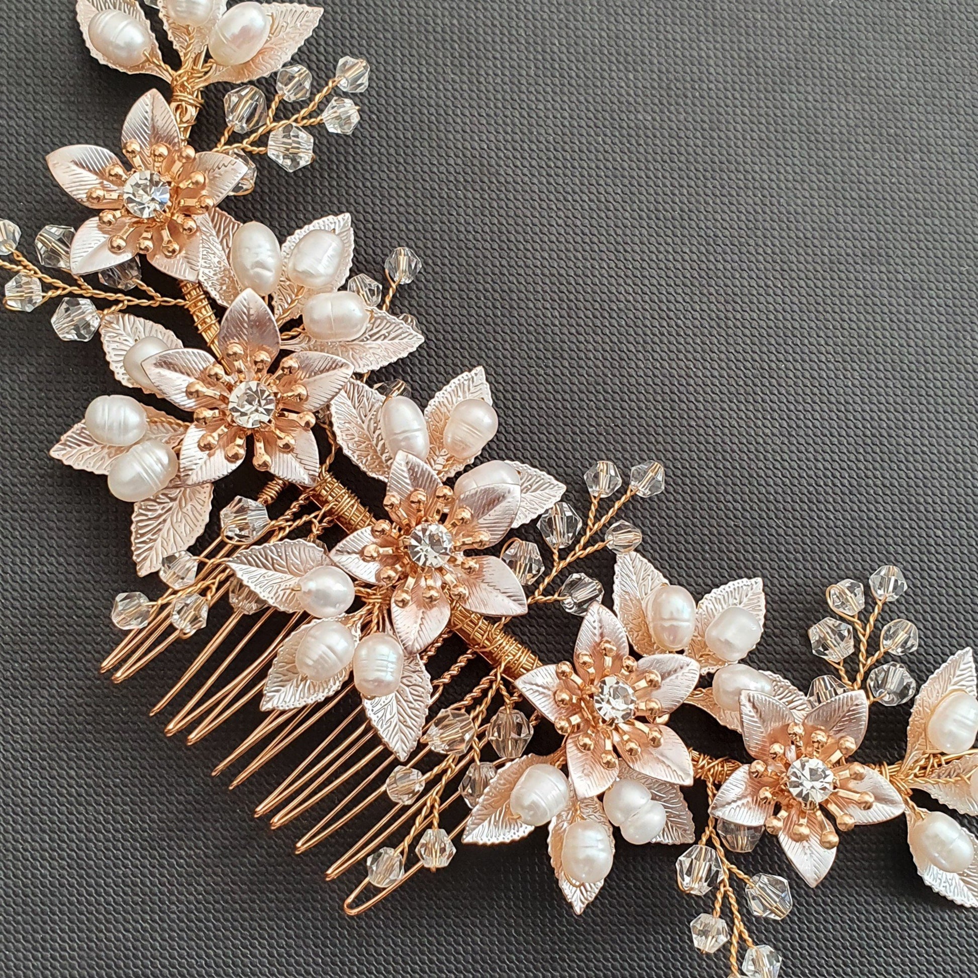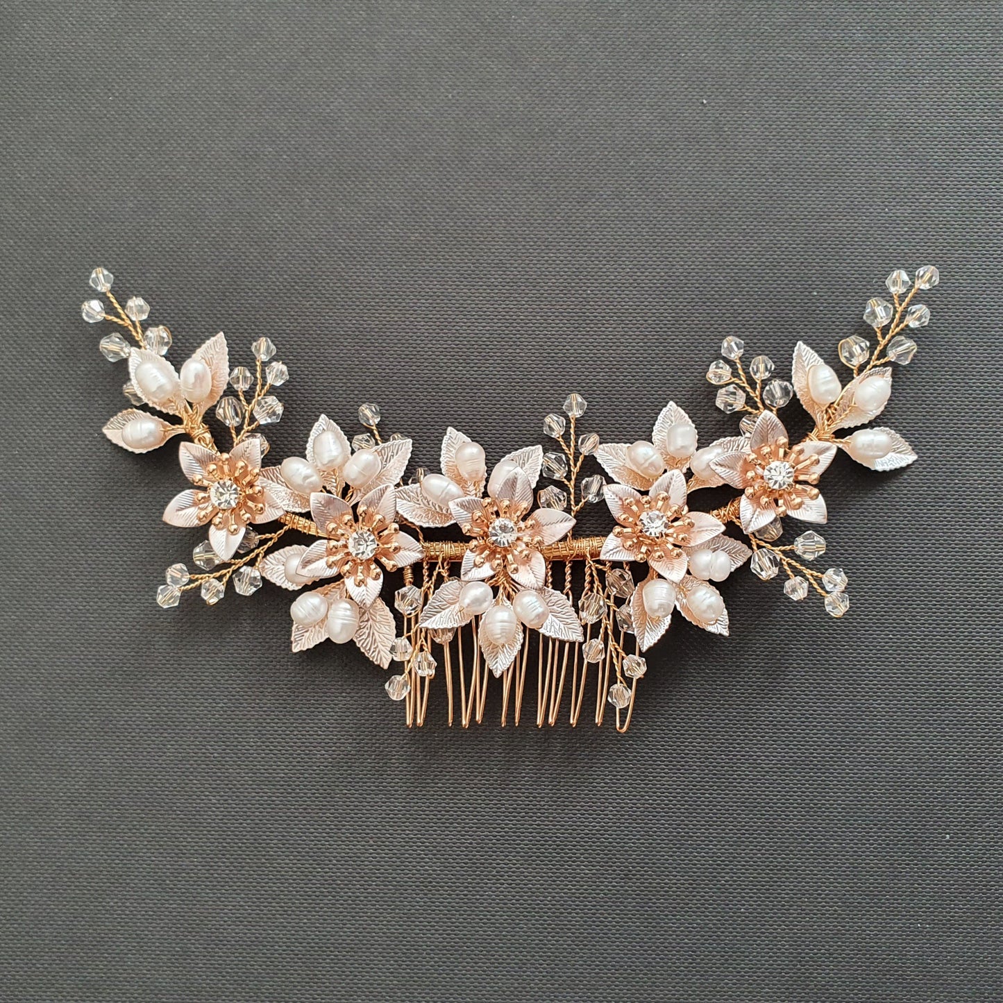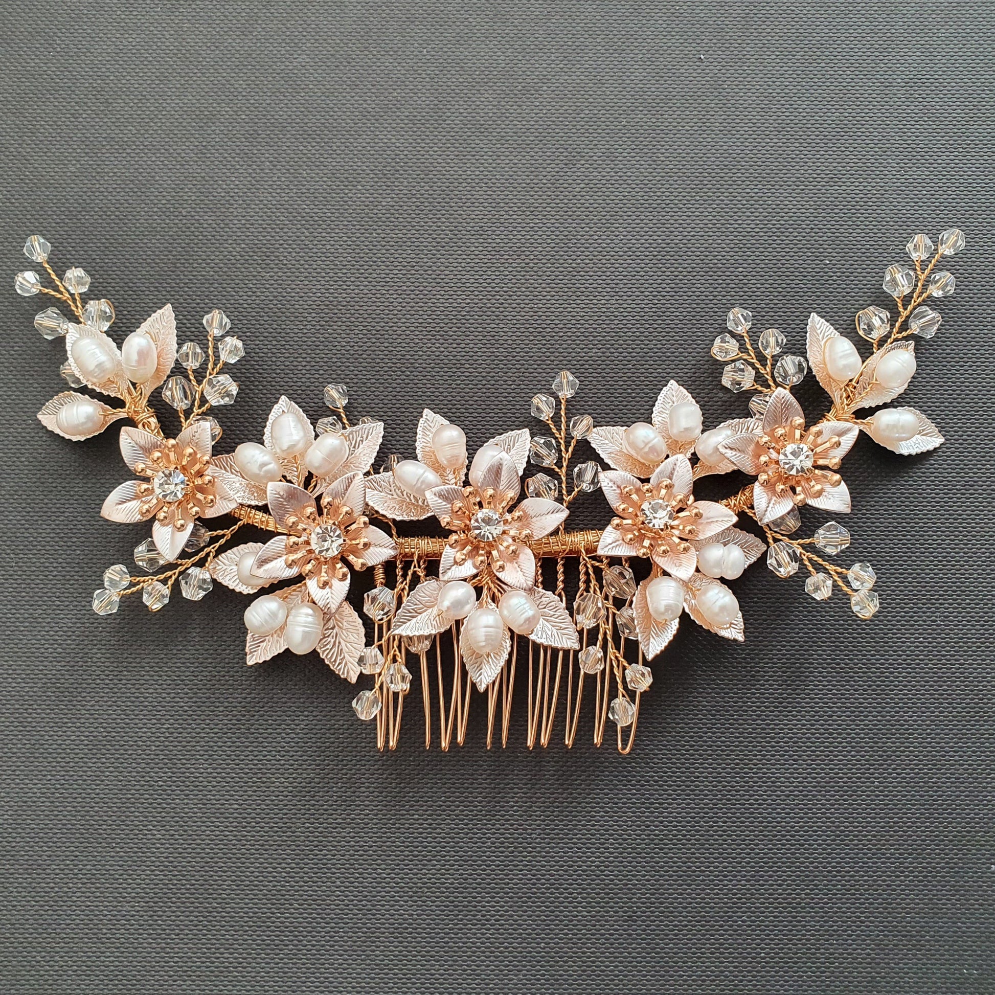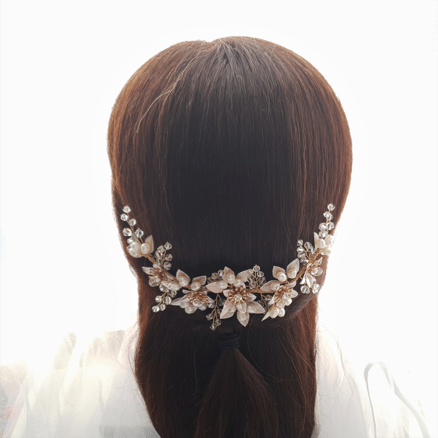 This is a beautiful statement bridal hair comb, A hairpiece is made with gold leaf, flower white pearls, and crystal beads. If you are looking for a statement hair accessory in gold this is a great choice.