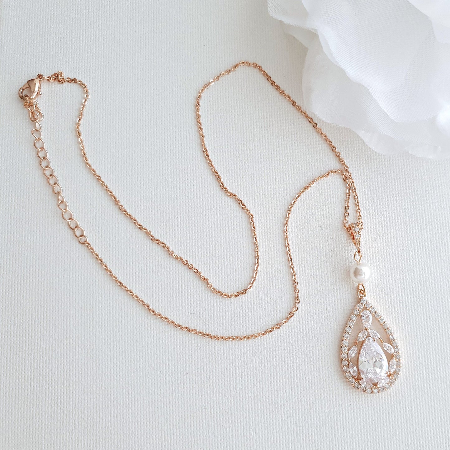 This teardrop cubic zirconia pendant necklace is made in 14K gold plating for brides and weddings. It is simple yet elegant and adds plenty of sparkle with bridal and bridesmaids dresses and neckline.