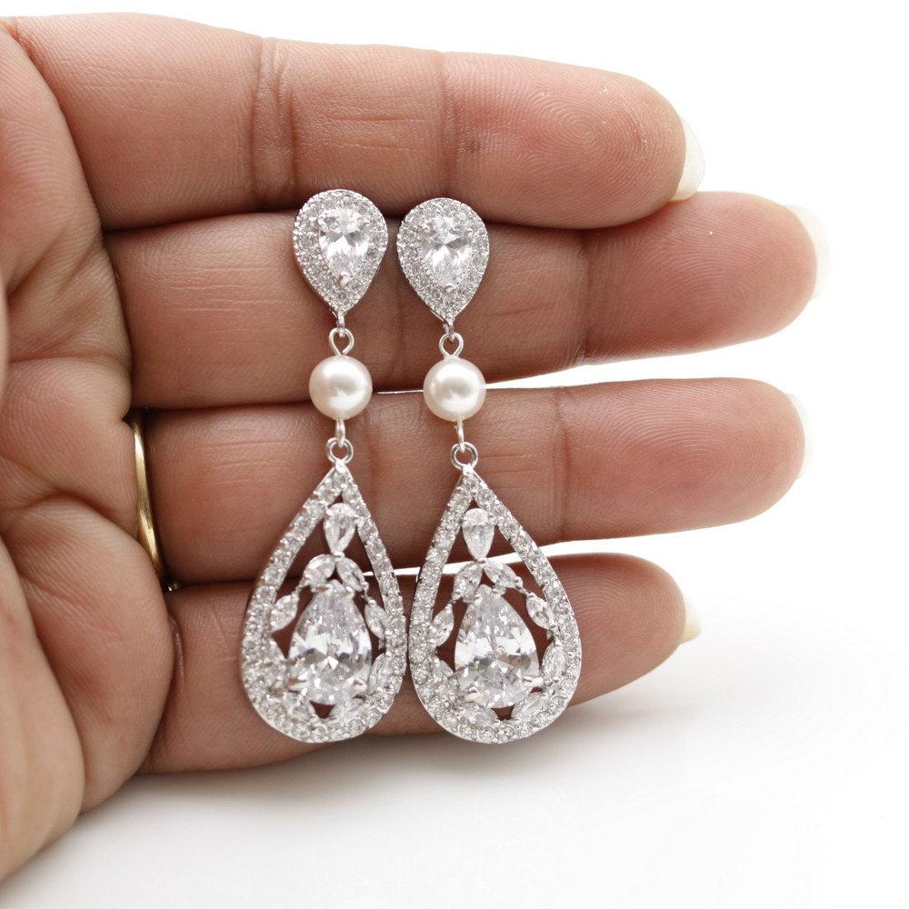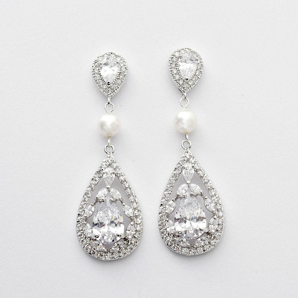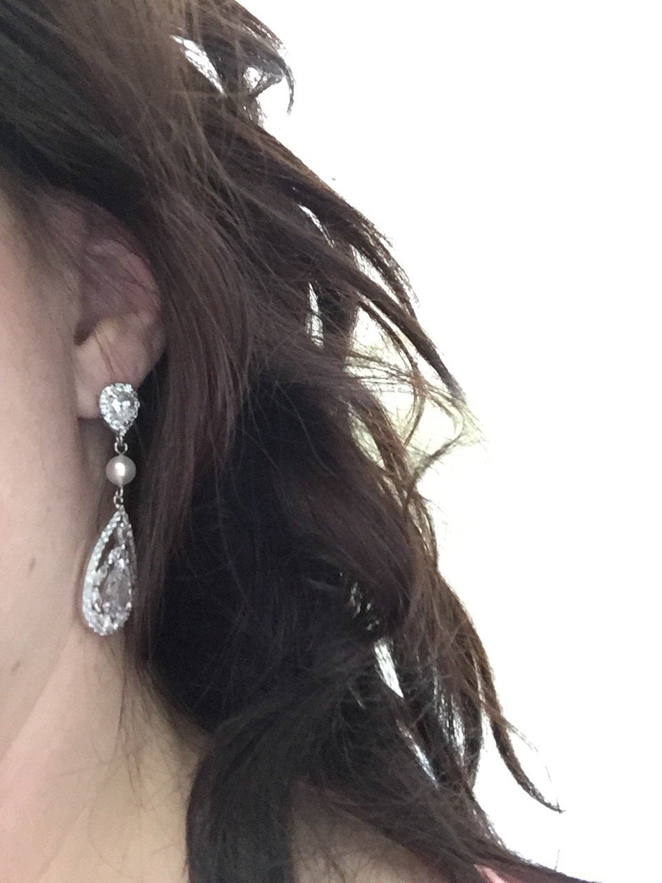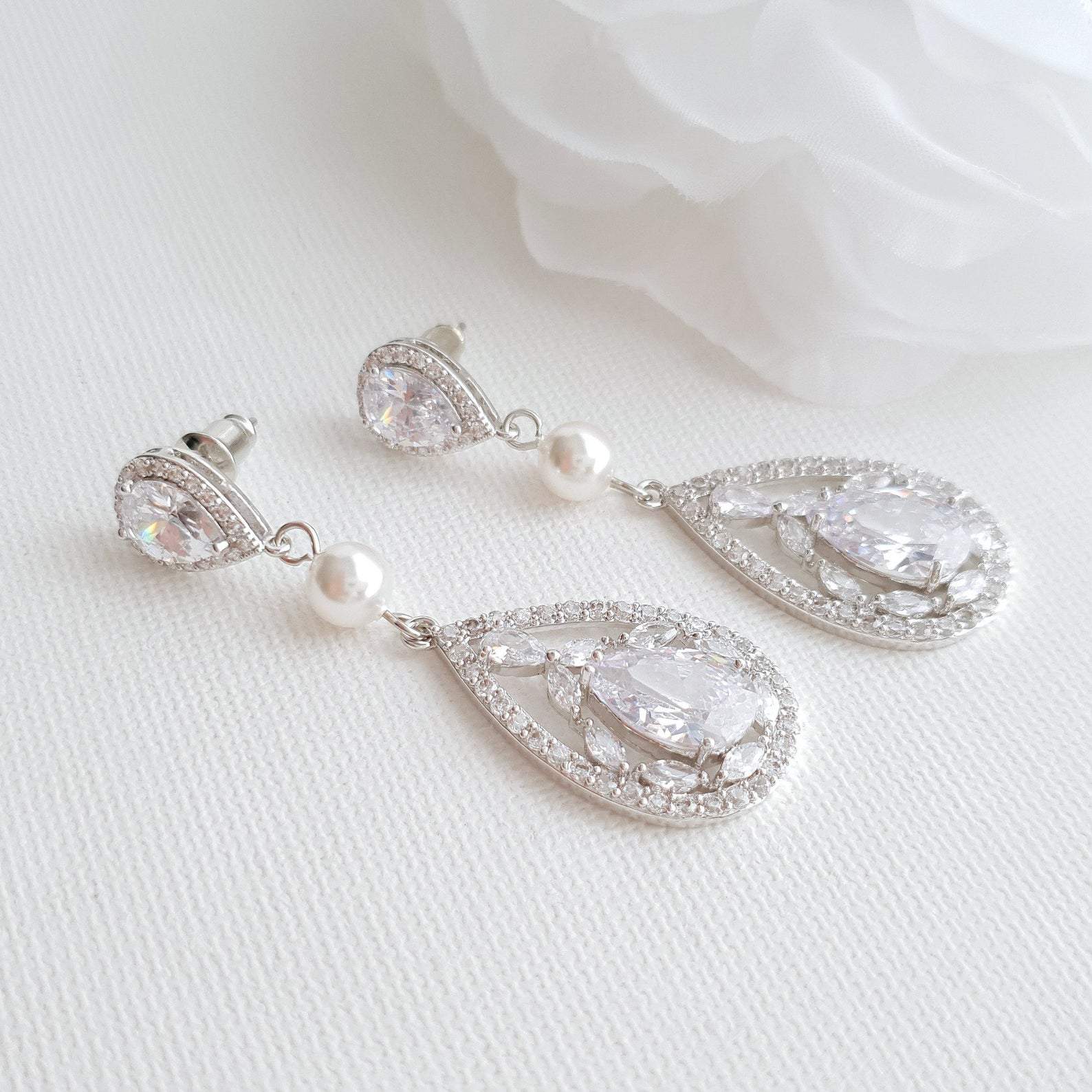 These Esther teardrop wedding earrings are for a complete and stylish bridal look. These Pearl and crystal teardrop earrings are made with pearls with an option to choose cream or white pearls and clear cubic zirconia that¢¬ž¢s sparkles. This crystal teardrop earring design features a beautiful bride dressed in a gown making very special and specific teardrop earrings for brides.