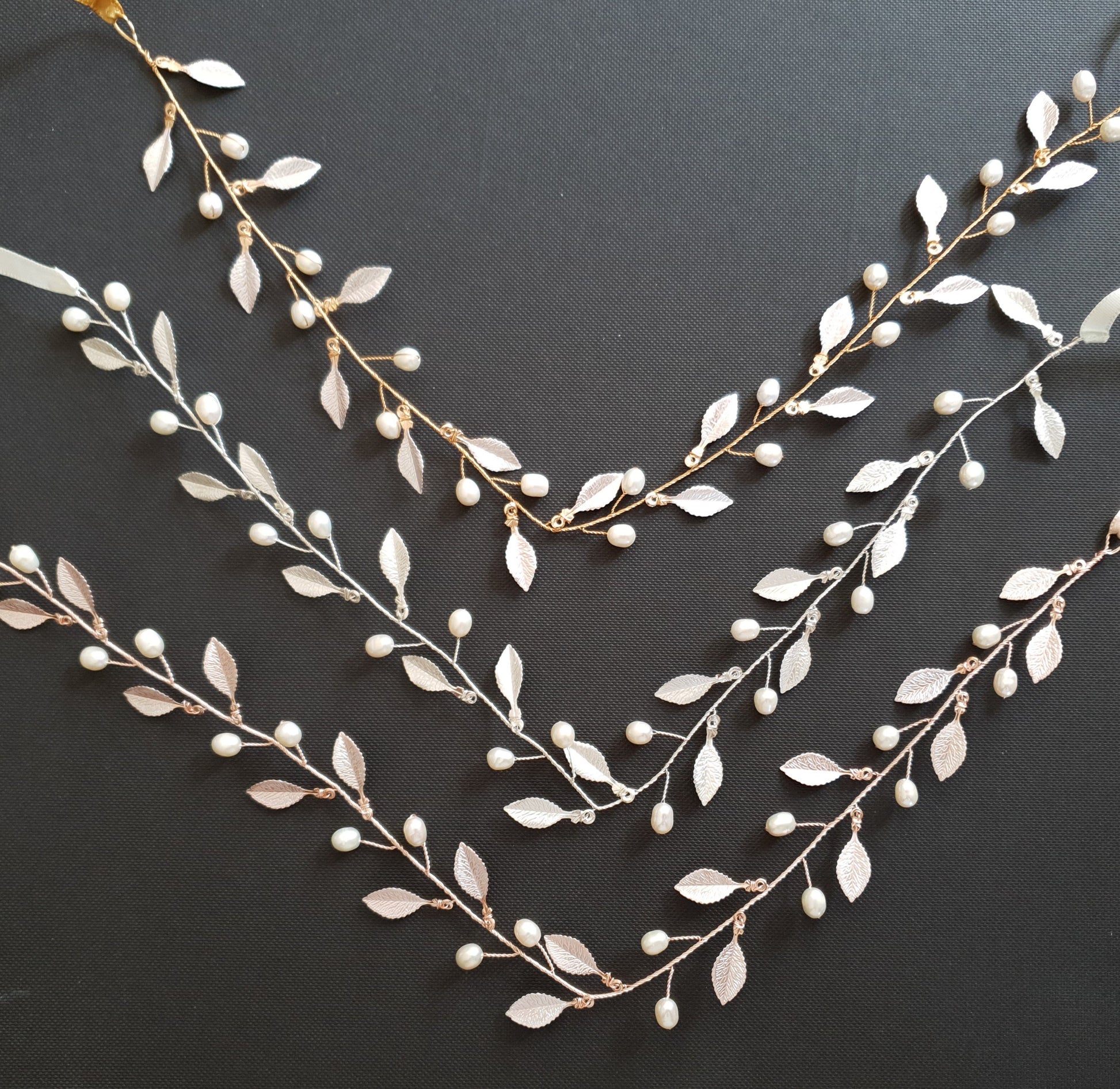 This bridal headpiece with tiny gold leaf and pearls is very pretty. If you are looking for a simple and delicate headband or headpiece, here is a dainty gold headband with small white pearls and gold leaves. This vine headband is made with tiny rose gold leaves with alternating pearls.