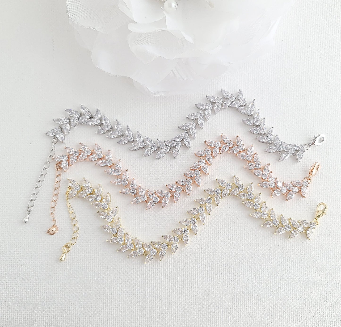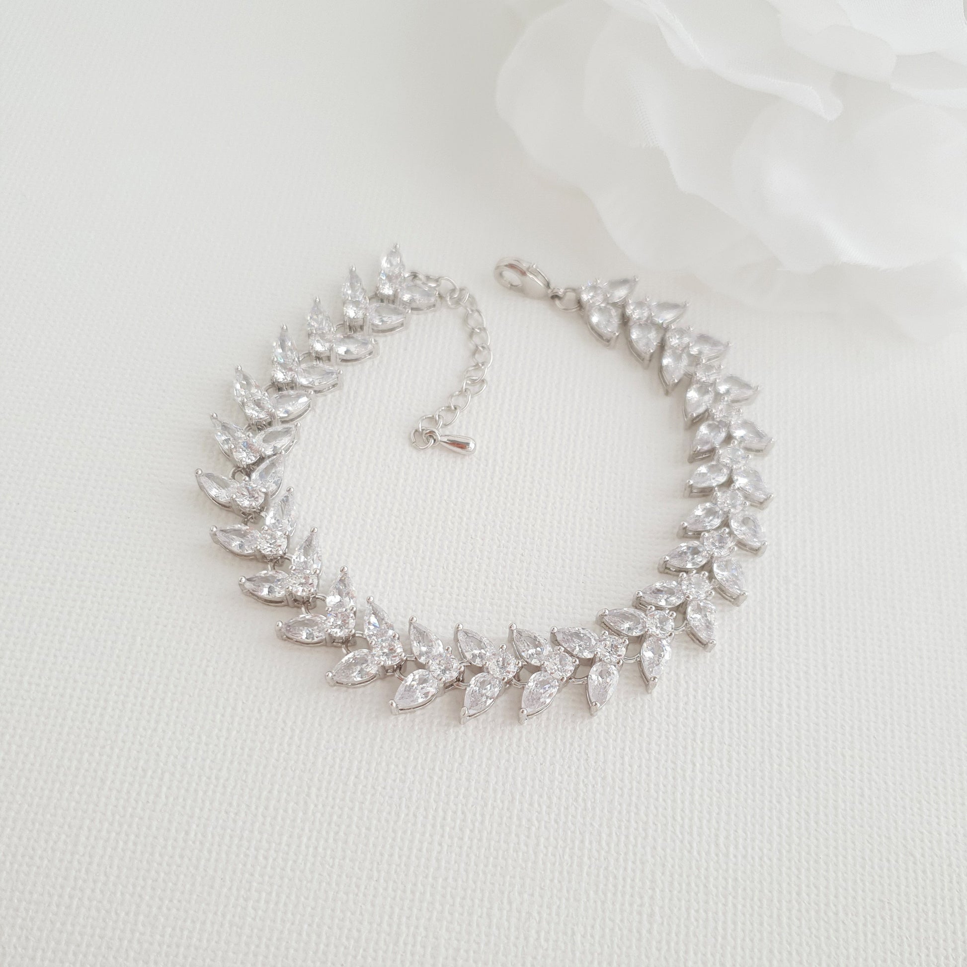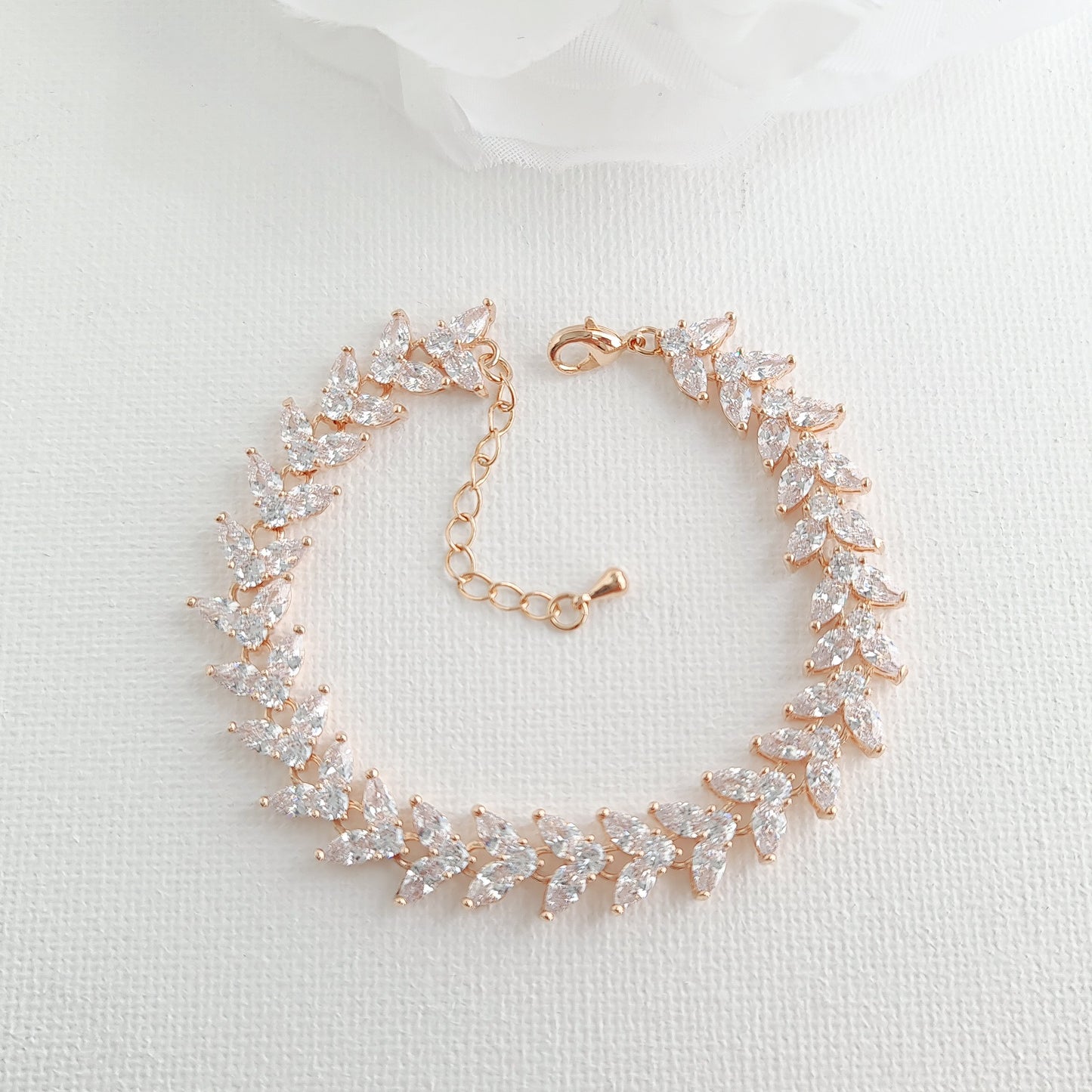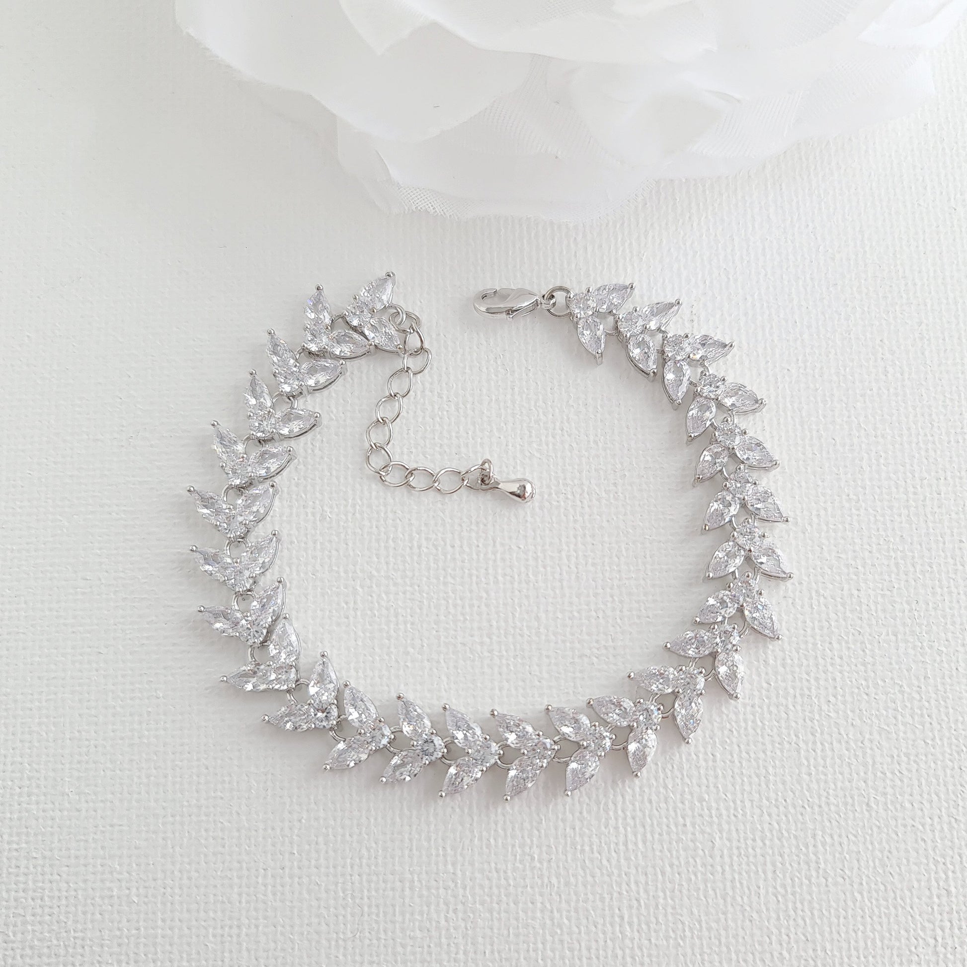 This marquise wedding bracelet has a beautiful fall to it and drapes effortlessly on your wrist. The leafy design is versatile and matches with the Katie wedding jewelry collection.