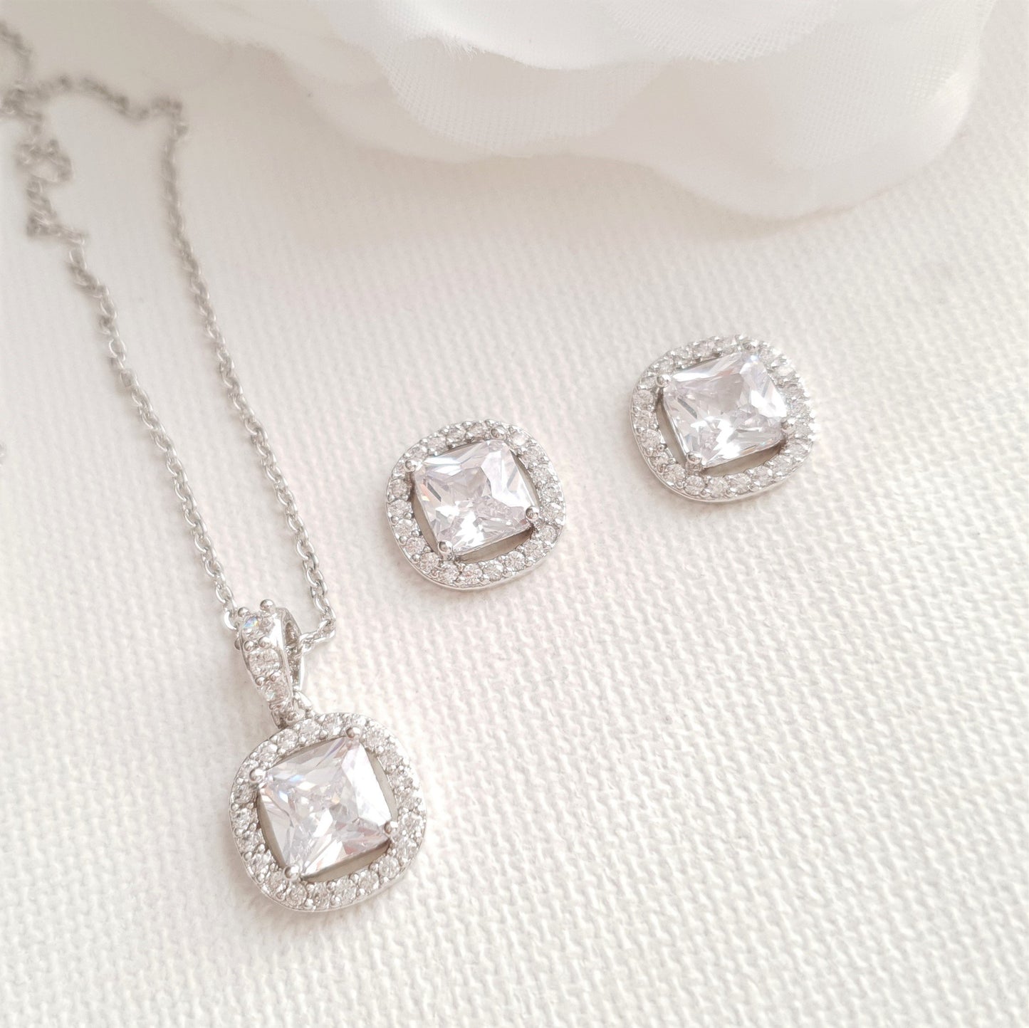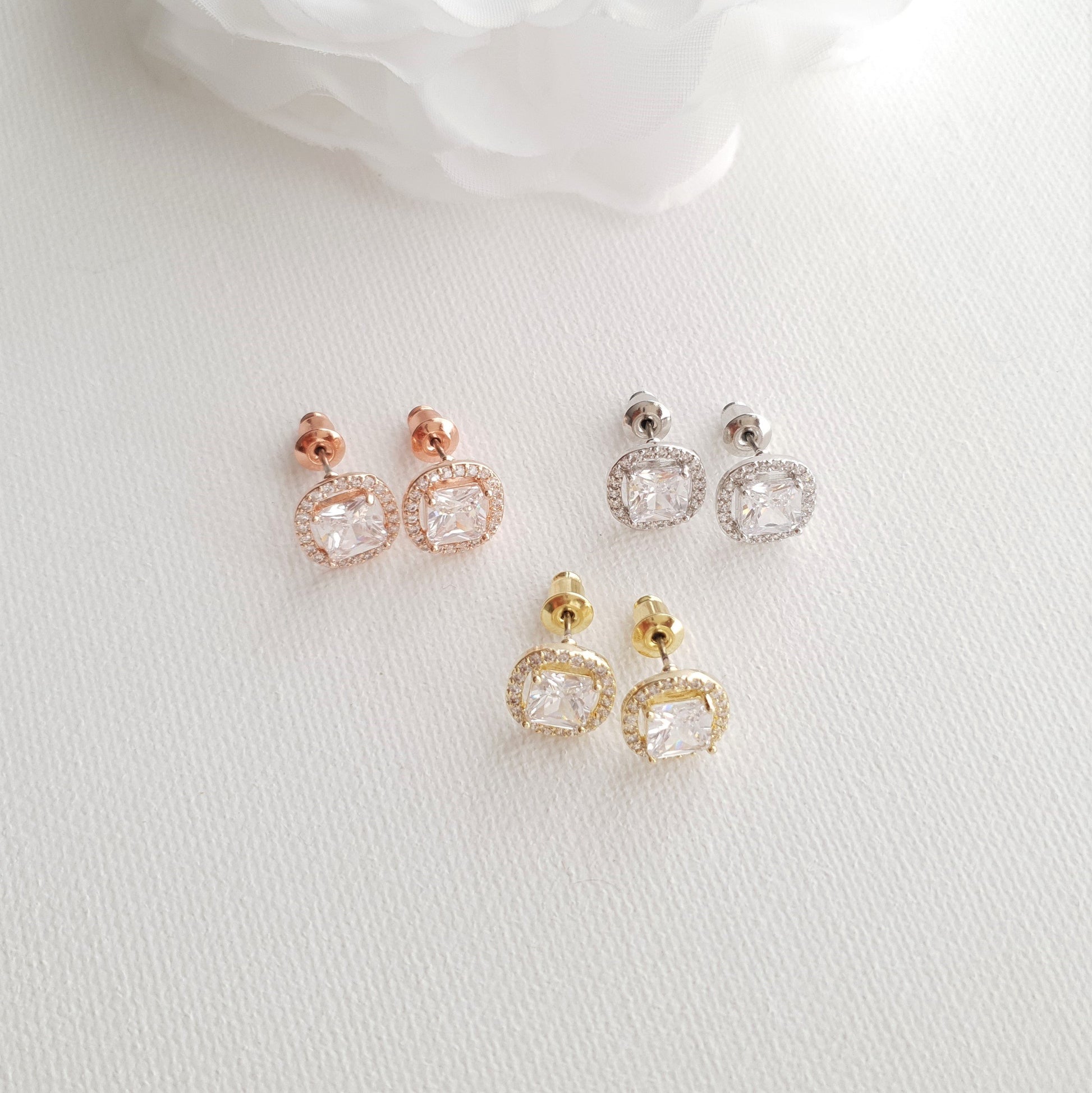 Earrings- The earrings are round stud earrings featuring a square cushion cut CZ stone in the middle. The stud earrings are comfortable and the ear pins are made of stainless steel.