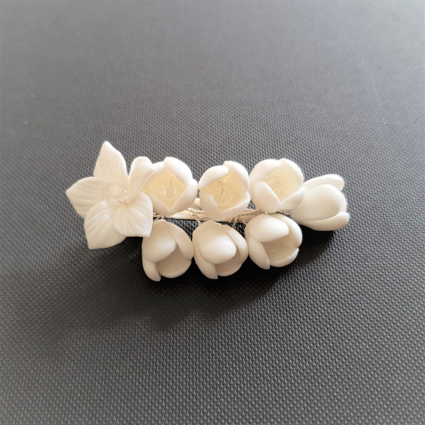 The flowers on the hair clip are made of porcelain material, the white flower barrette looks gorgeous with tiny clear crystal bead that is wire wrapped in the middle of every flower. The hair clip/barrette flowers are wire wrapped and twisted on the clip with silver wire.